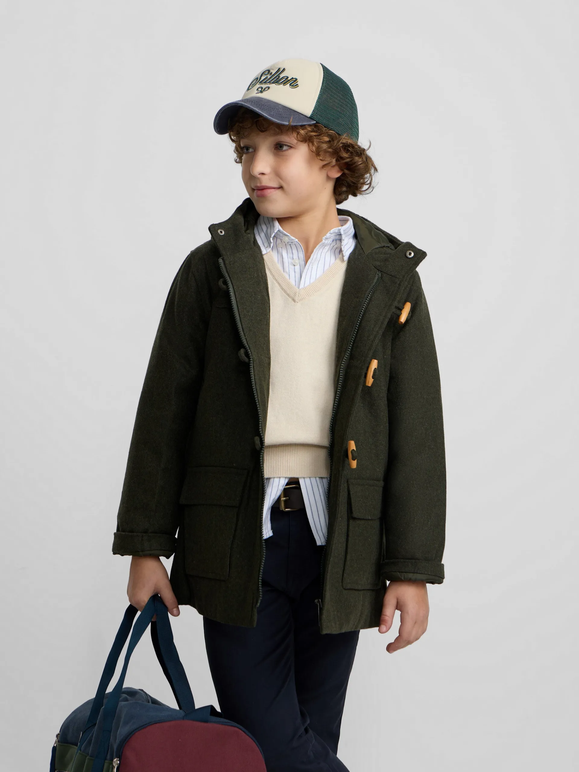 Abrigo de kids clásico color verde de corte recto. Presenta bolsillos delanteros tipo parche con tapeta y cuello clásico con capucha. Cuenta con cierre frontal de cremallera metálica y botones de refuerzo. Contiene raquetas bordadas a contraste en color azul marino en el torso.