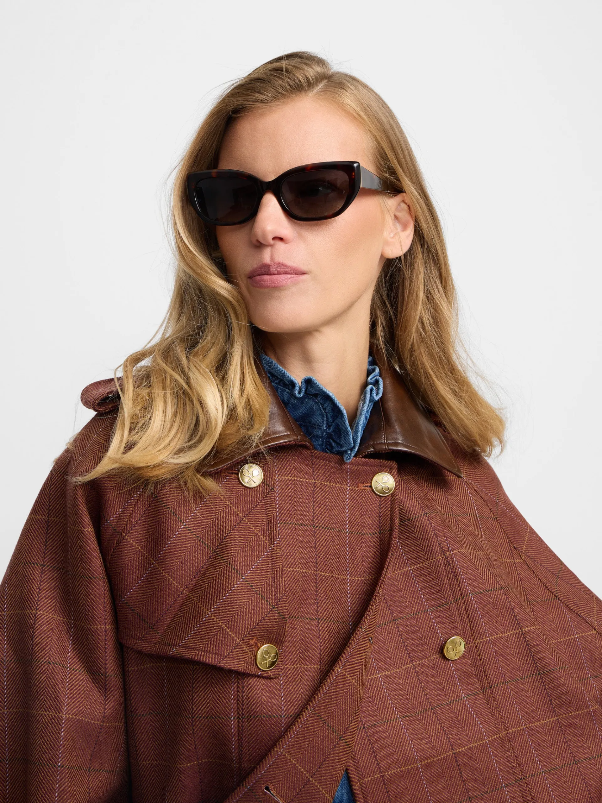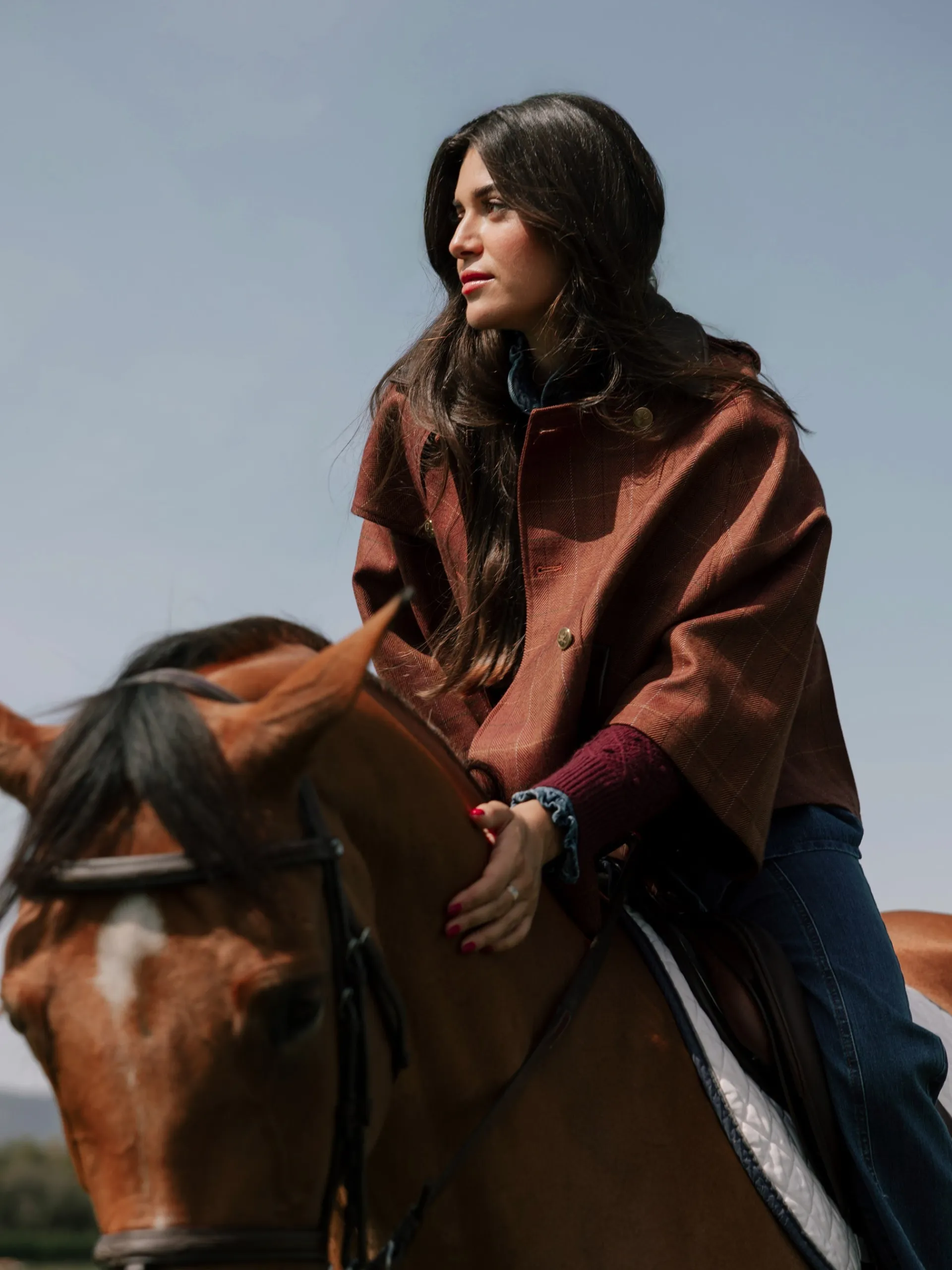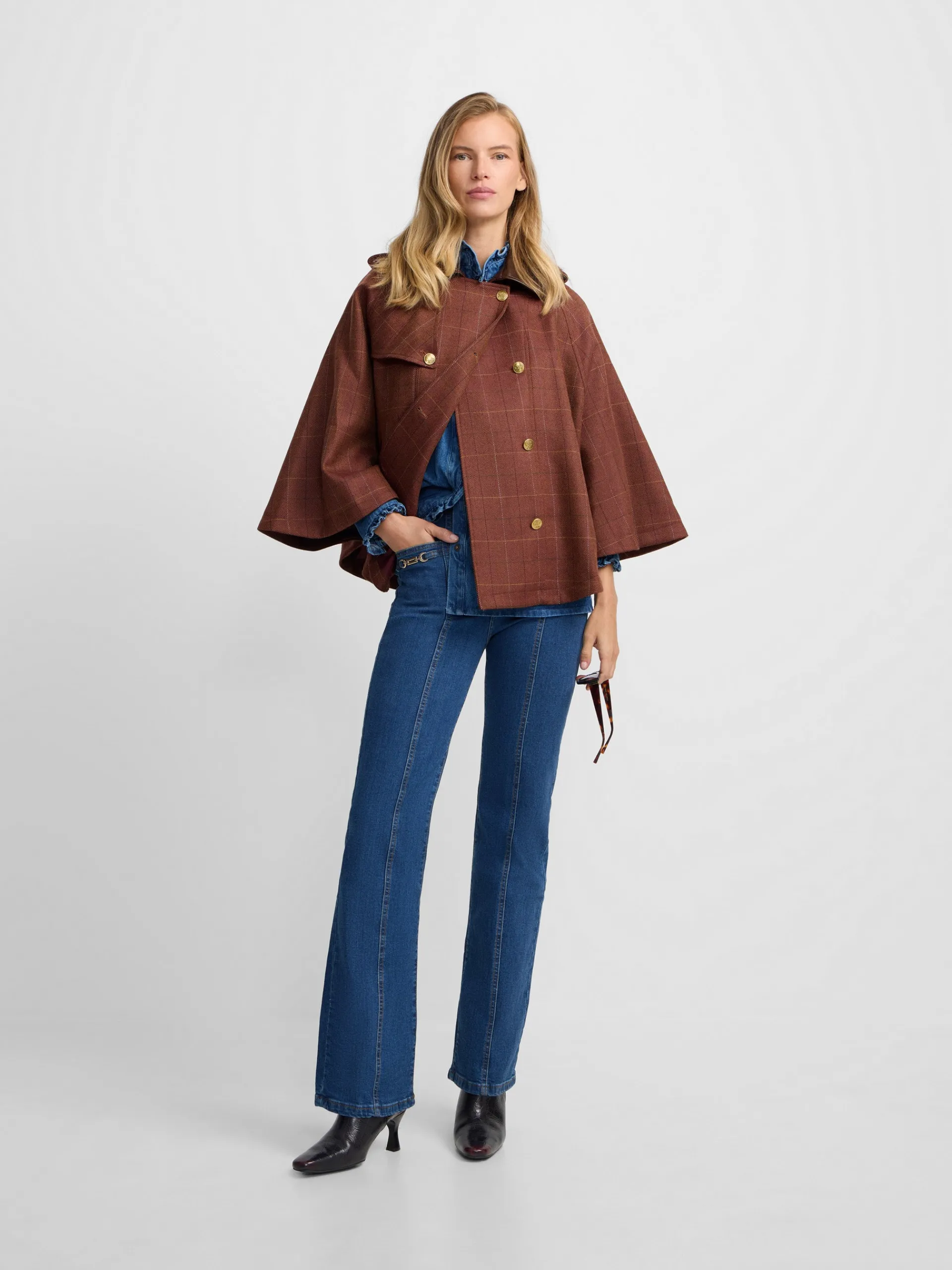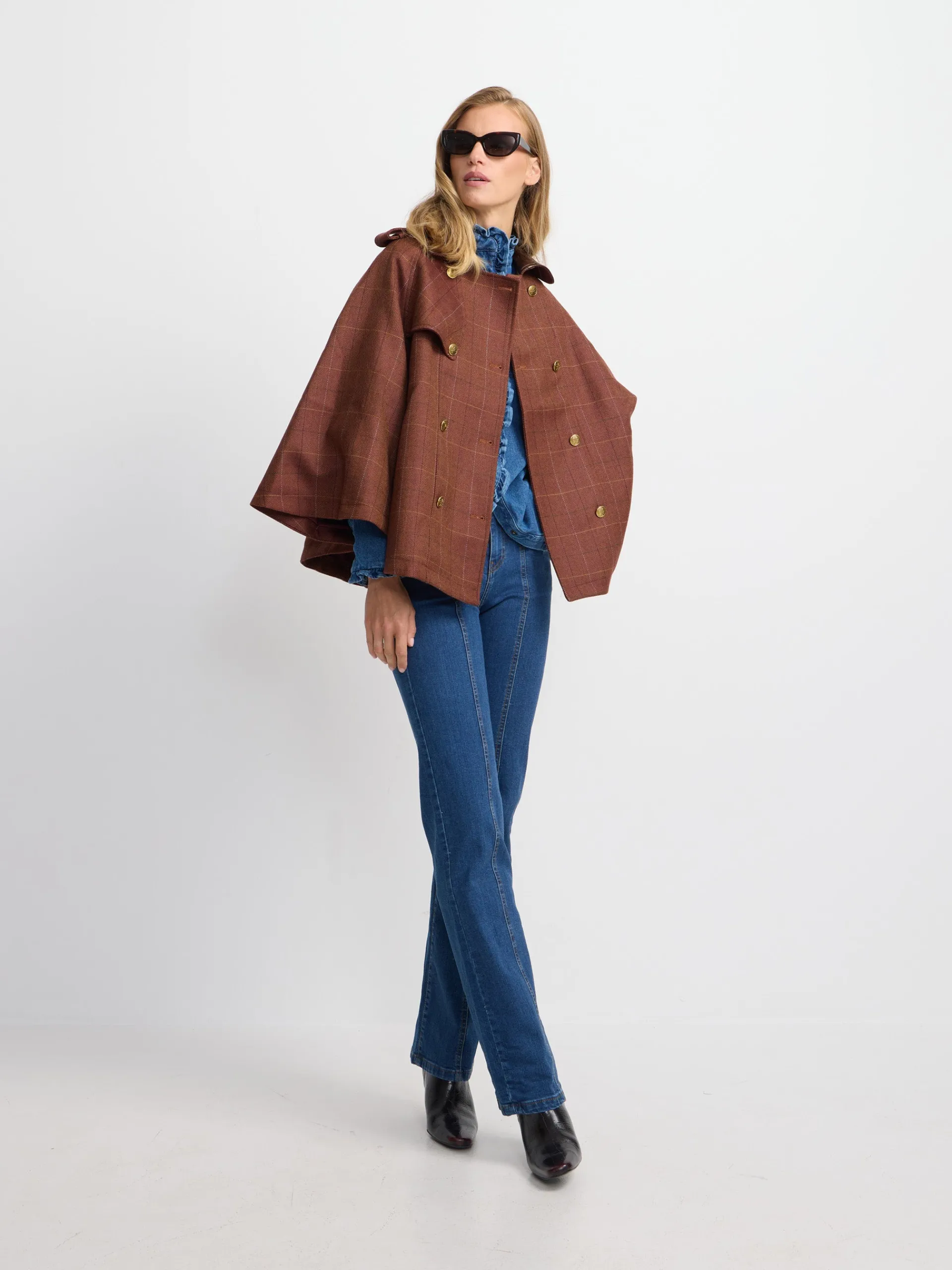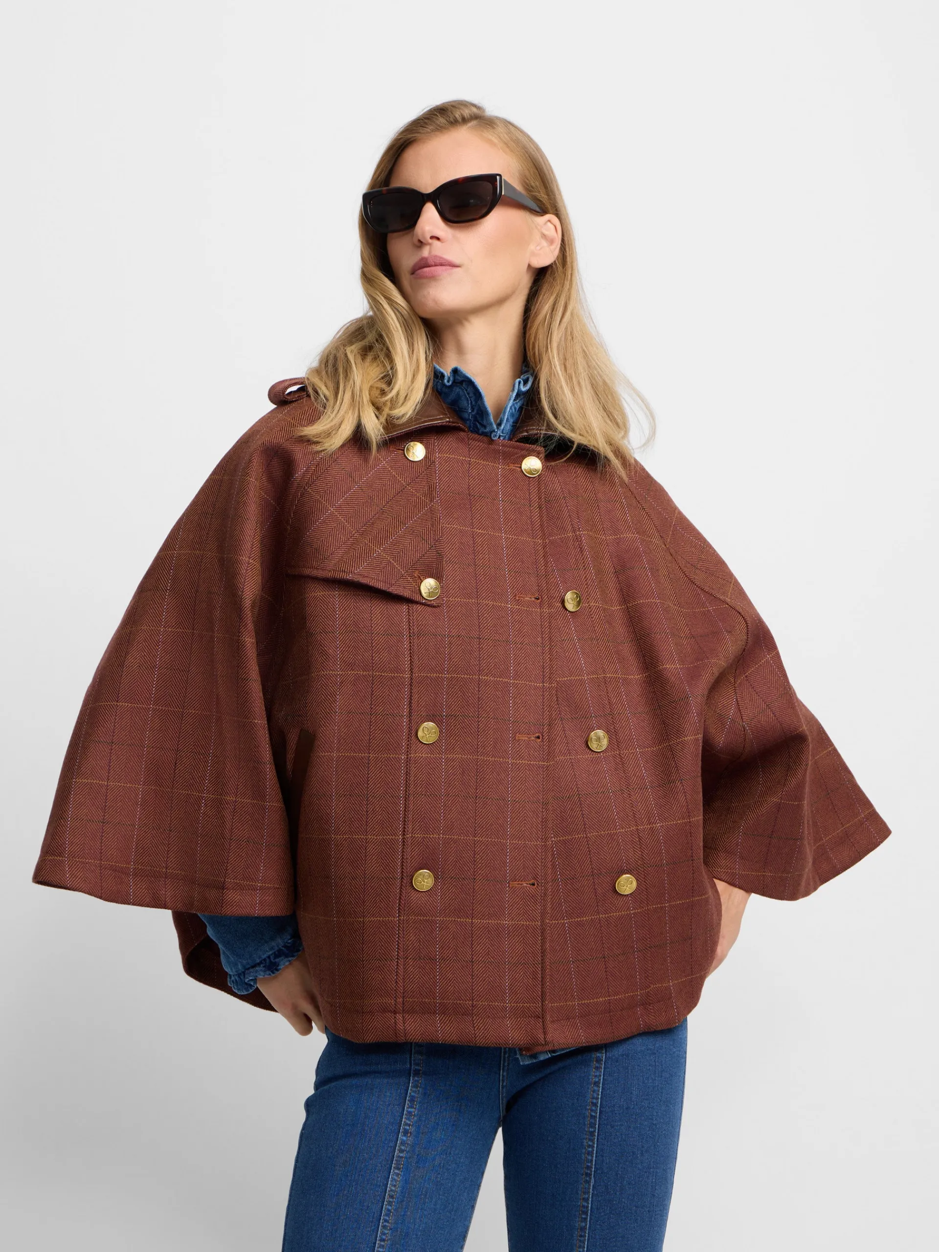 Capa de tejido de cuadros en tonos marrones confeccionada 100% en lana. Cuenta con cuello a contraste en piel marrón, con detalle de botones personalizados SILBON color oro. Presenta bolsillos a contraste en piel y forro interior en marrón. Fabricado en España.