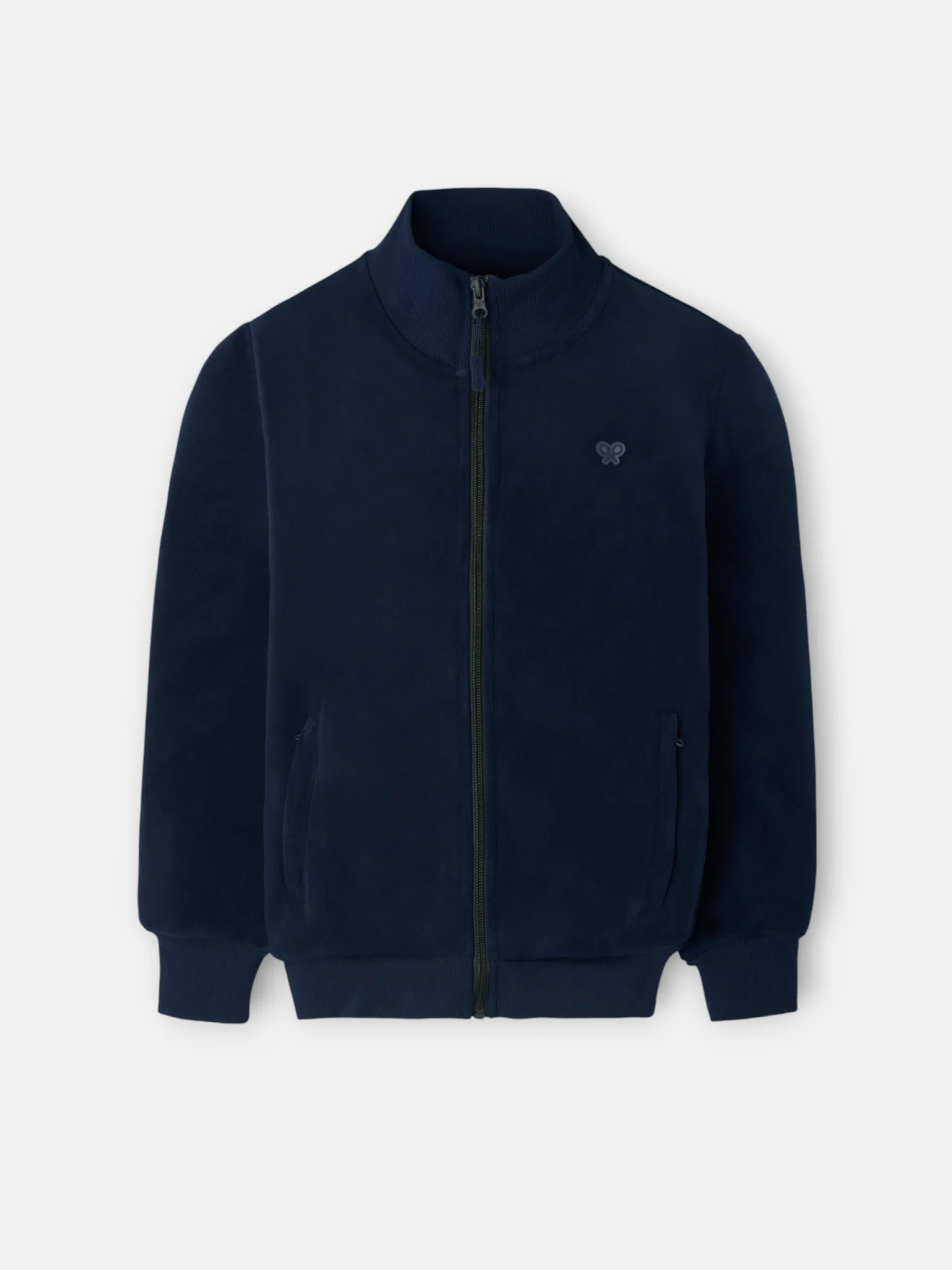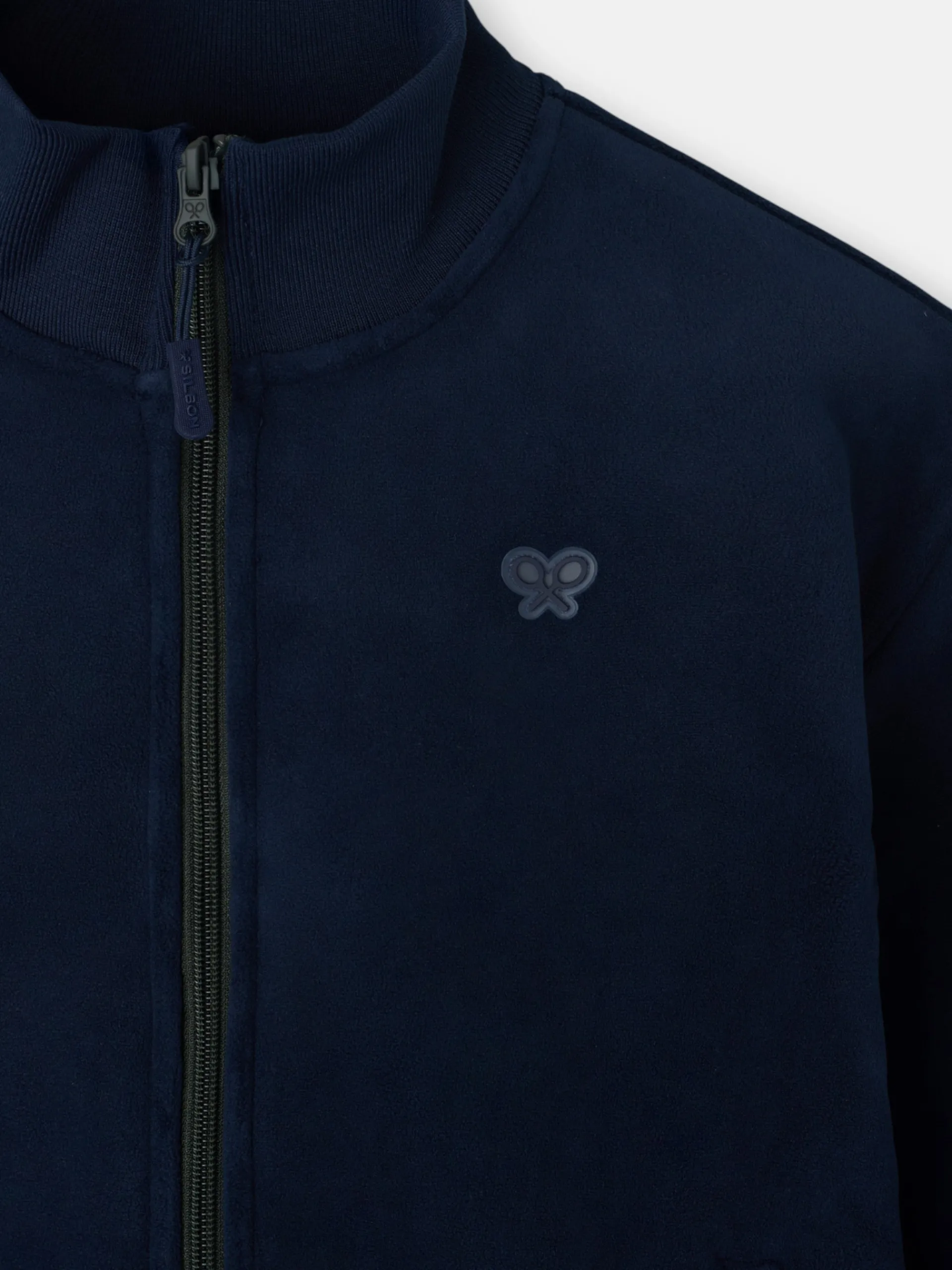 Forro polar liso de kids. Presenta cuello subido, bolsillos delanteros y cierre frontal de cremallera con tirador. Cuenta con detalle de parche de raquetas en el torso.