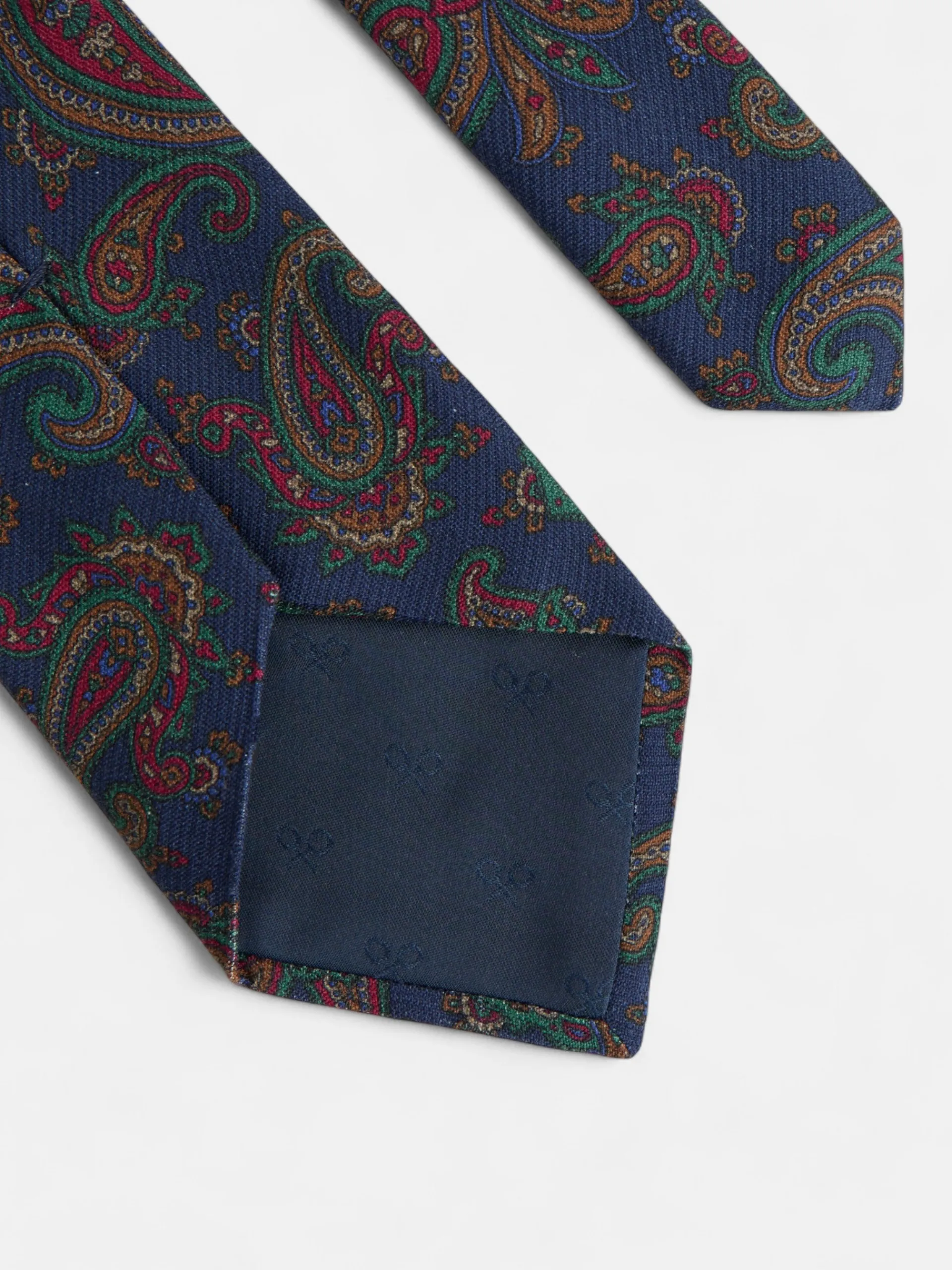 Corbata azul marino confeccionada en seda 100%. Presenta estampado pasley, y tiene forro interior personalizado con multiraquetas. Fabricada en Italia.