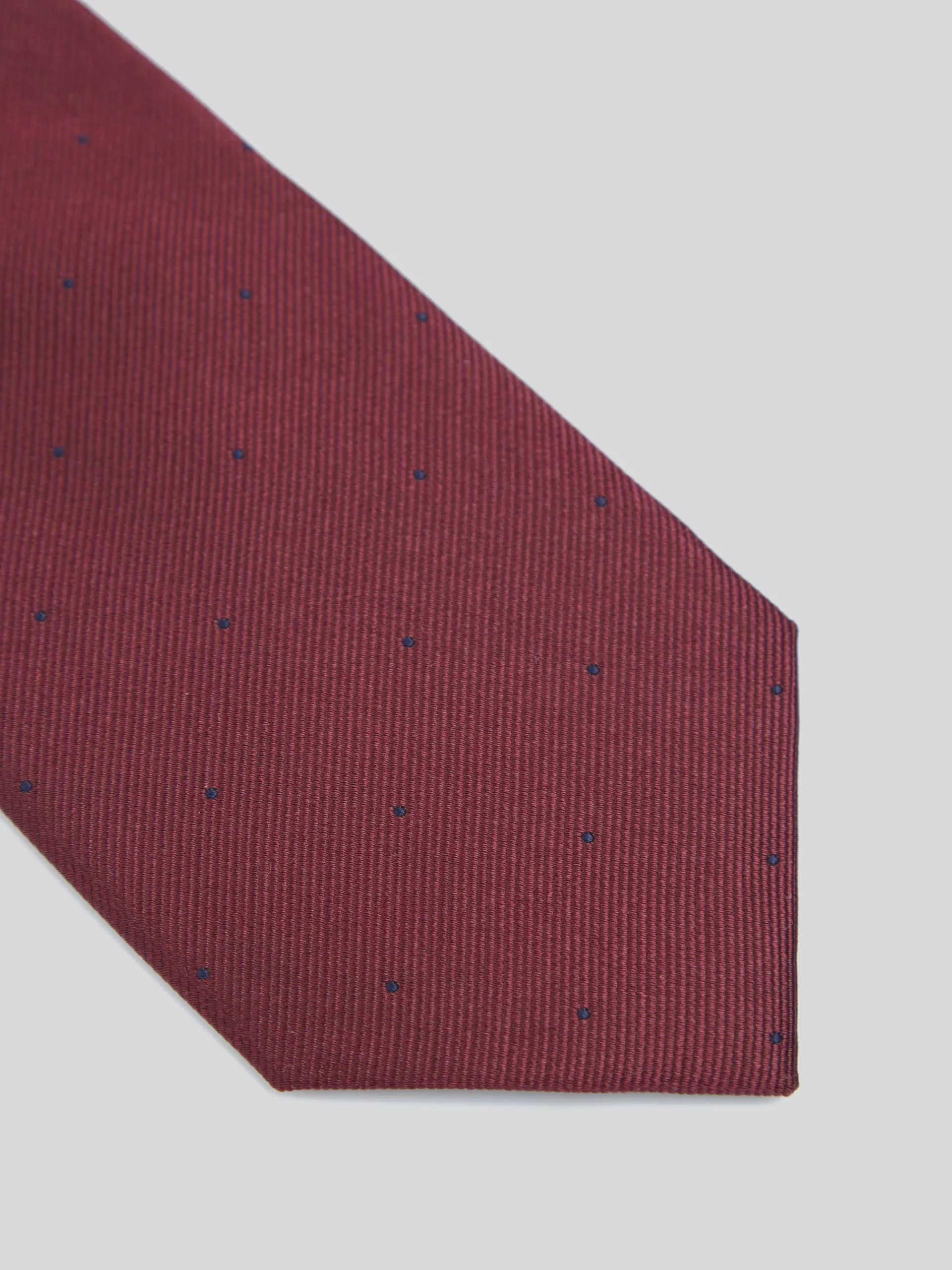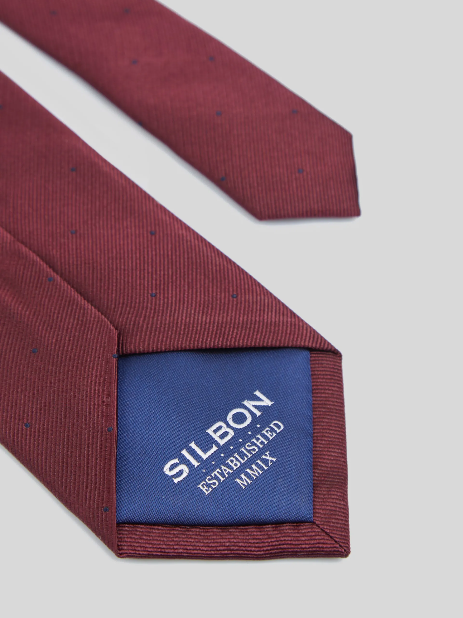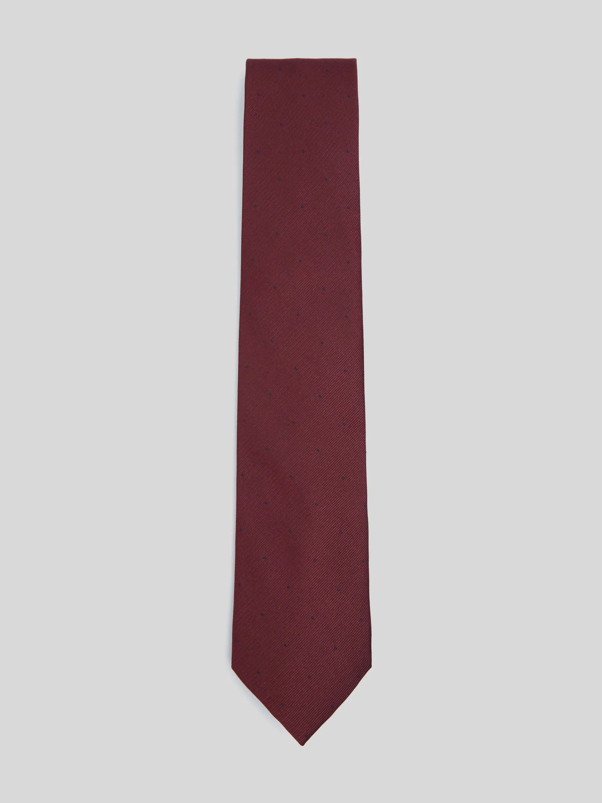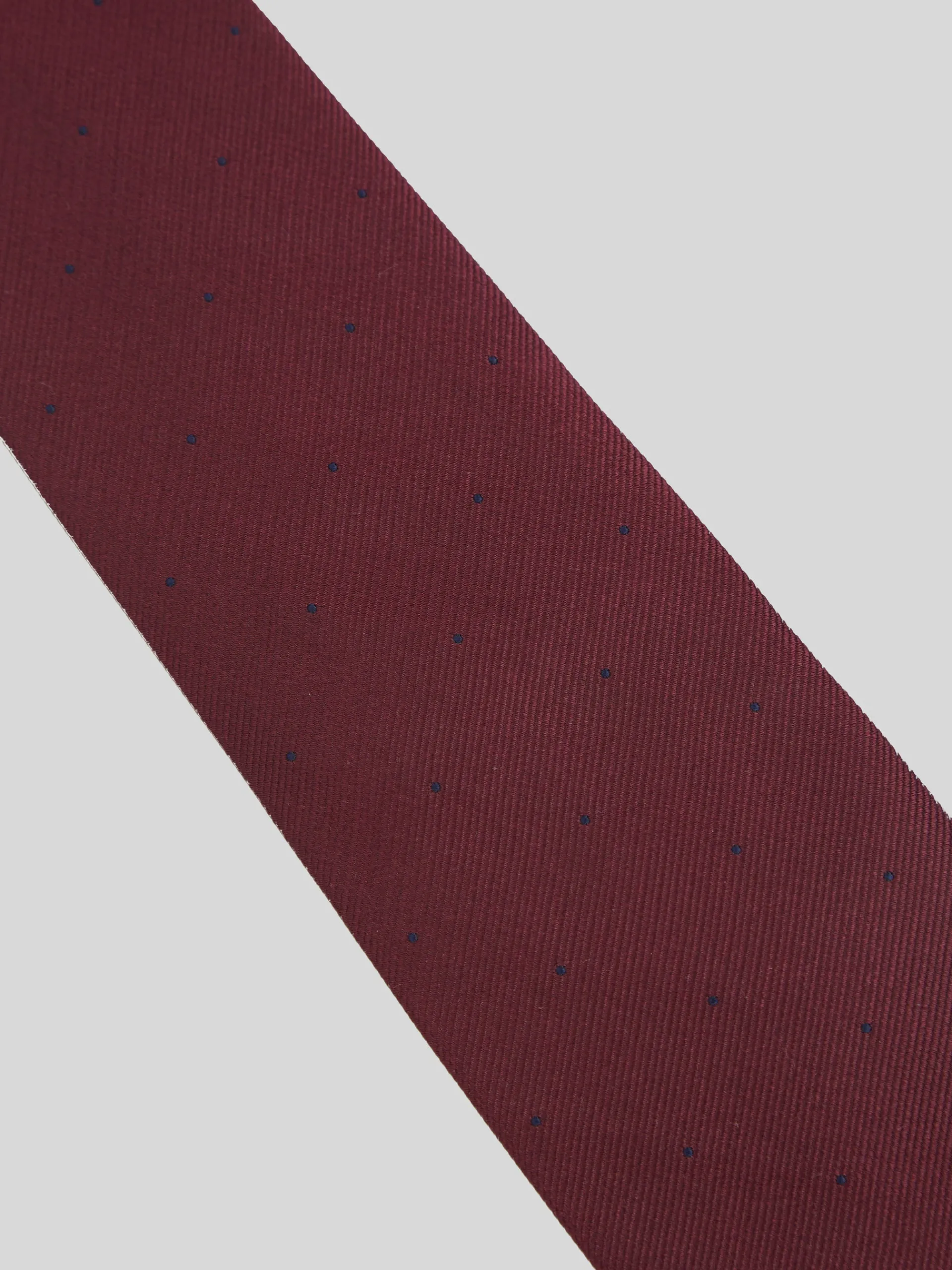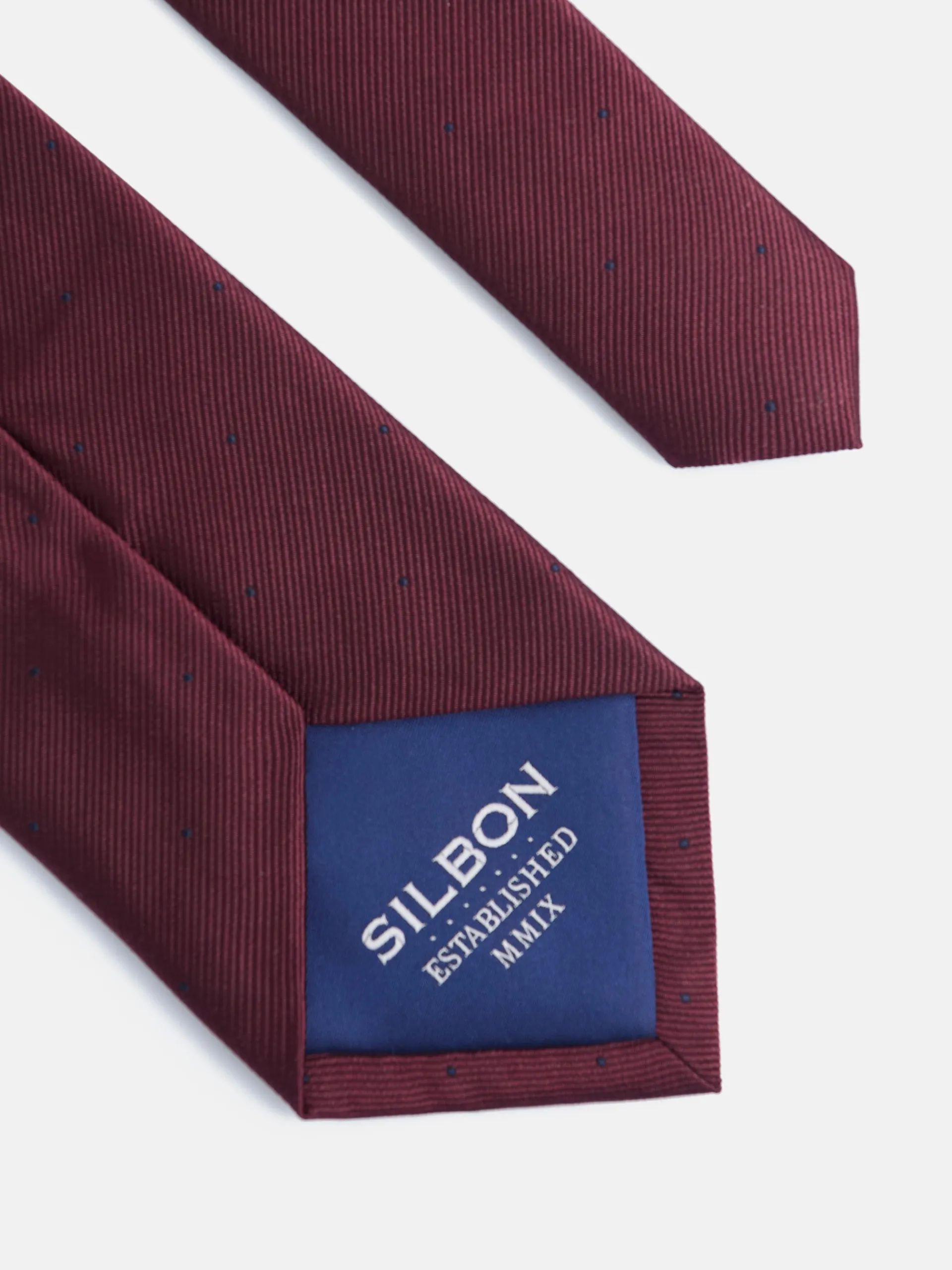 Corbata clásica de color burdeos confeccionada en 100% seda. Presenta estampado de mini puntos en color azul marino. Cuenta con forro azul personalizado