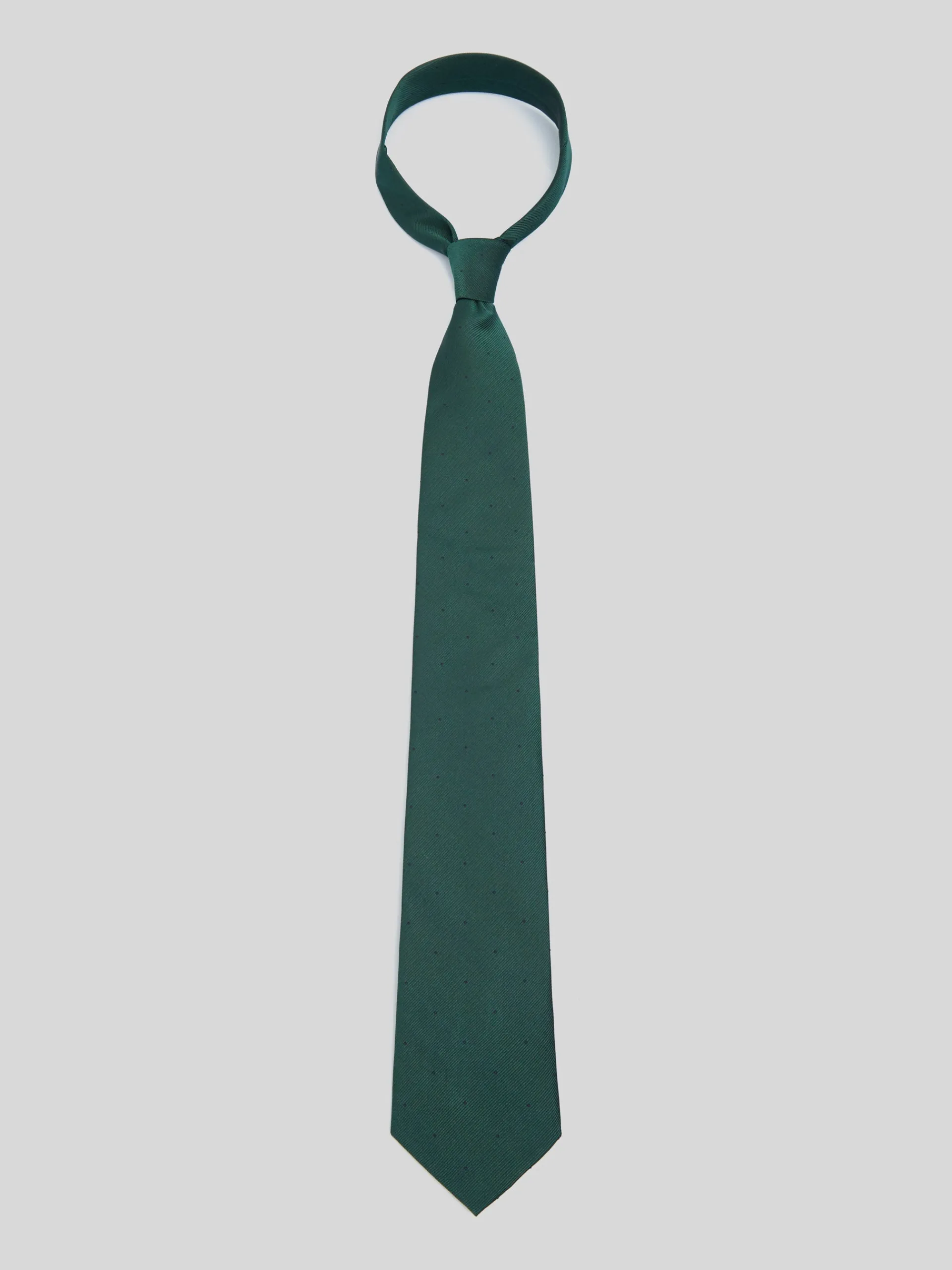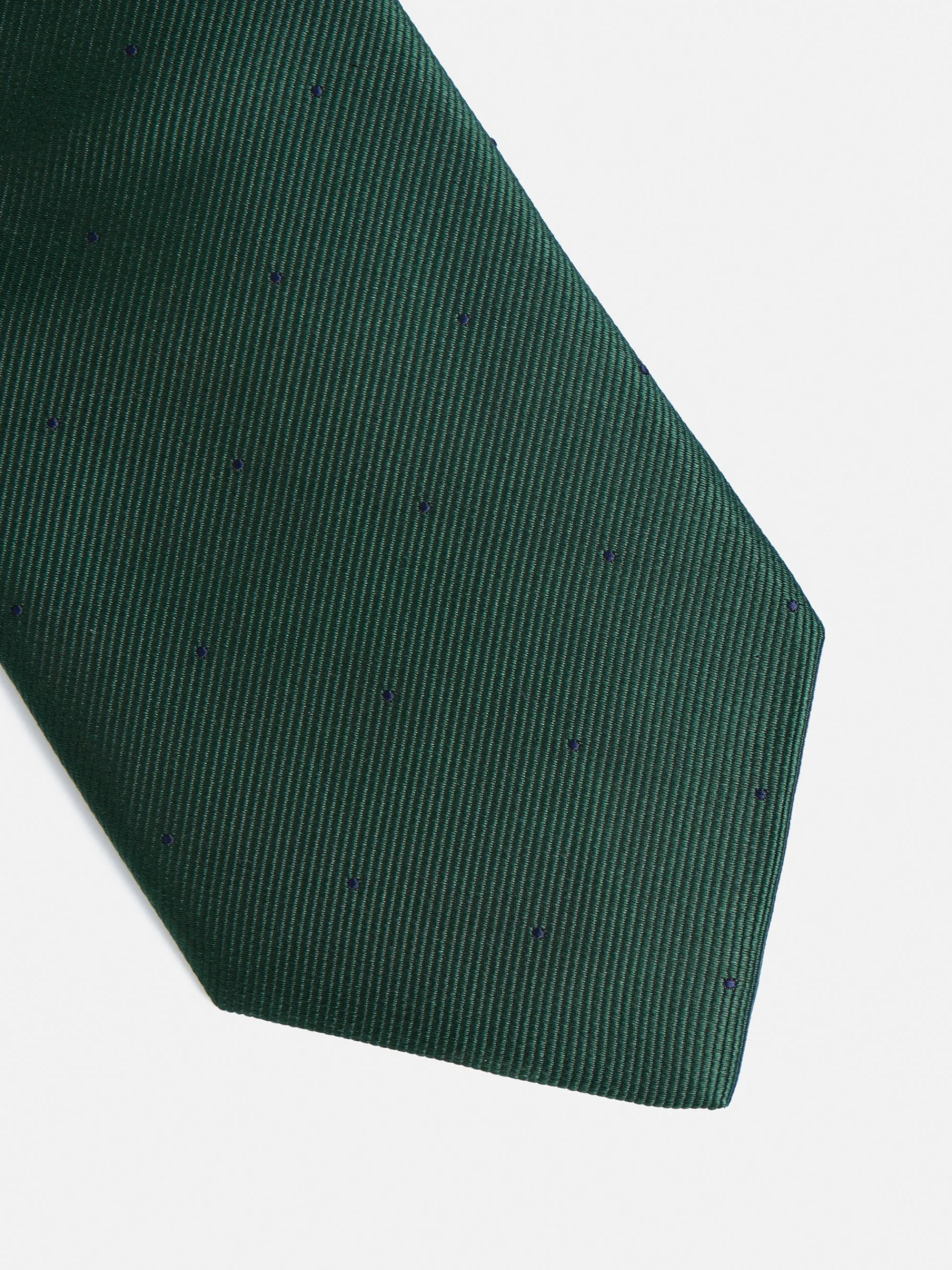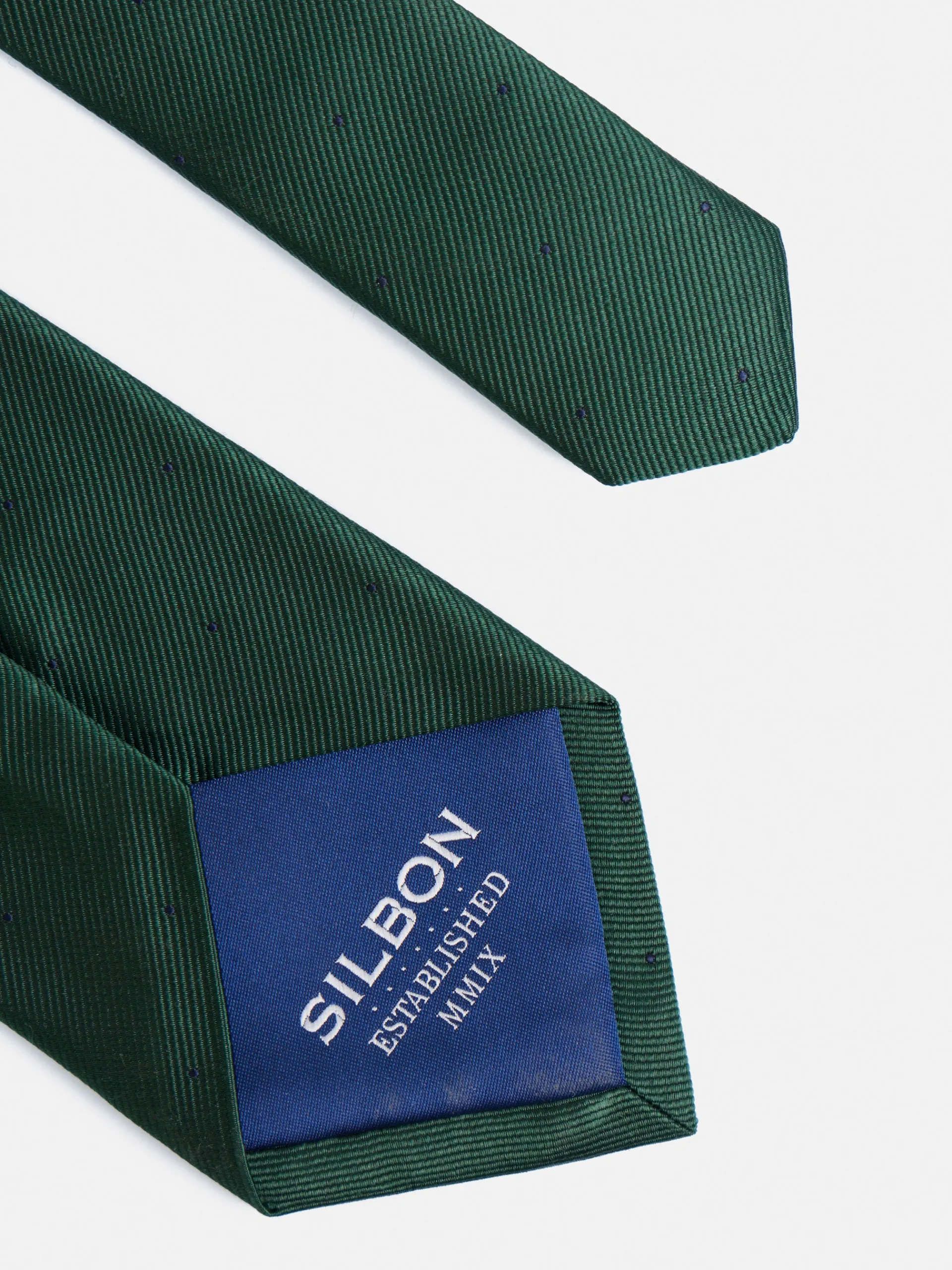 Corbata clásica de color verde confeccionada en 100% seda. Presenta estampado de mini puntos en color azul marino. Cuenta con forro azul personalizado.