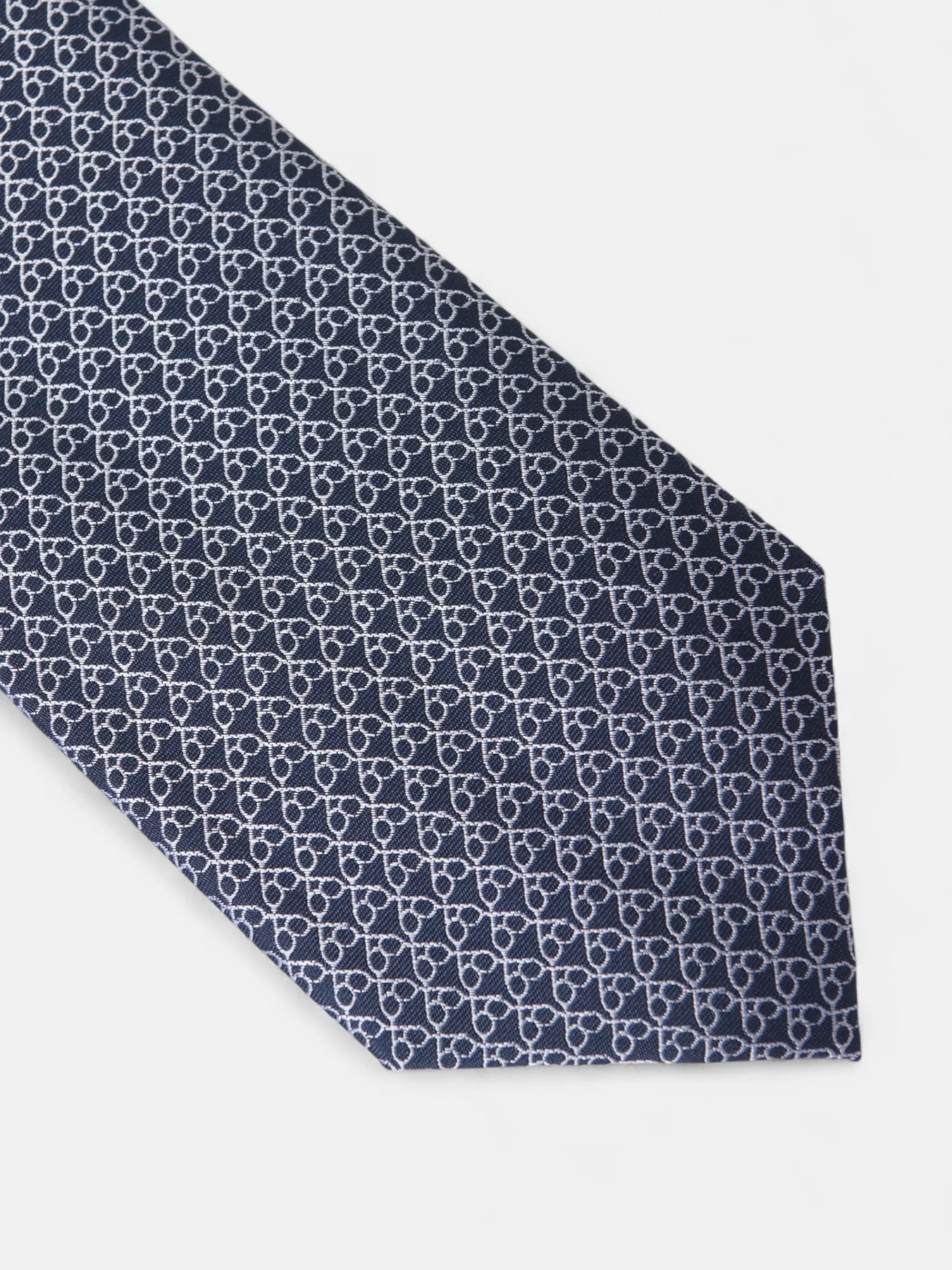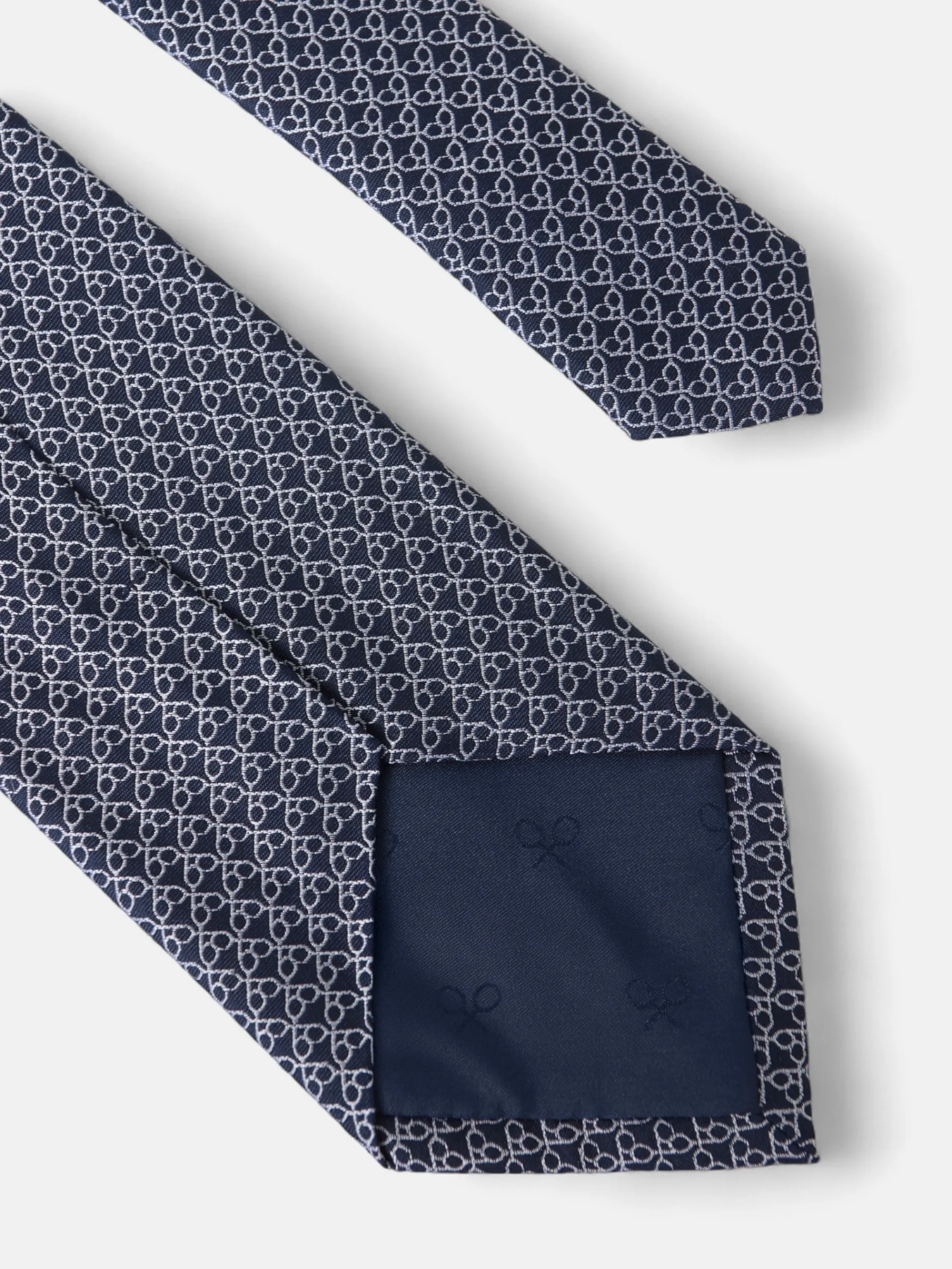 Corbata azul marino con estampado de multiraquetas blancas confeccionada en 100% seda.