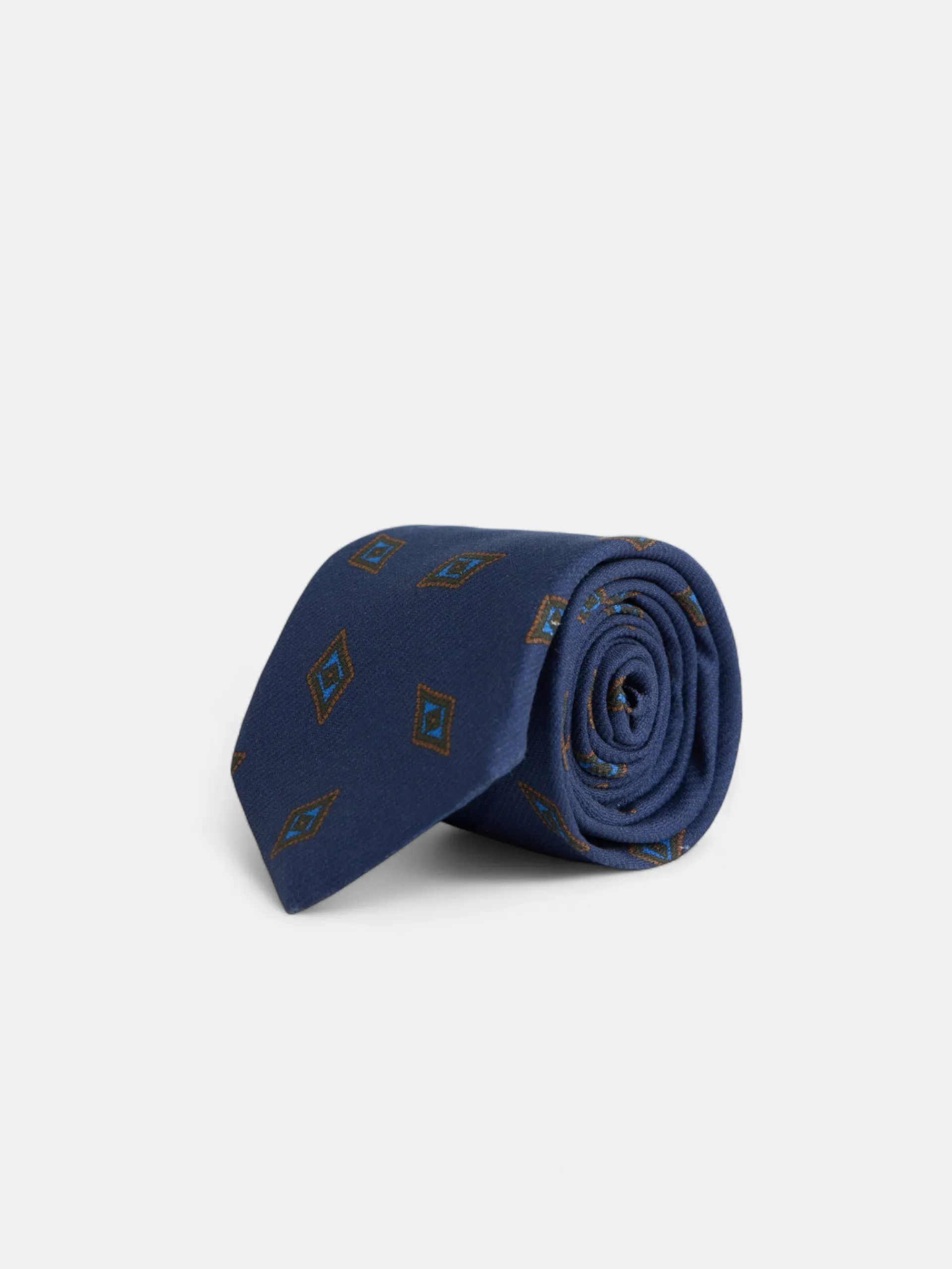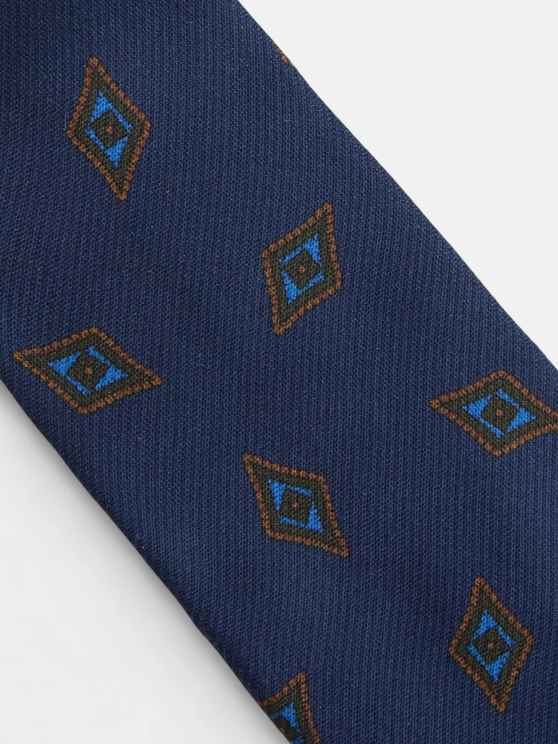 Corbata azul marino confeccionada en seda 100%. Presenta estampado de rombos y forro interior con multiraquetas. Fabricada en Italia.