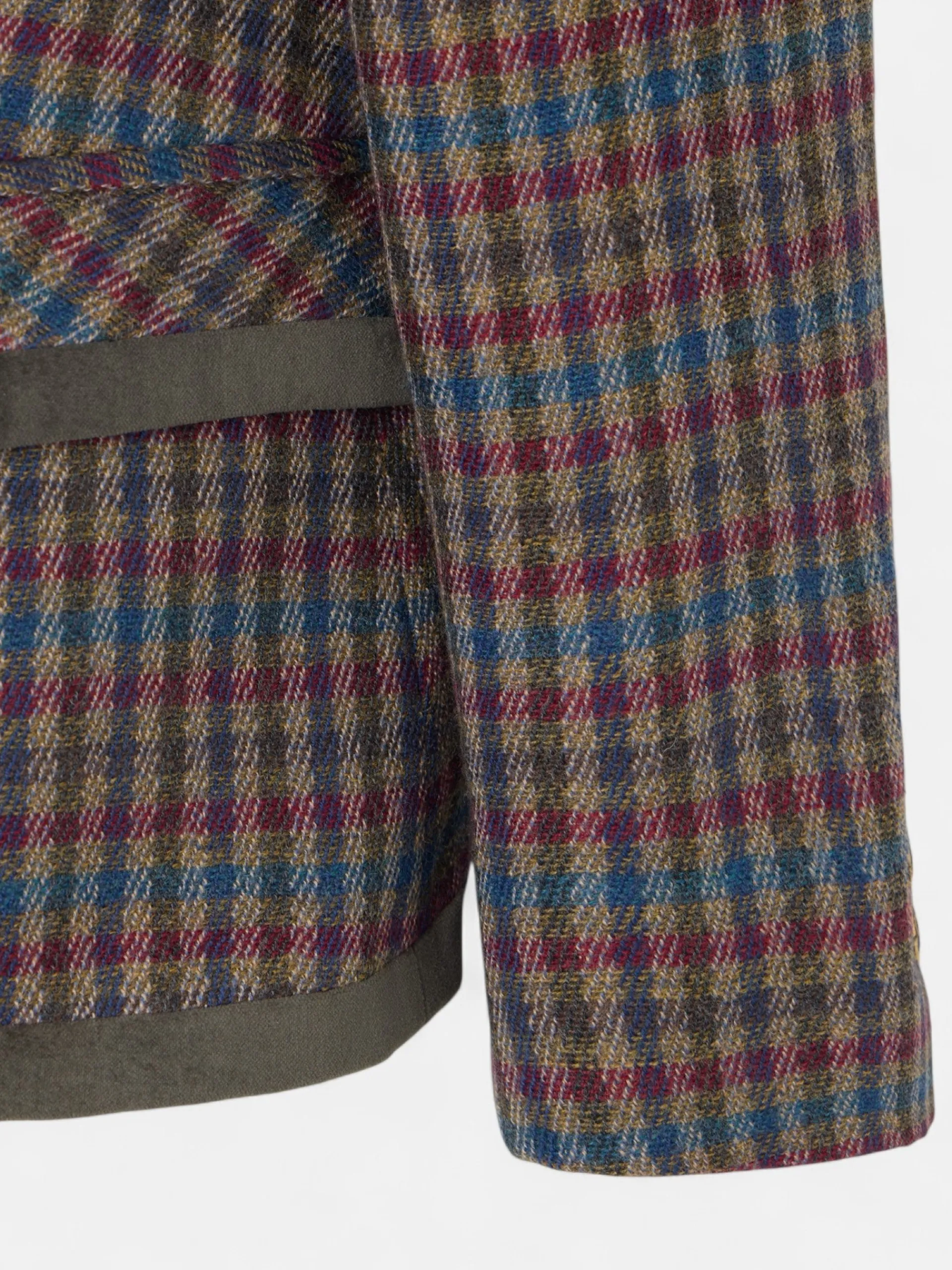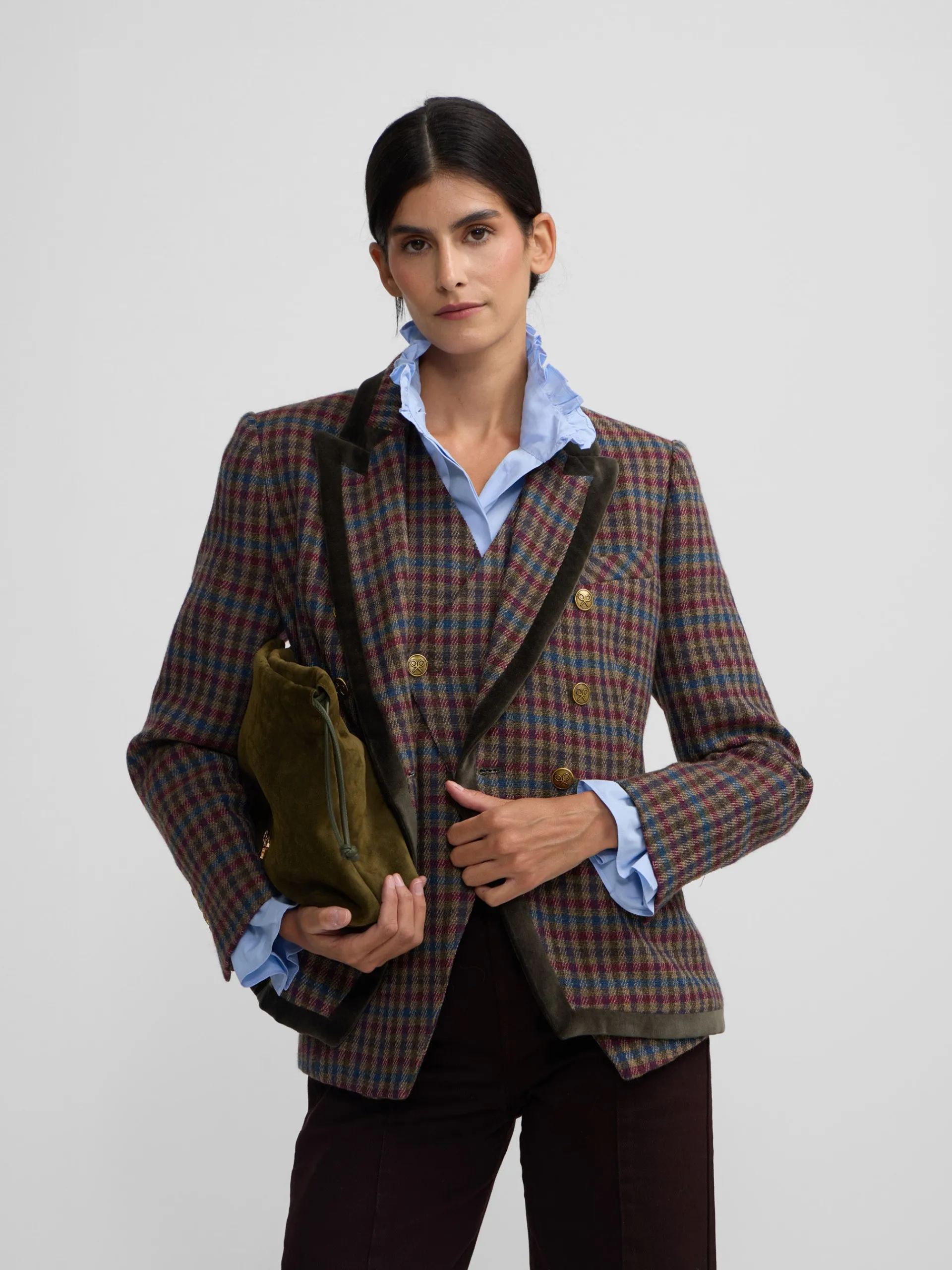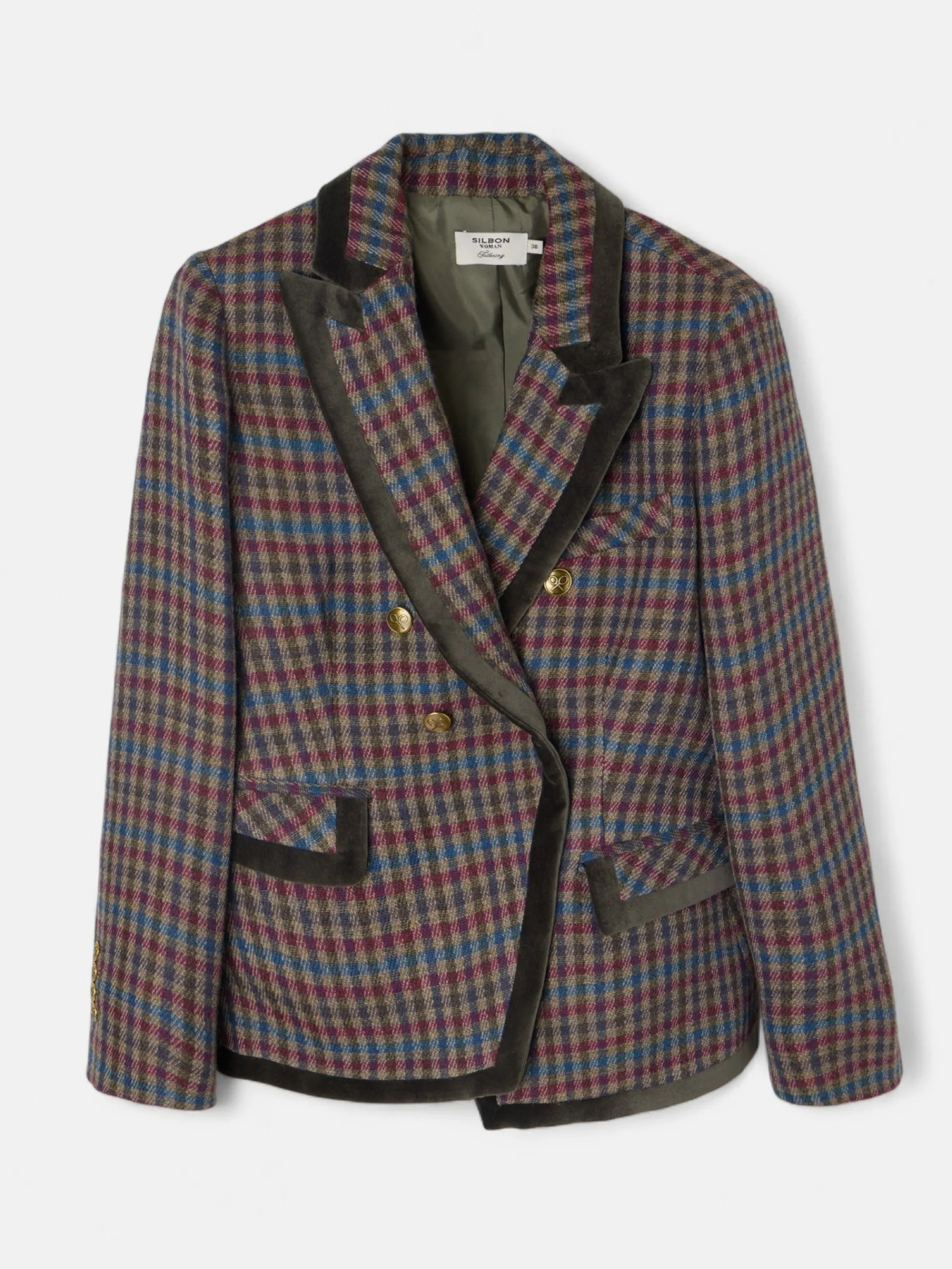 Americana cruzada de cuadros en tonos burdeos, verdes y azules, perfilada en terciopelo verde a contraste. Presenta solapa de sastre en forma de flecha, y bolsillo de vivo en pecho, y en cintura bolsillo de vivo con tapeta. Cuenta con 6 botones personalizados en oro viejo y cruce y bajo con forma. Tiene forro interior en verde a contraste. Fabricada en España. Disponible chaleco a conjunto.