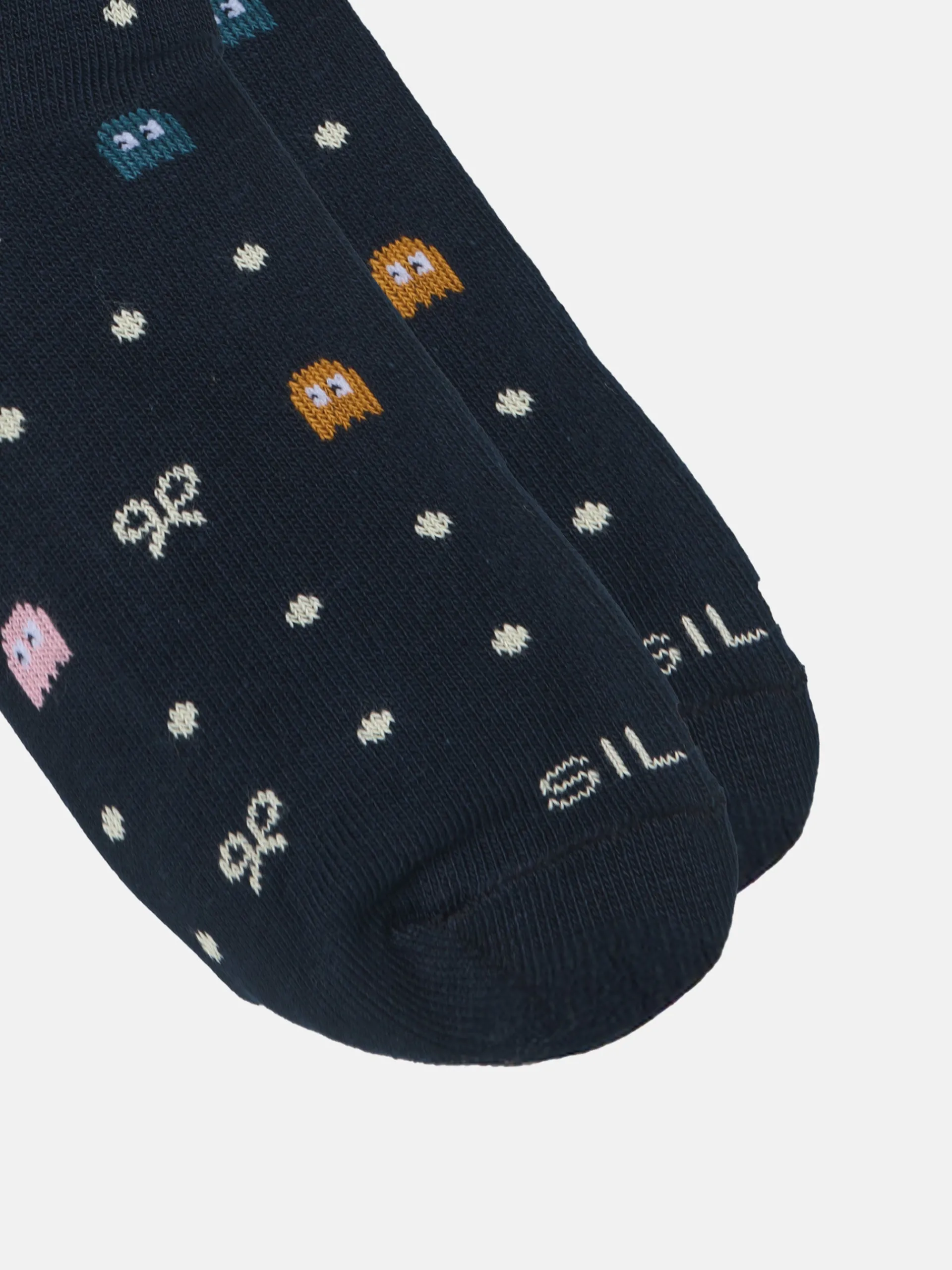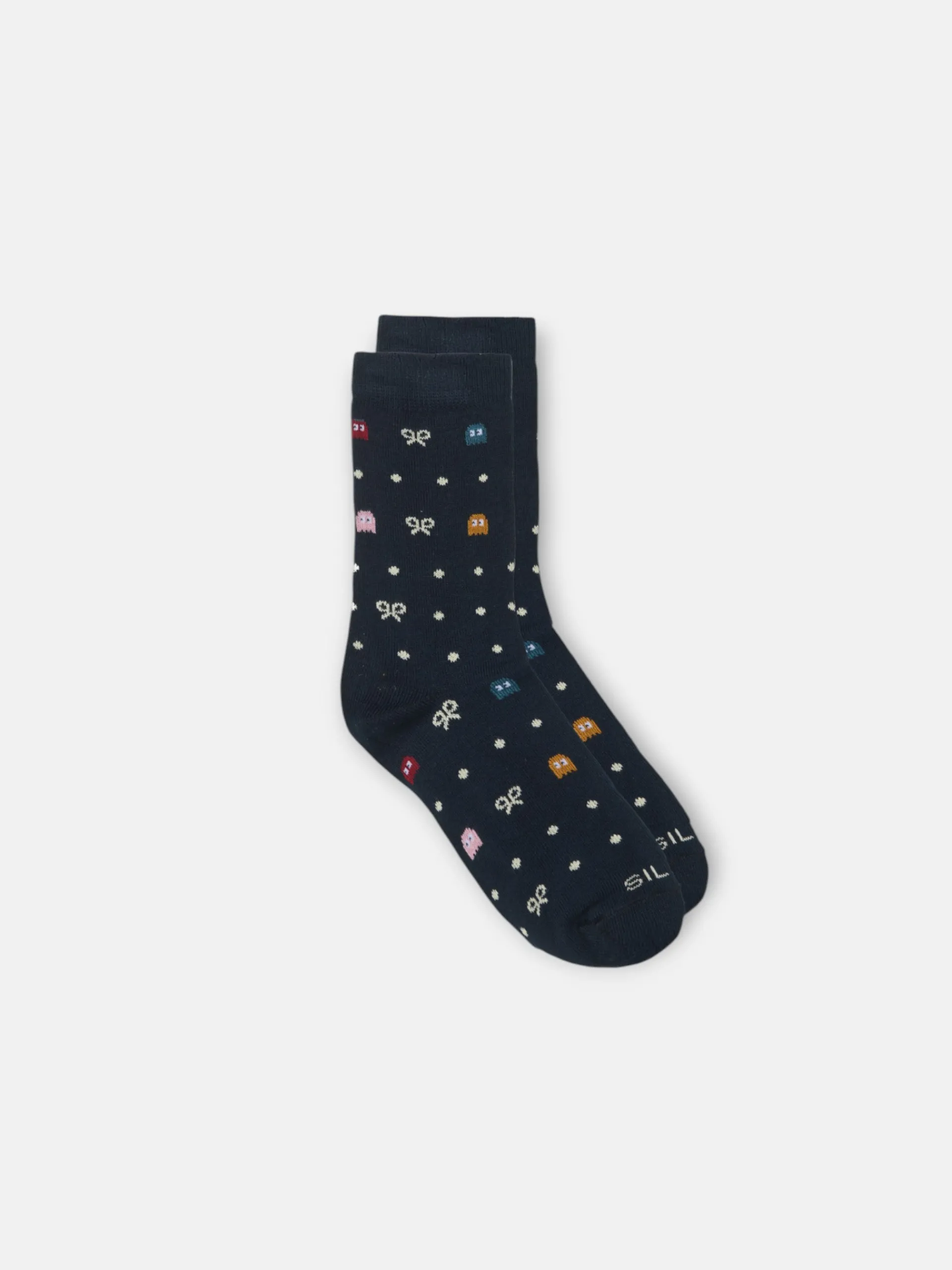 Calcetin de kids con estampado de pac-man en color azul marino confeccionado en mezcla de algodón. Presenta caña media y detalle de raquetas. Cuenta con letras SILBON en jacquard. Fabricado en Portugal.
