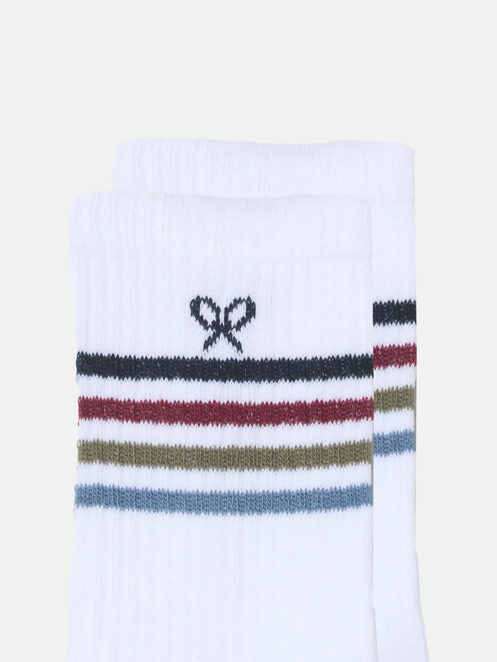 Calcetin sport blanco de kids con estampado de rayas multicolor en la caña, confeccionado en mezcla de algodón. Presenta caña media y detalle de raquetas. Cuenta con letras SILBON en jacquard. Fabricado en Portugal.