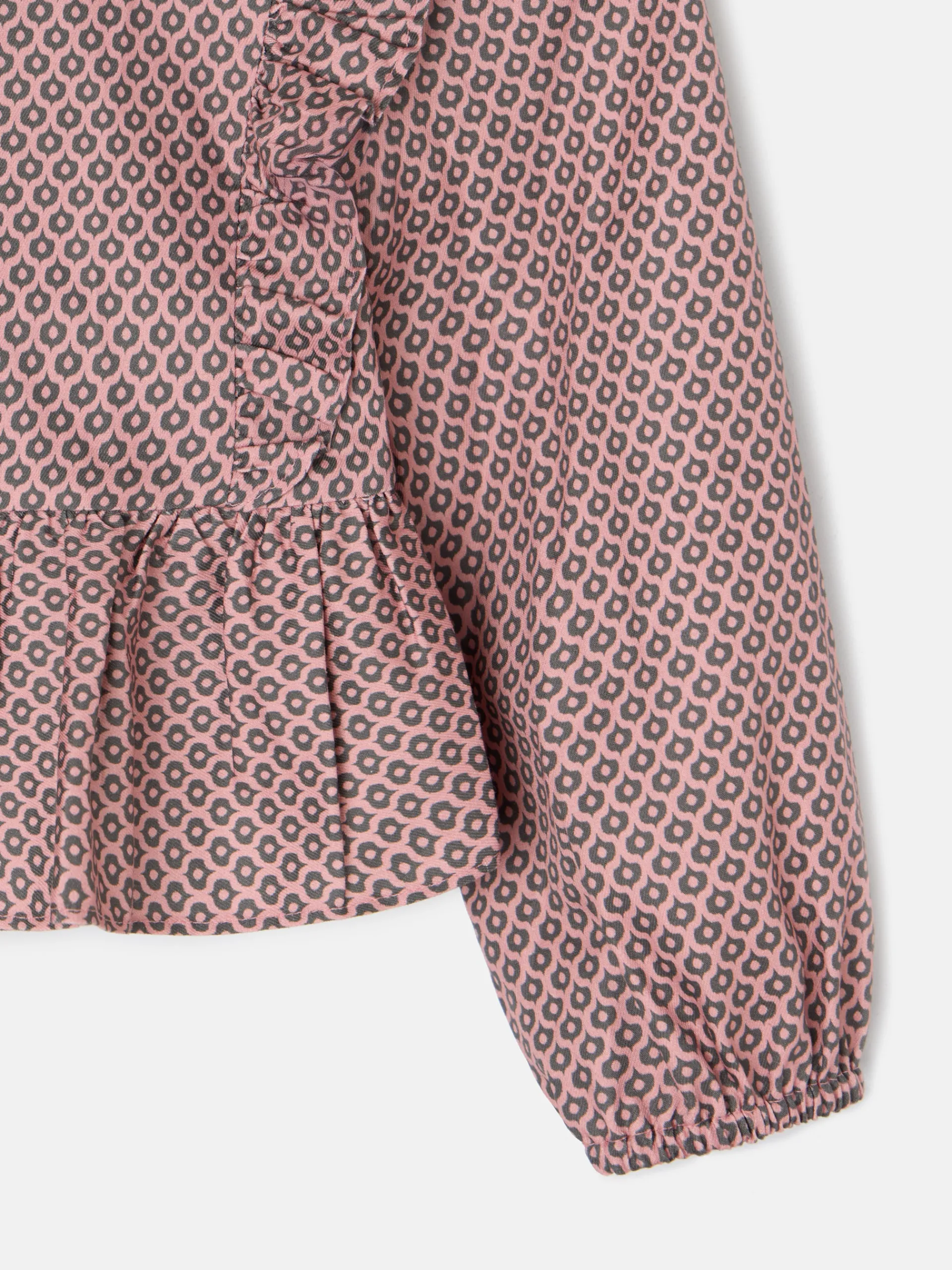 Blusa girl estampada con motivos geométricos en tonos rosa y gris, confeccionada en 100% algodón. Presenta detalle de volantes desde los hombros hasta la cintura con corte rematado con volante en la parte inferior. Cuenta con cuello redondo con volante y cierre mediante botonadura posterior de botones camiseros personalizados. Tiene la manga larga abullonada con puño elástico. Fabricada en España. Disponible falda a conjunto.