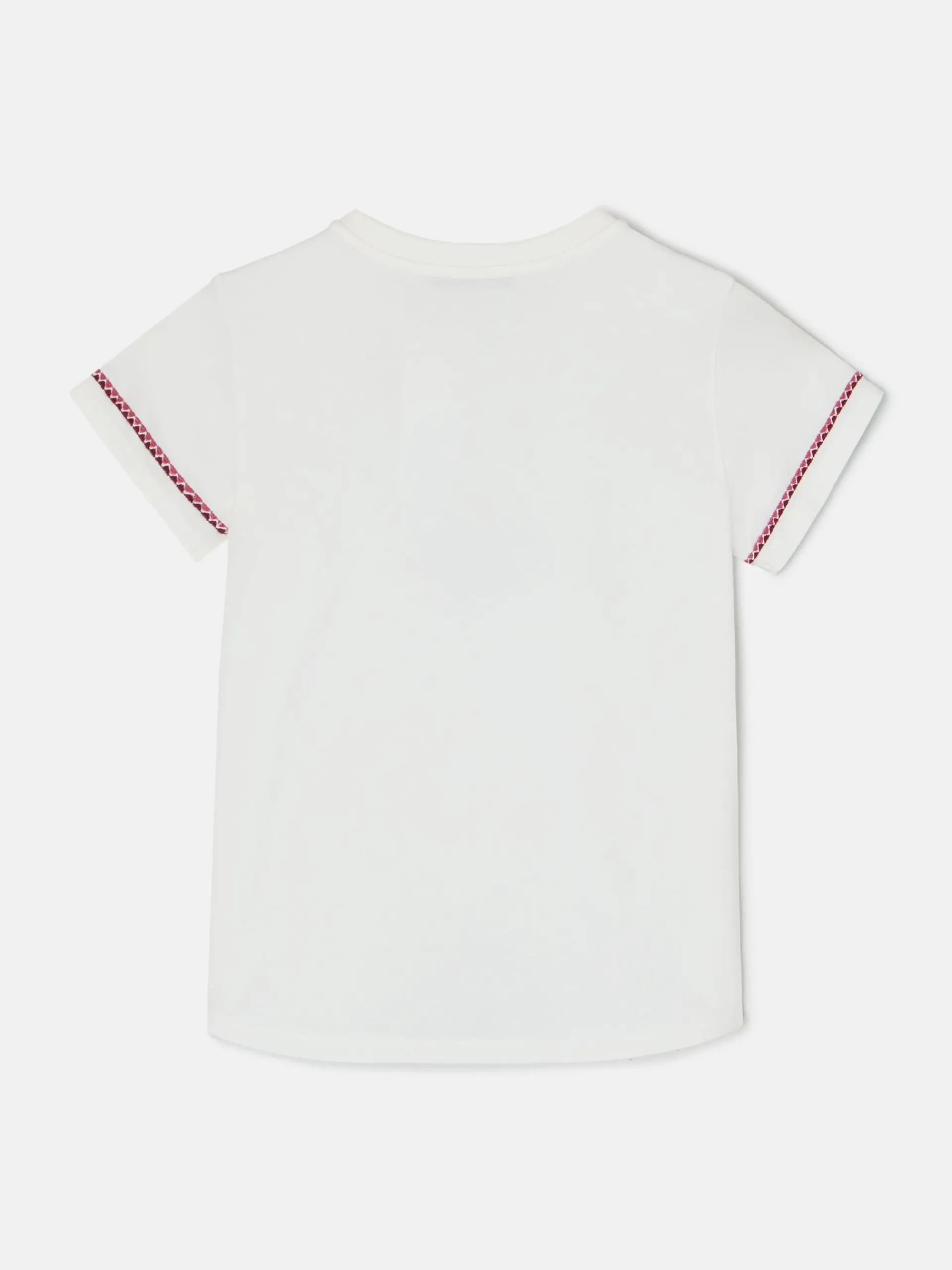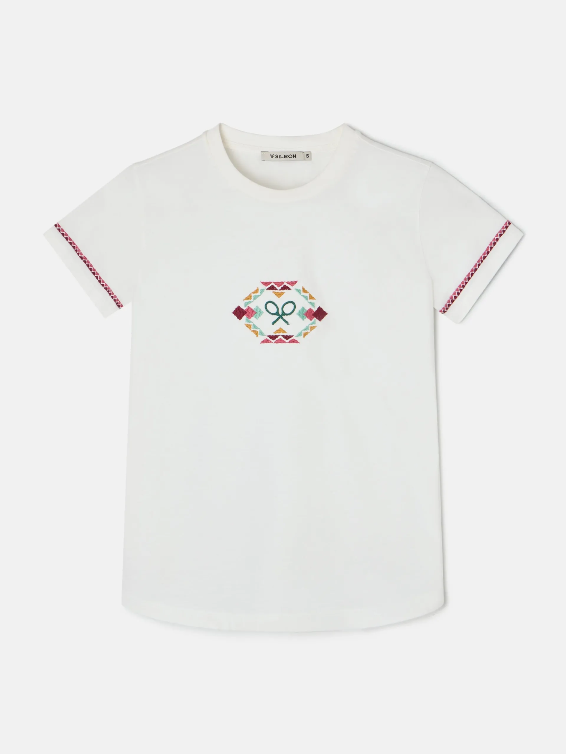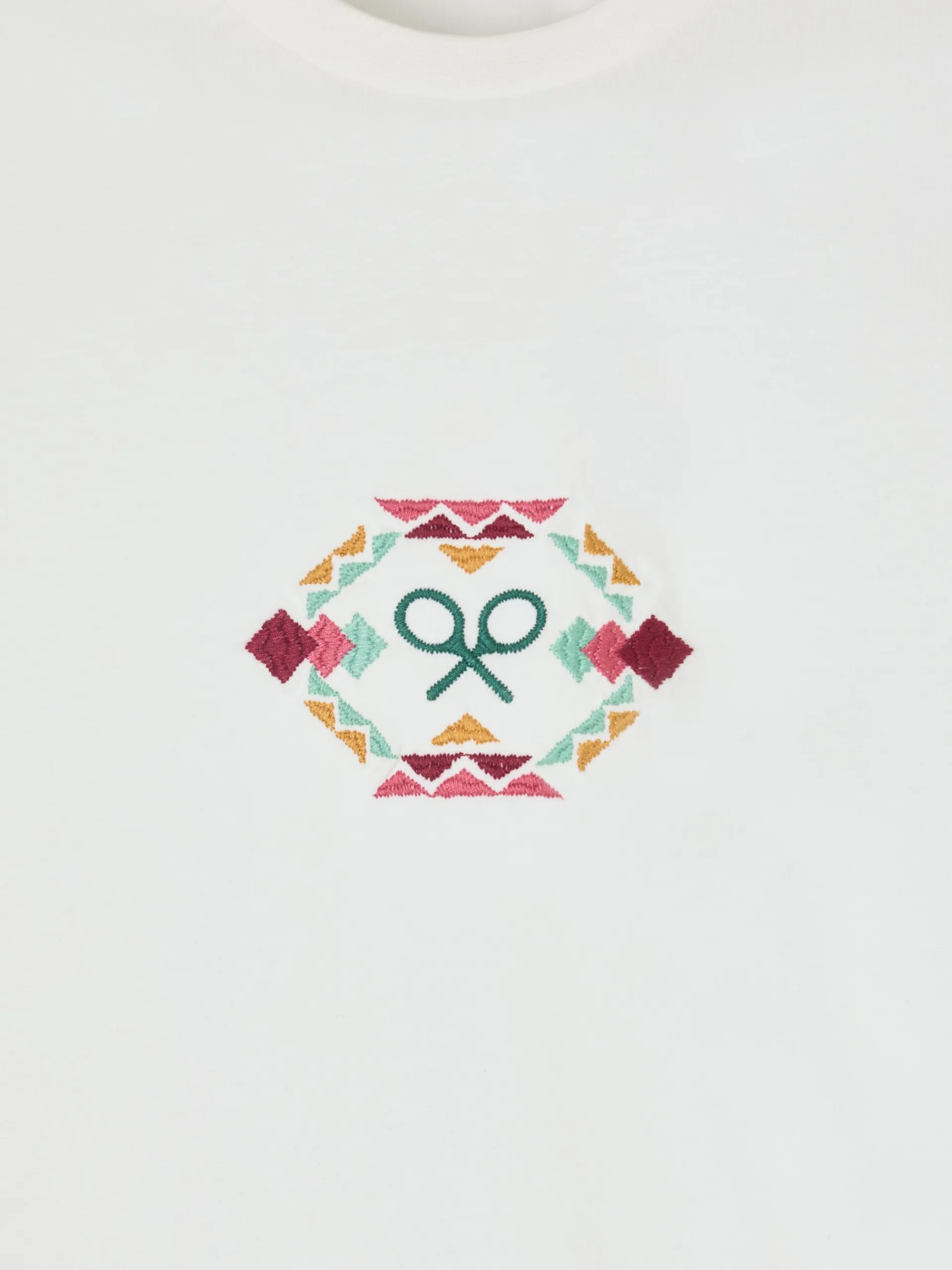 Camiseta woman clásica blanca de corte regular fit confeccionada en 100% algodón. Presenta bordado étnico multicolor en la parte delantera y en las mangas. Cuenta con cuello redondo y manga corta.