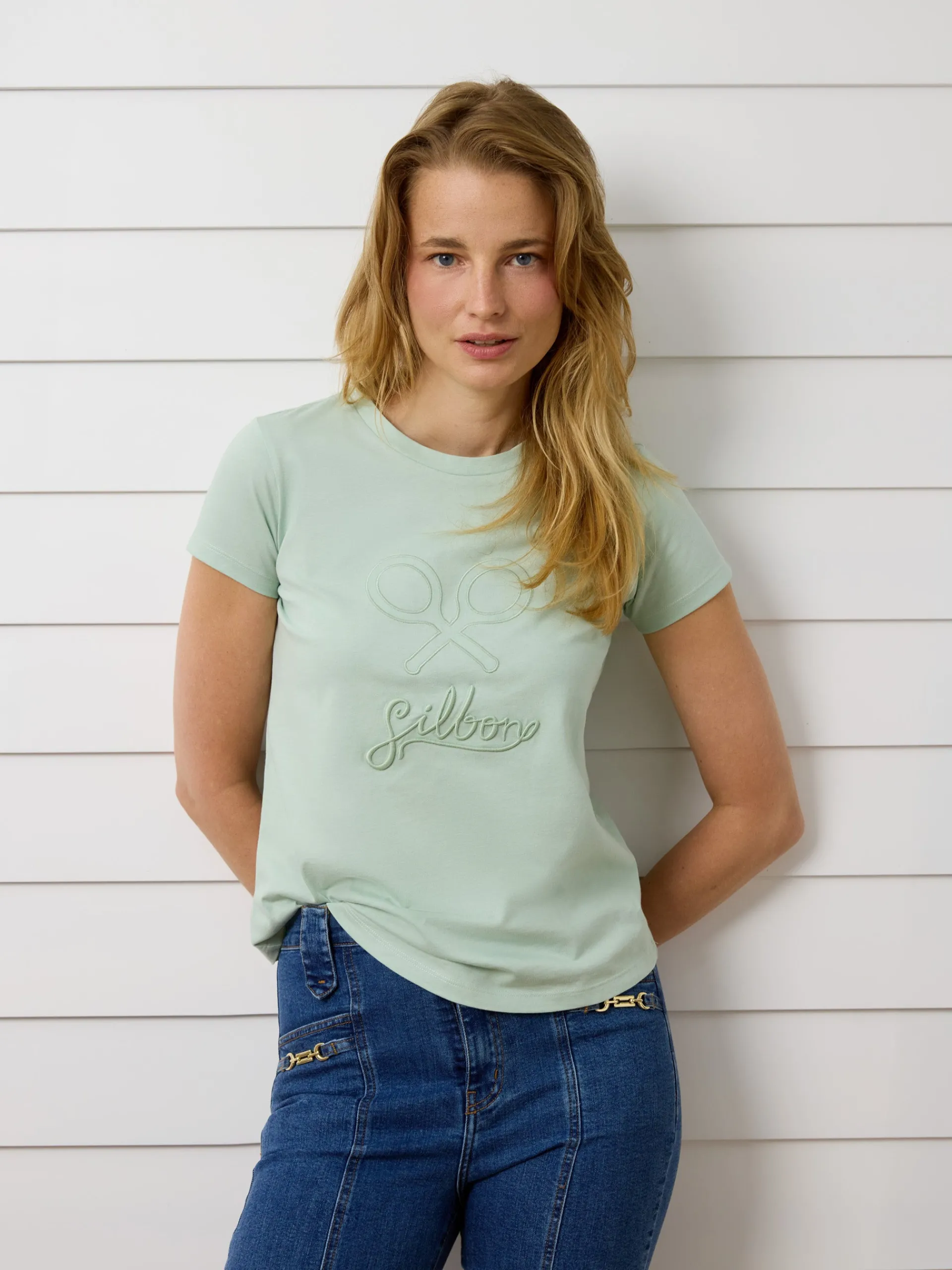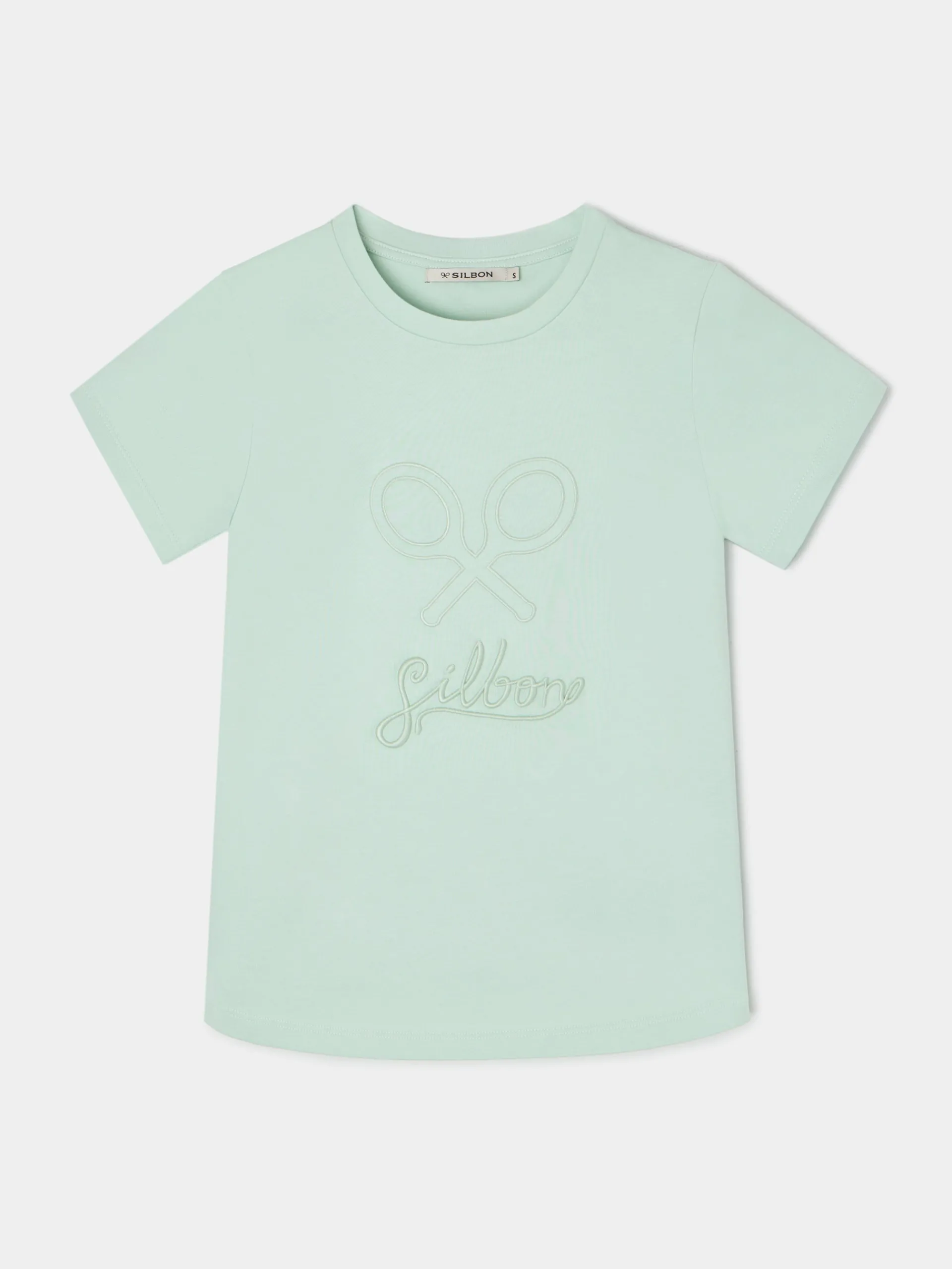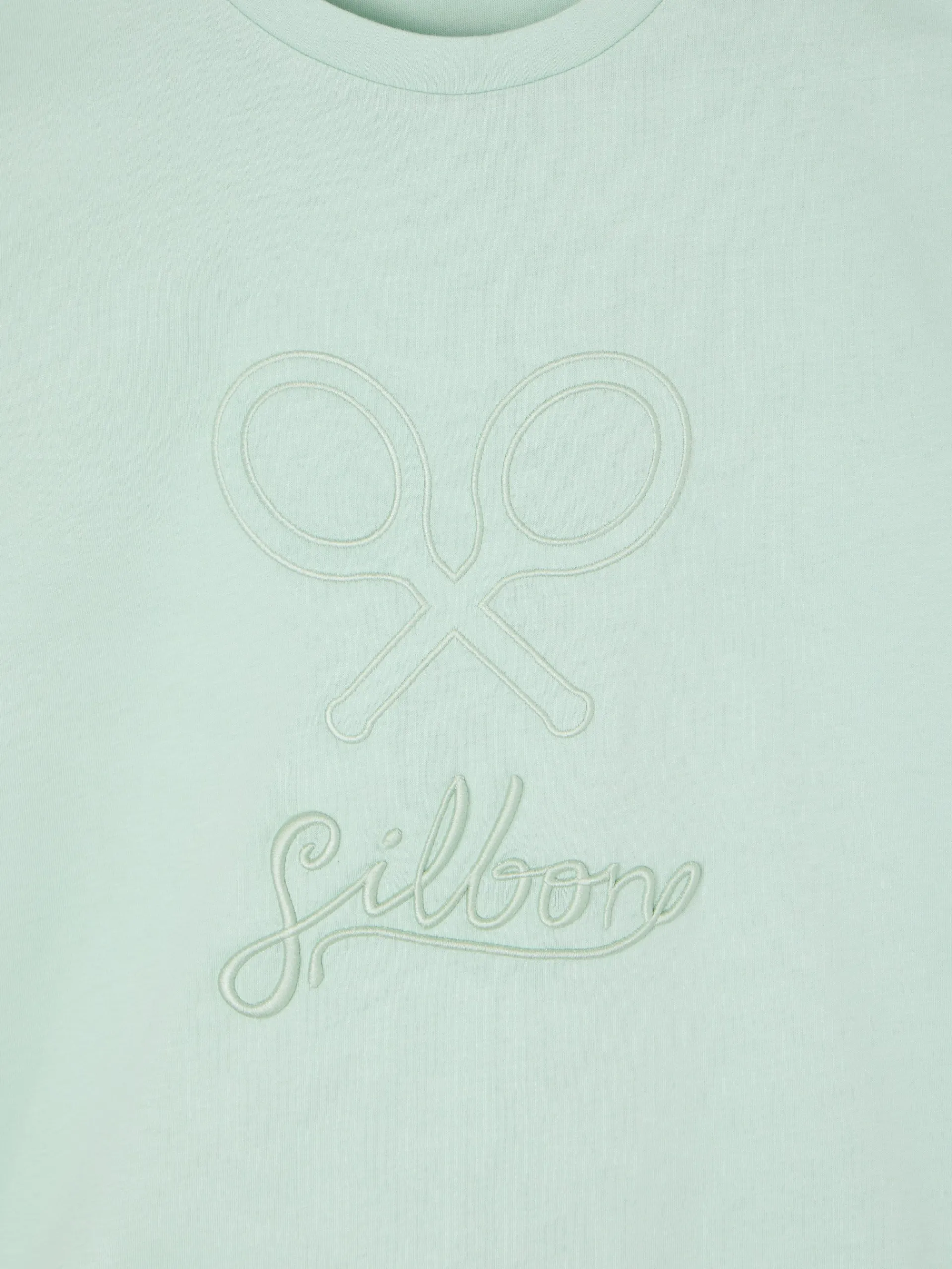 Camiseta woman clásica verde pastel confeccionada en 100% algodón de corte regular fit. Presenta detalle de logo de raquetas y letras Silbon a tono bordado. Cuenta con manga corta y cuello redondo. Fabricada en Portugal.