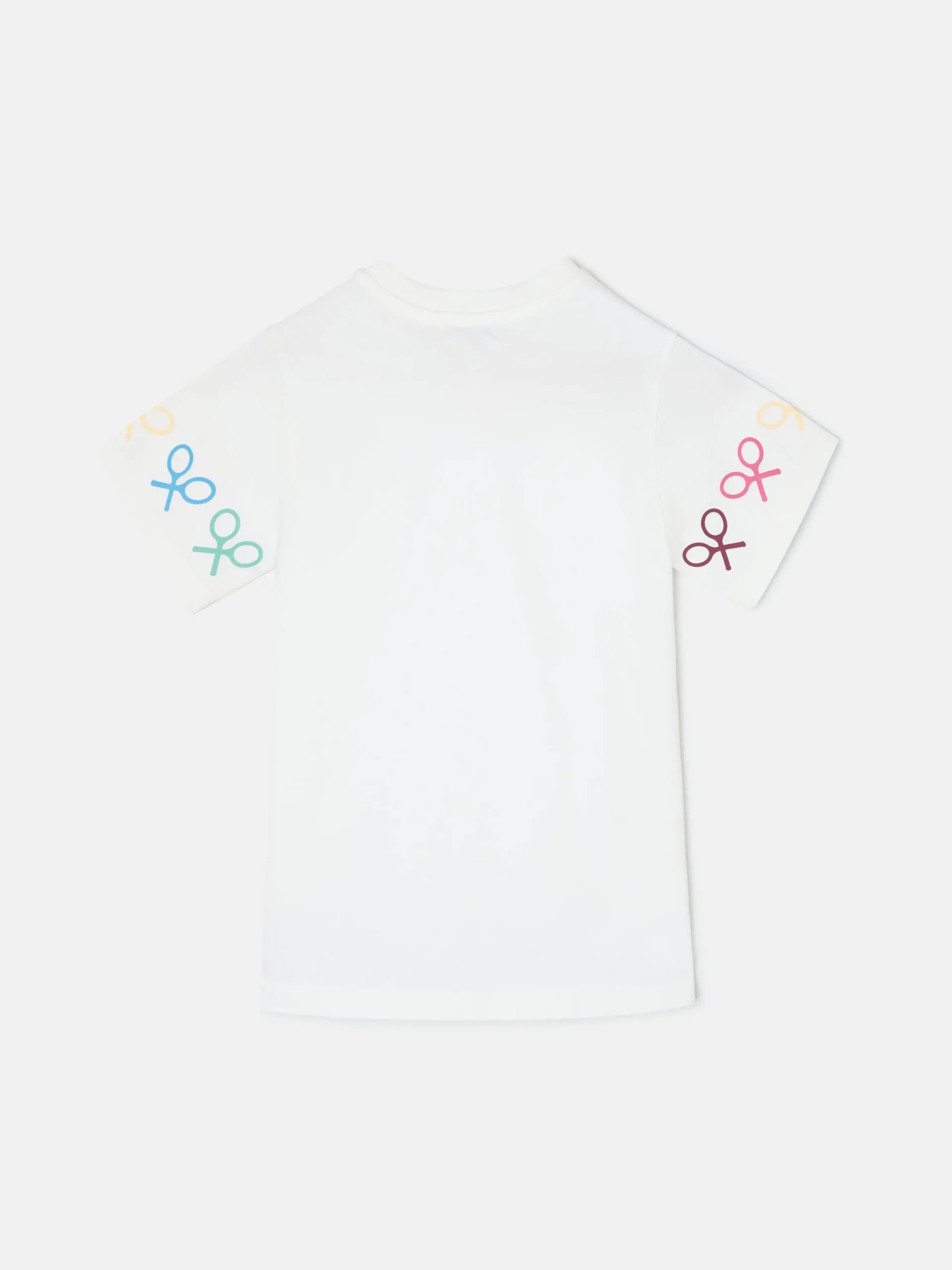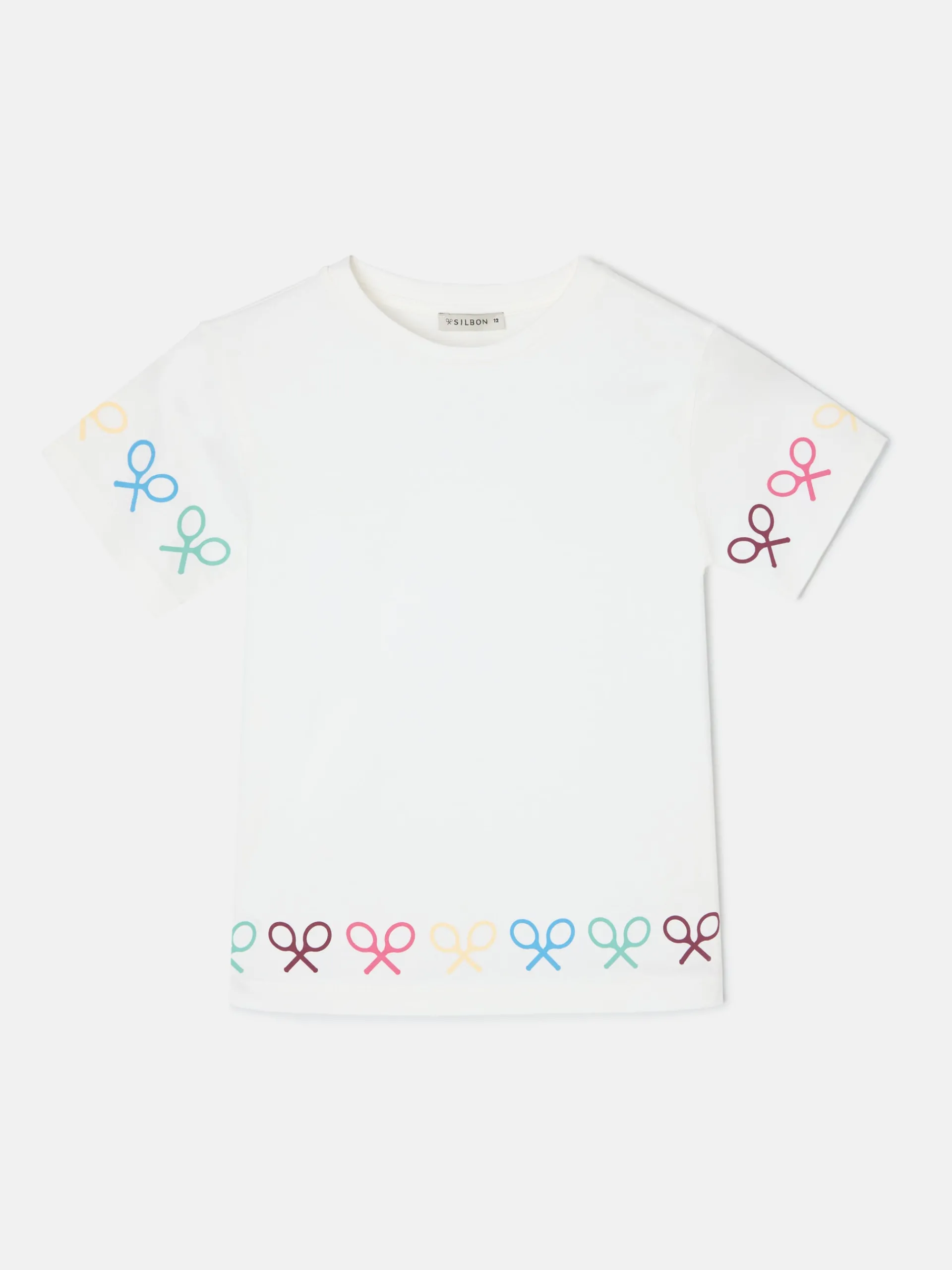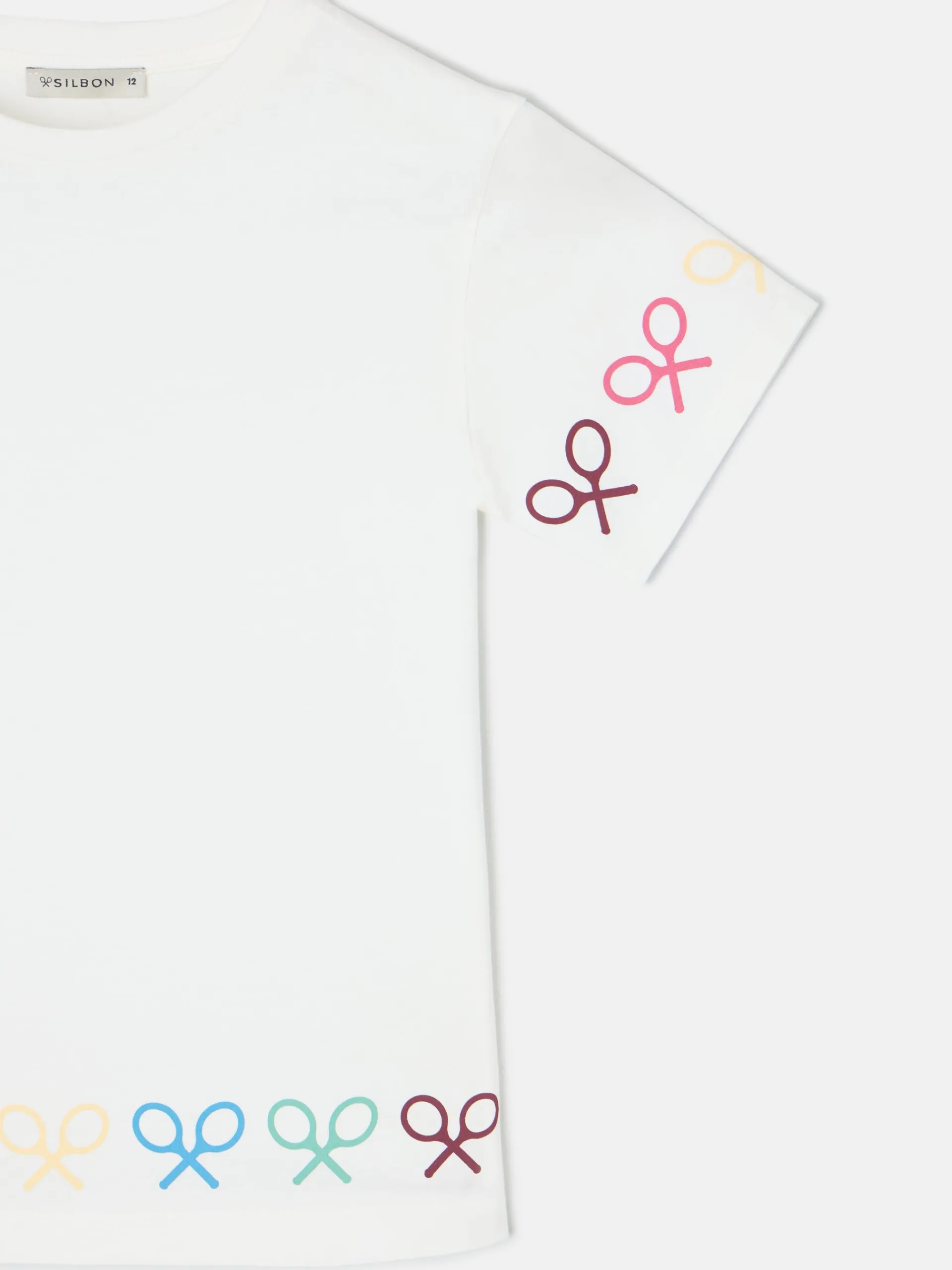 Camiseta girl blanca confeccionada en 100% algodón. Presenta print de raquetas multicolor en las mangas y en el bajo. Cuenta con cuello redondo y manga corta. Fabricada en Portugal.