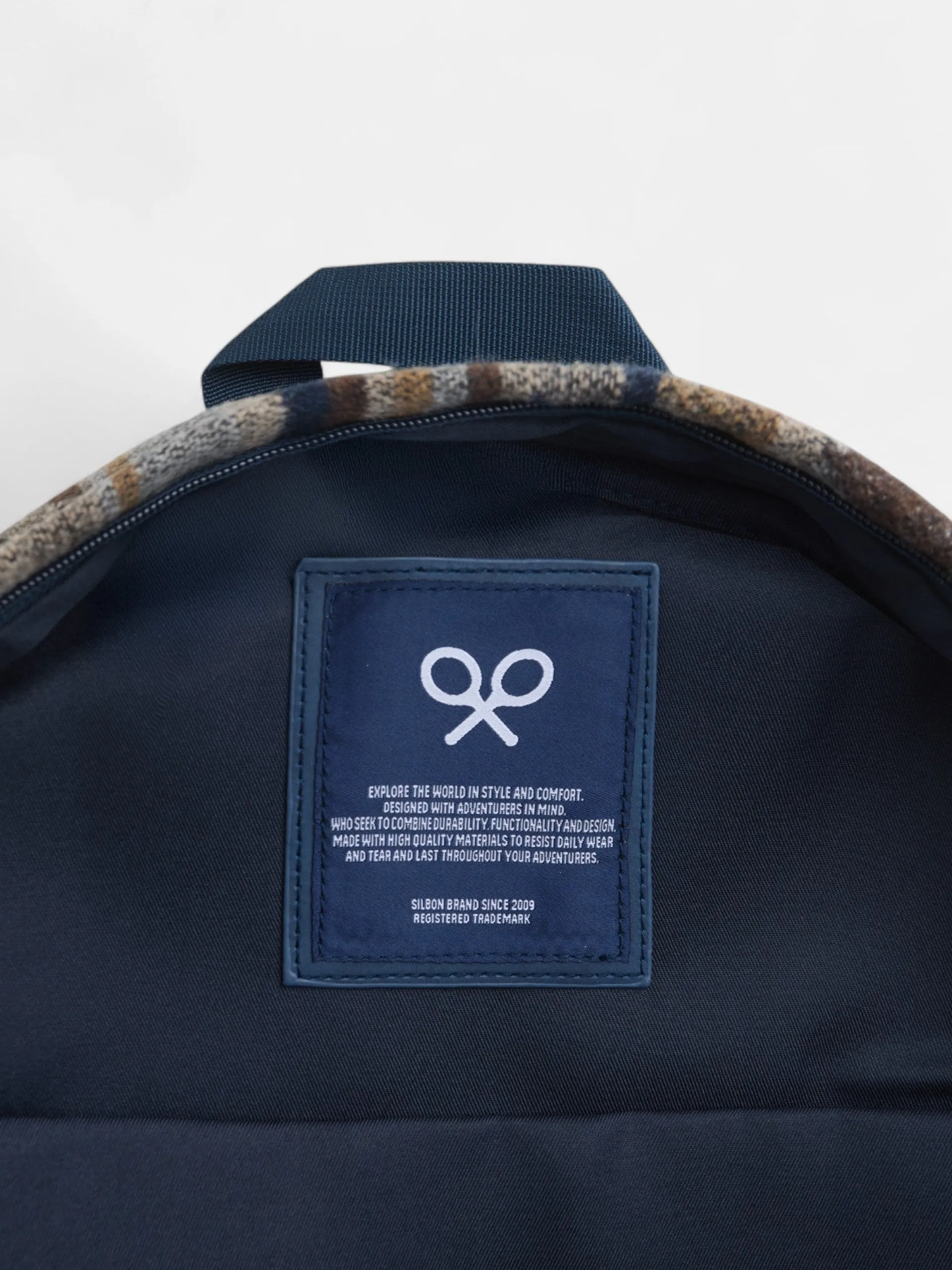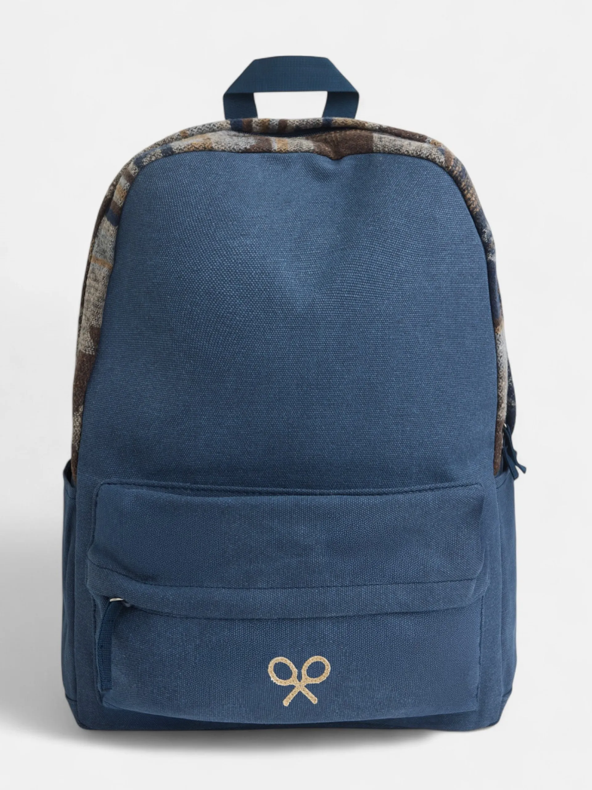 Mochila sport tejido étnico color azul marino. Presenta cierre de cremallera con tiradores personalizados. Contiene bolsillo frontal exterior con detalle de logo de raqueta en blanco en el frontal. Cuenta con franja de tejido étnico decorativa.