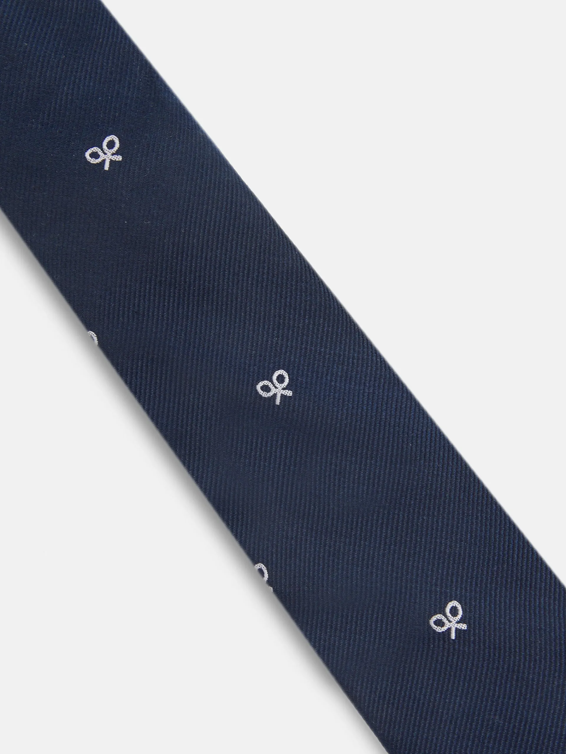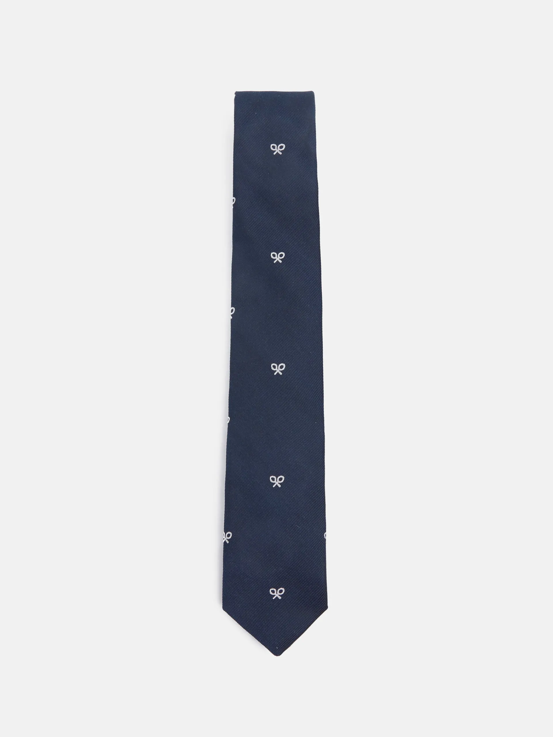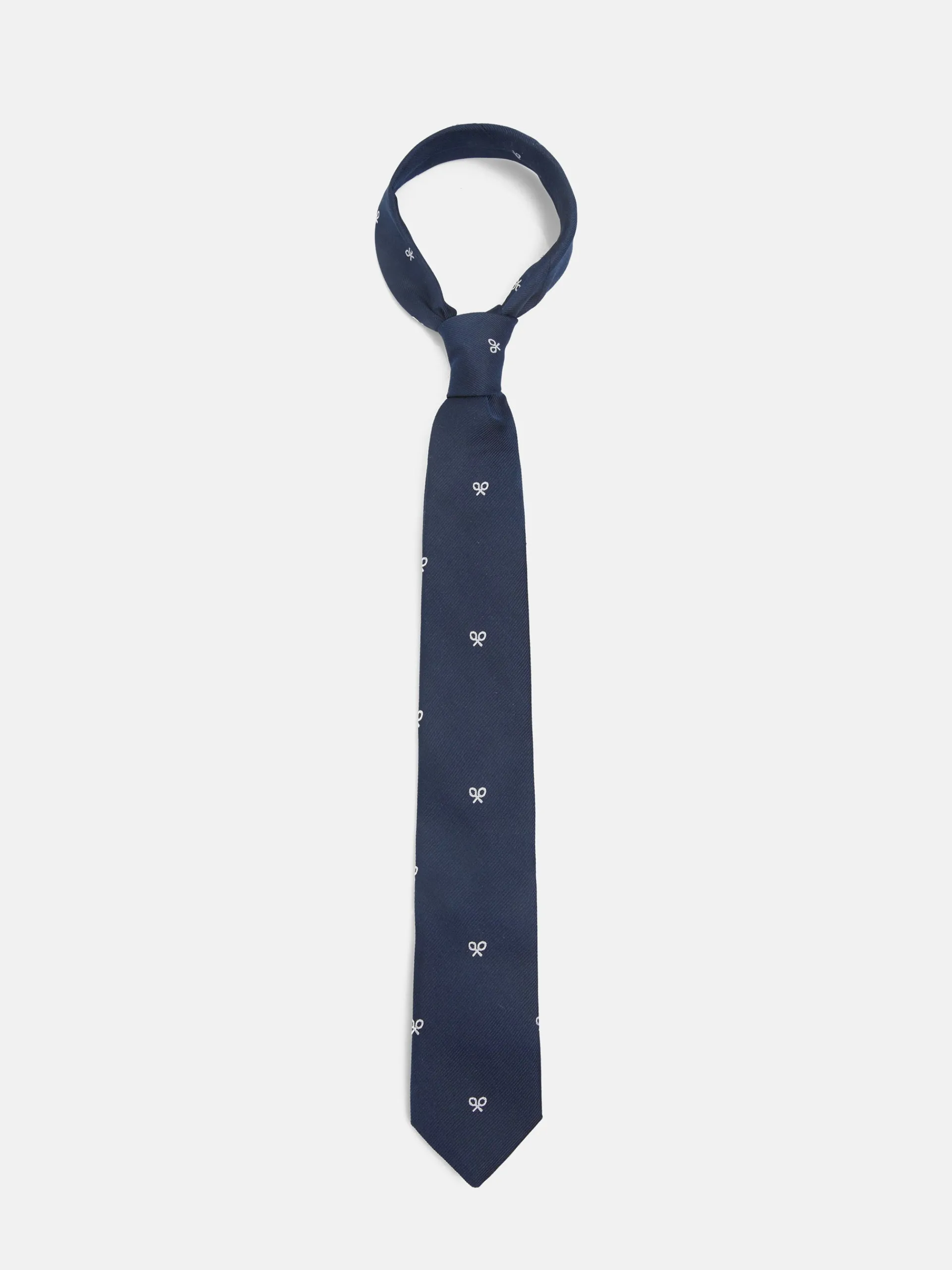 Corbata azul marino confeccionada en seda con diseño de raquetas. Incluye forro en su interior y etiqueta tejida personalizada Silbon.
