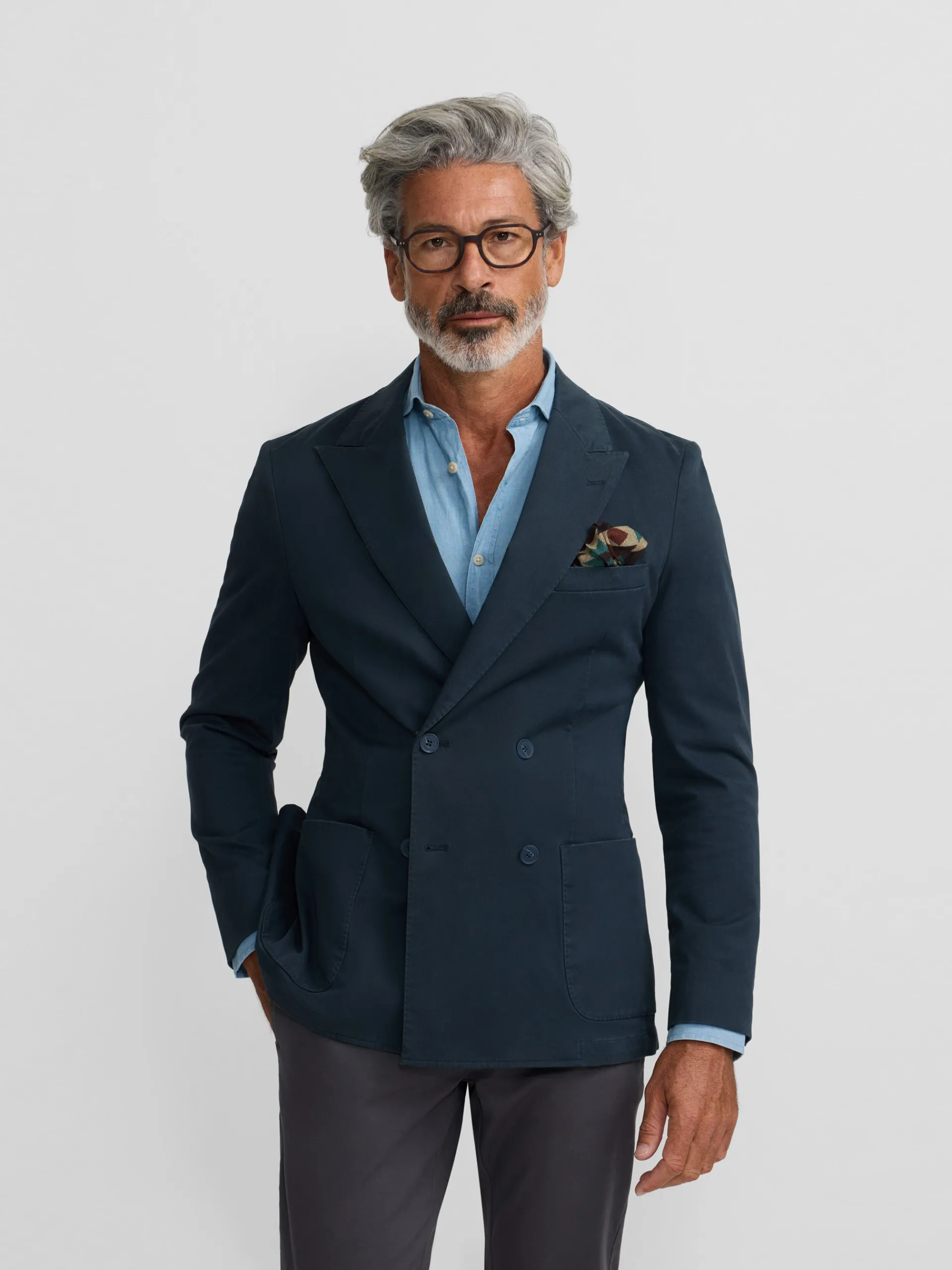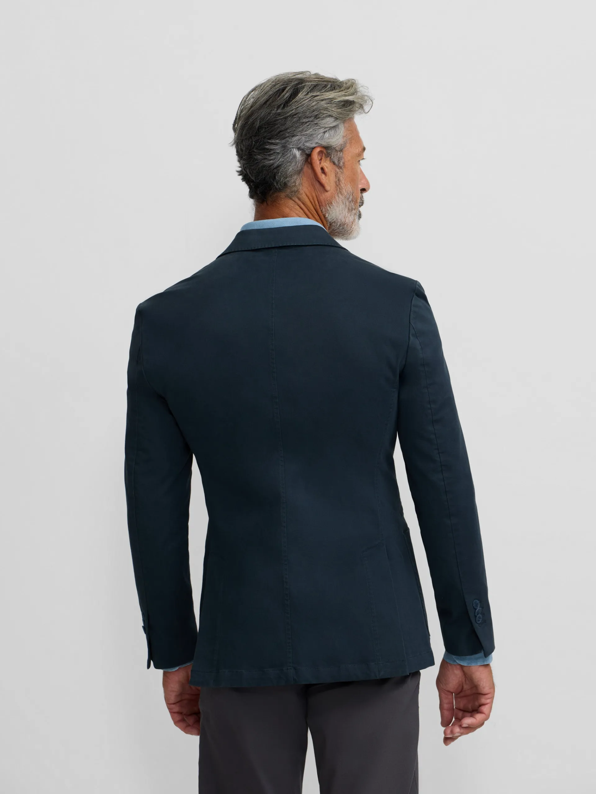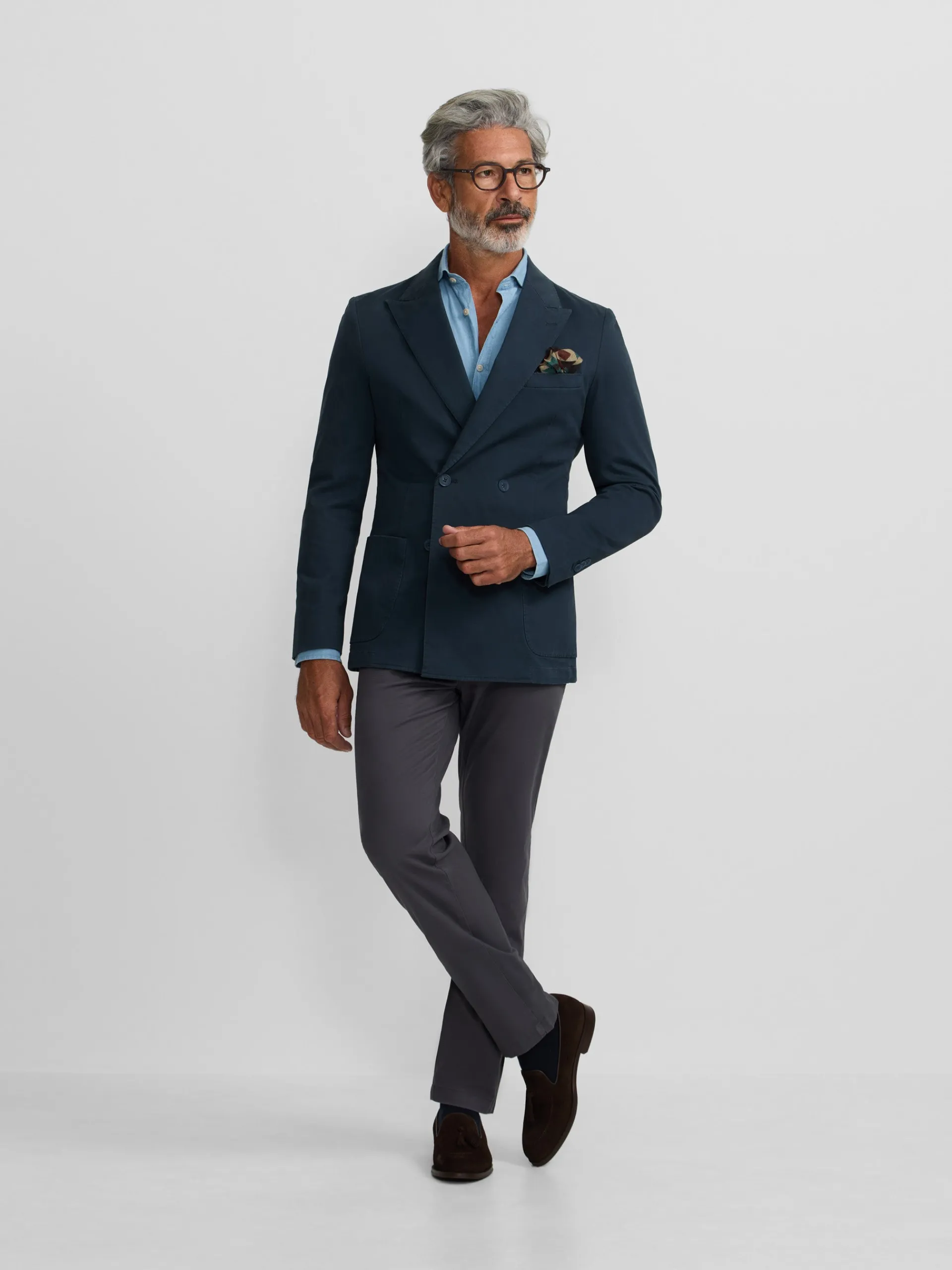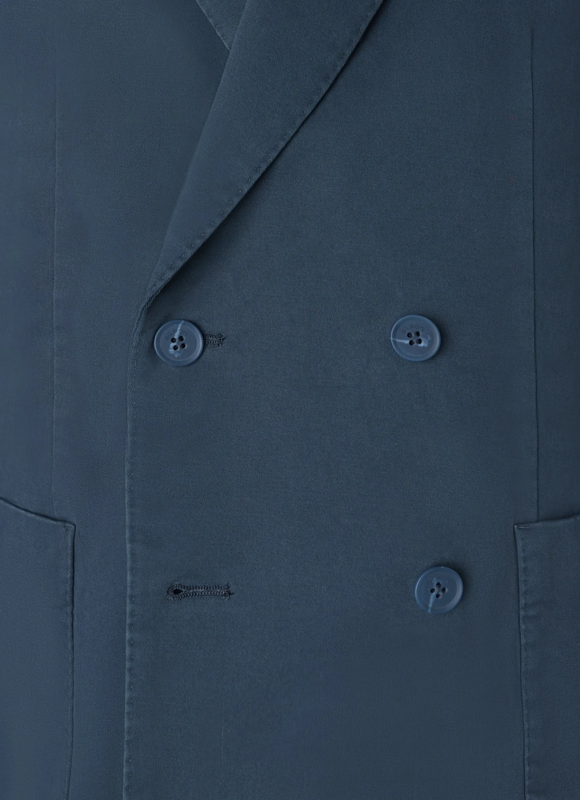 Americana casual cruzada azul confeccionada en mezcla de algodón. Presenta cierre cruzado con botones personalizados al tono, bolsillos delanteros tipo parche y bolsillo insertado en torso y mangas acabadas con ojales y botones realizables. Cuenta con cuello con solapas de punta de lanza. No contiene hombreras y no tiene forro interior.
