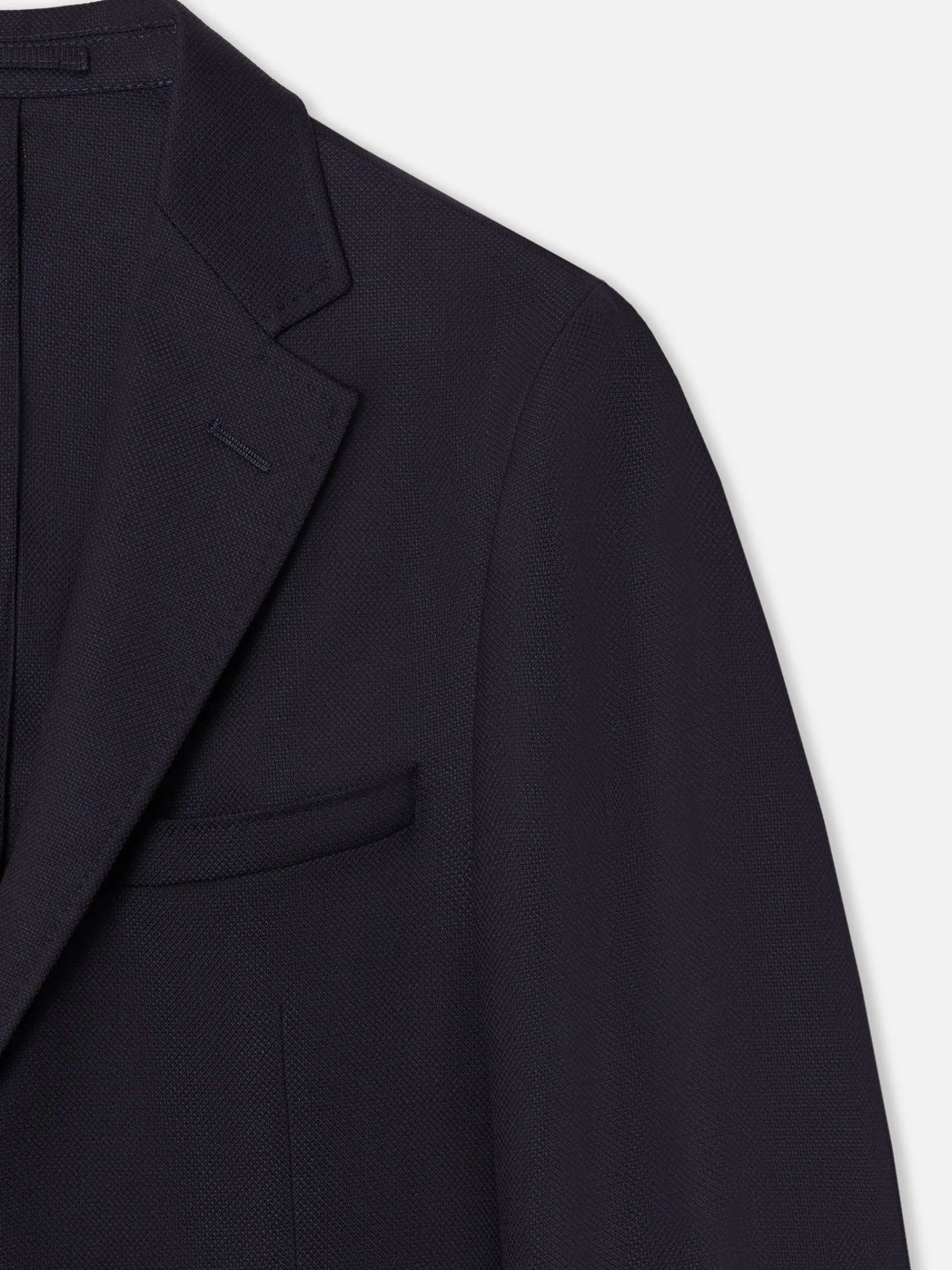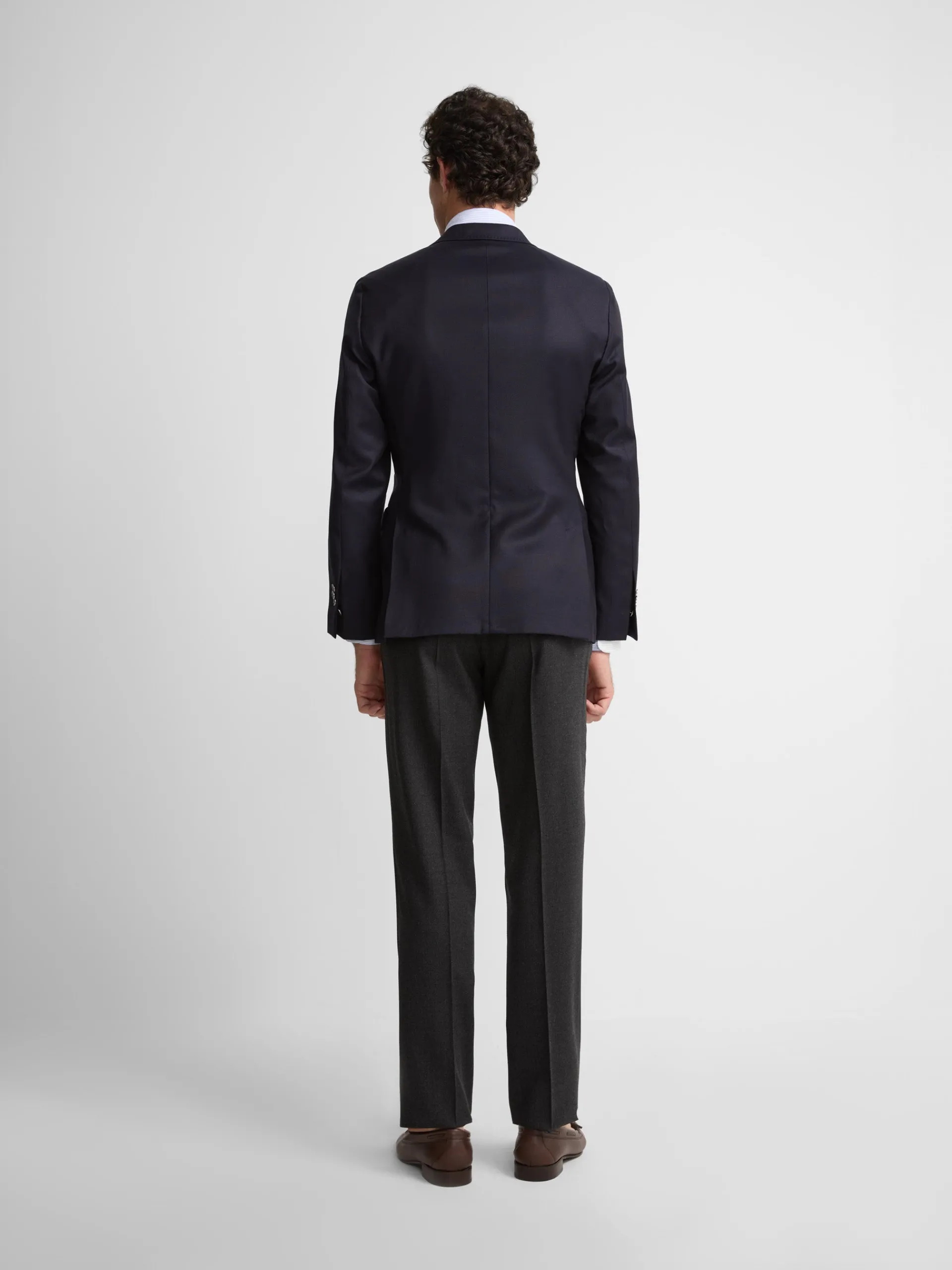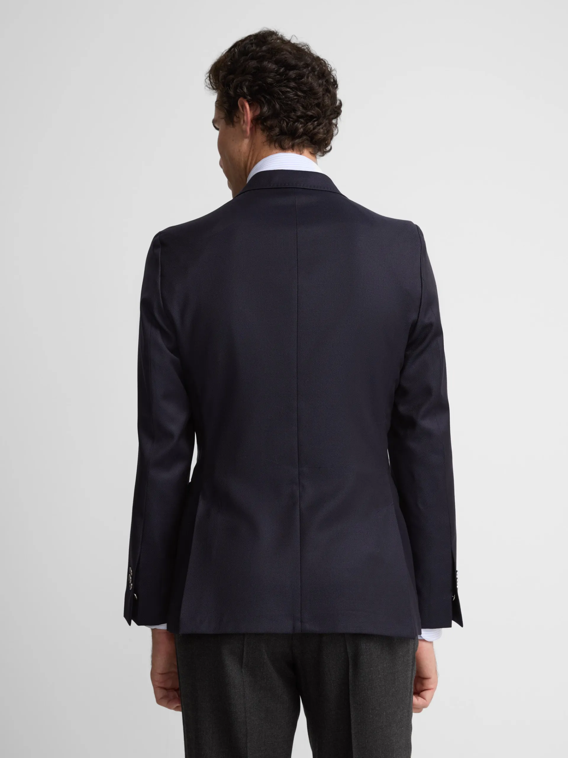 Americana de tejido realizado con pura lana extrafina super 100´ para dar vida a un hilo sutil y ligero, pero al mismo tiempo, resistente y duradero. Telar de la casa Angélico, una fábrica de tejidos de lana fundada a principios de los años 1950, fundada en la región italiana Ronco Biellese.