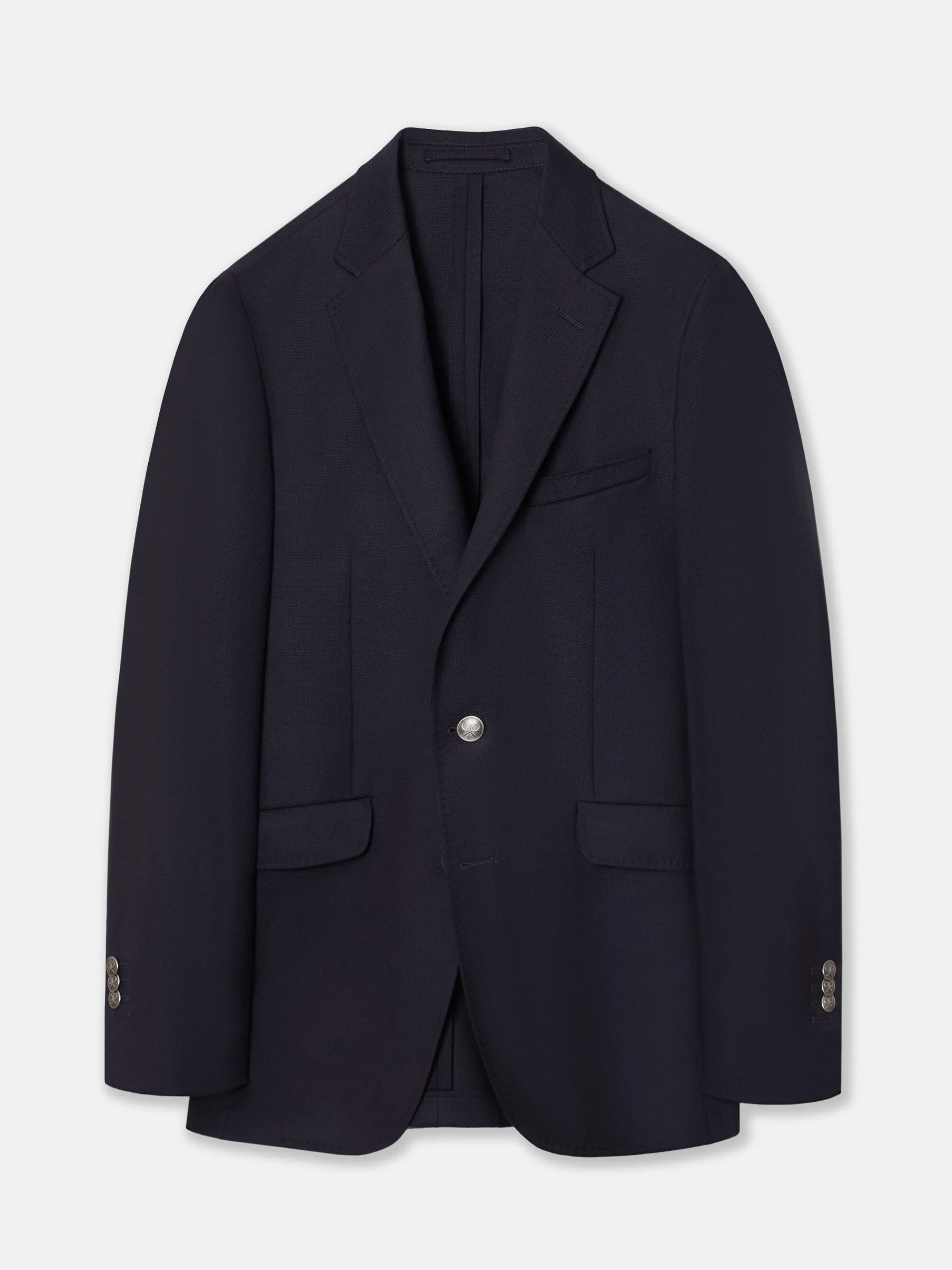 Americana clásica confeccionada en 100% lana de corte Tailored fit. Presenta cierre recto con botones metálicos personalizados, bolsillos delanteros de solapa, bolsillo insertado en torso y mangas acabadas con ojales y botones realizables. Cuenta con cuello con solapas de muesca, hombreras y no contiene forro. Fabricado en Portugal.