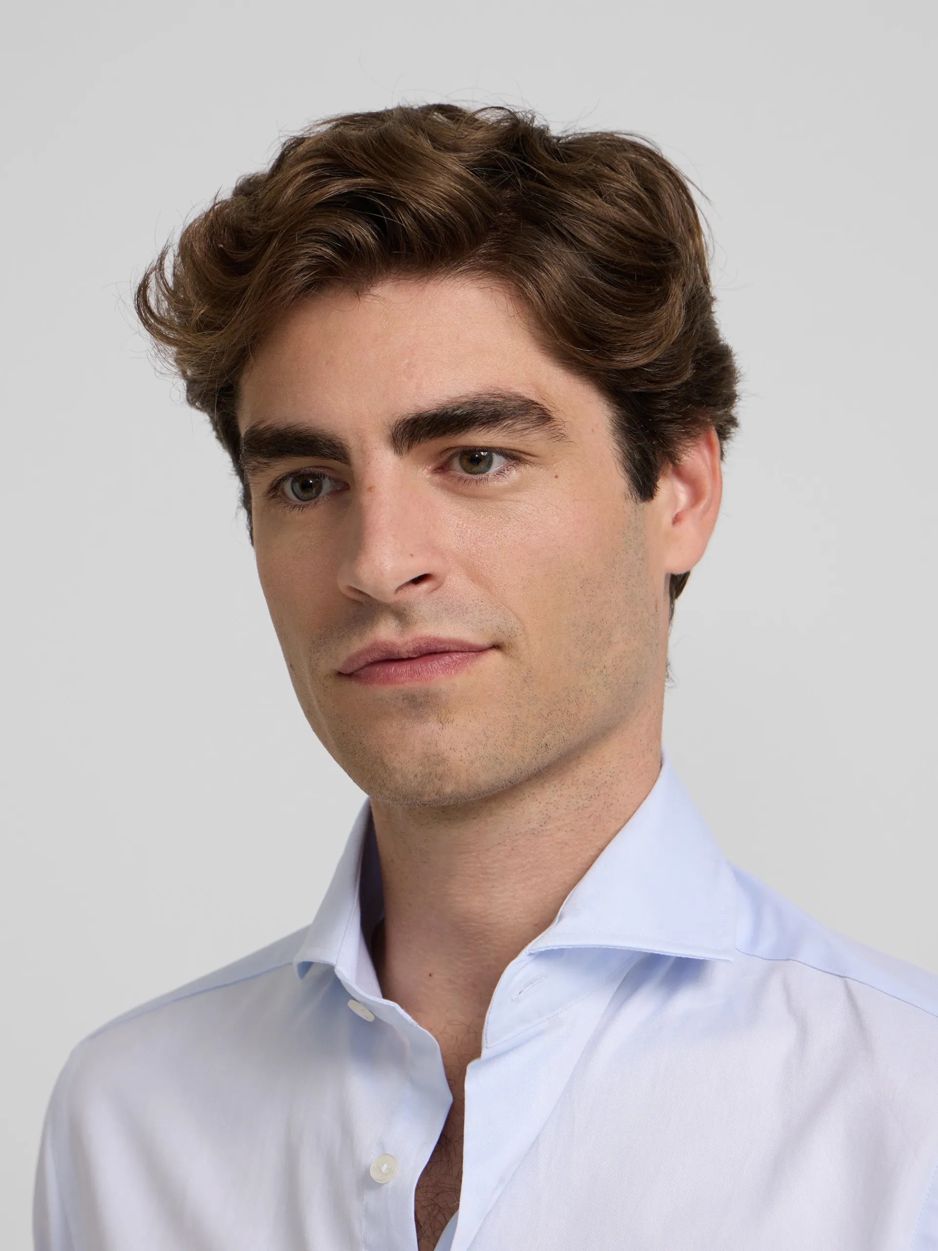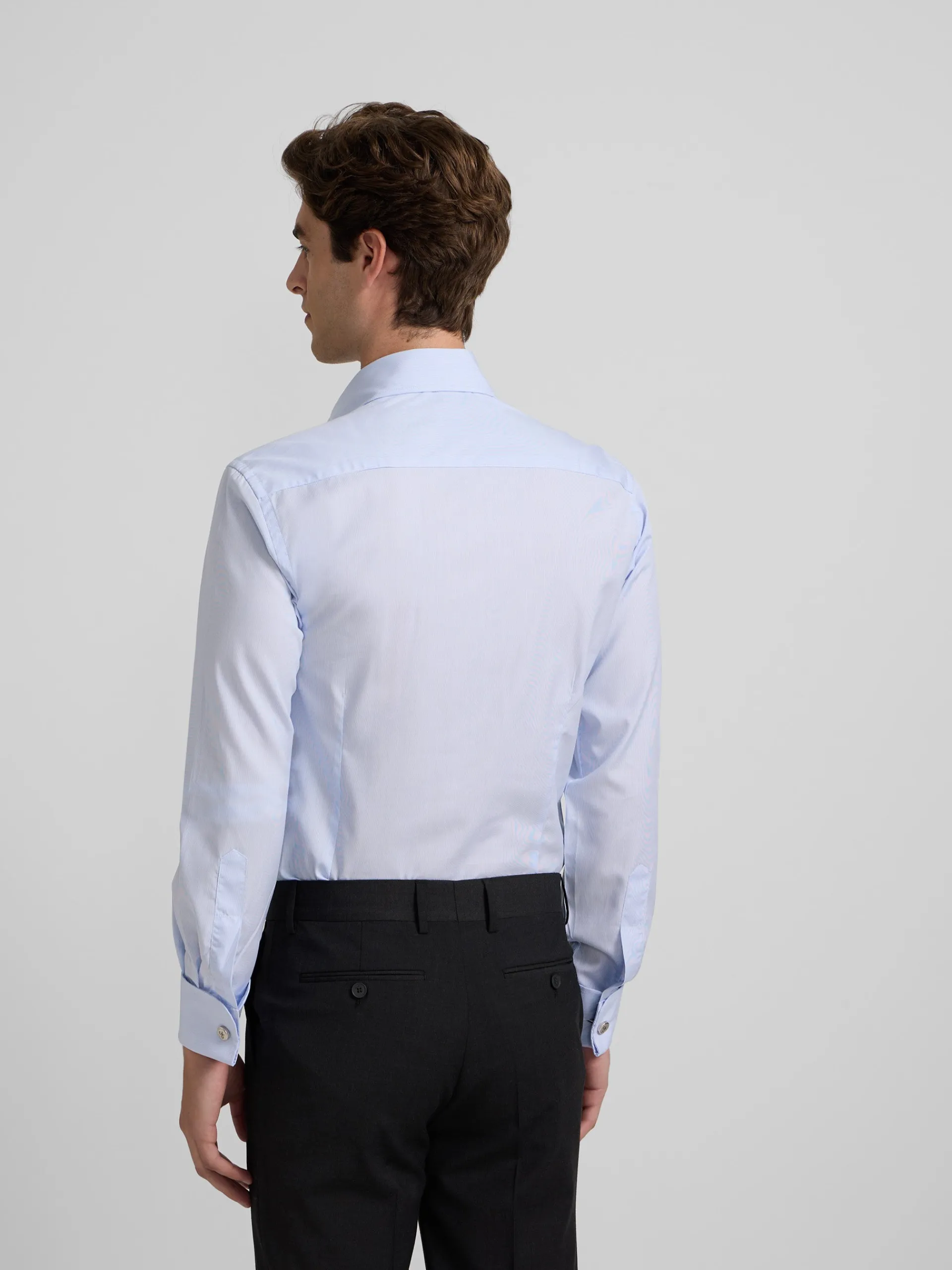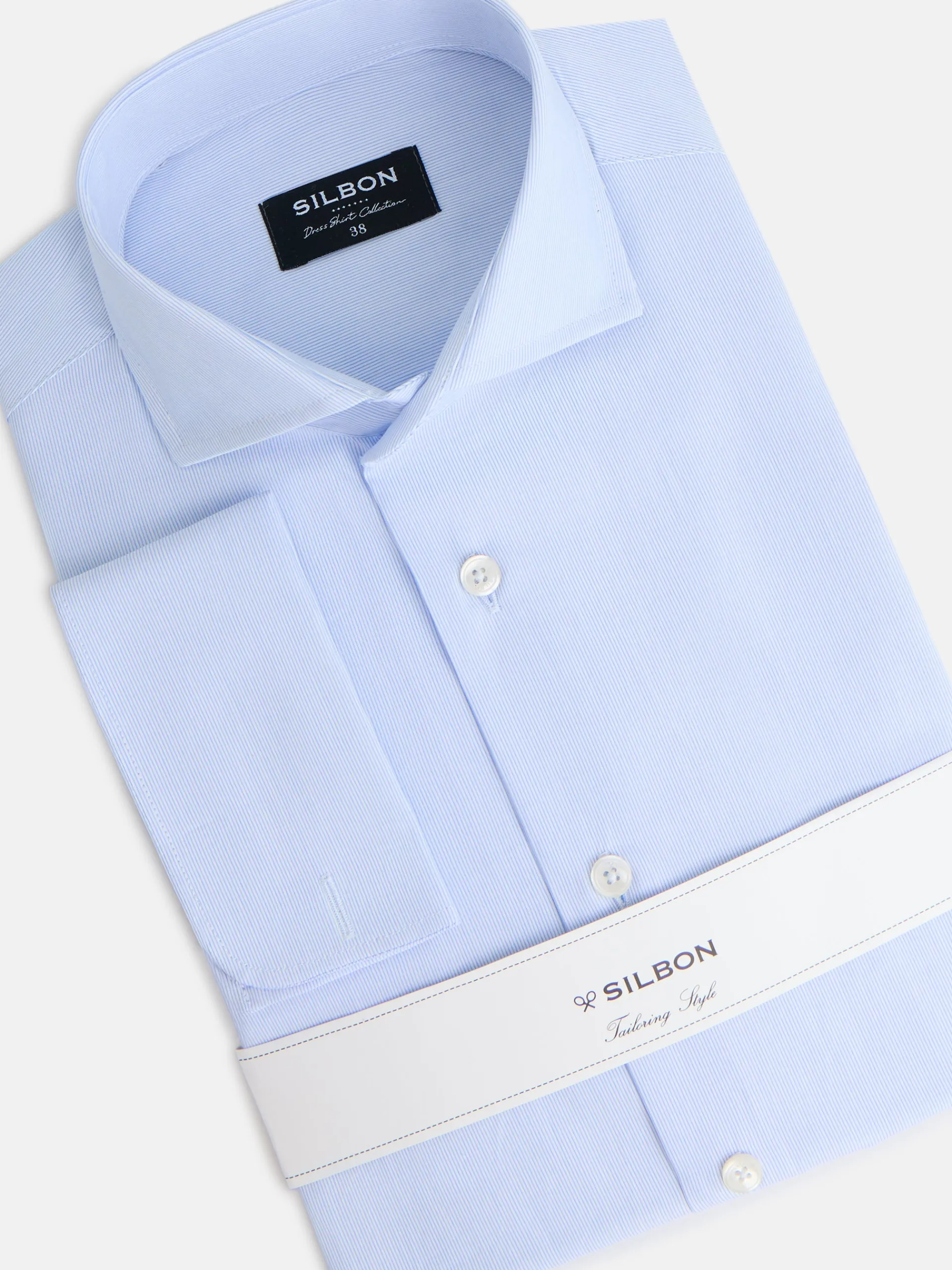 Camisa de vestir confeccionada en 100% algodón con pequeñas rayas azules con patrón «Slim fit», cuello cutaway y puño doble para gemelos. Cuenta con personalizado de raquetas bordadas en la tapeta y botones personalizados Silbon. Fabricada en España.