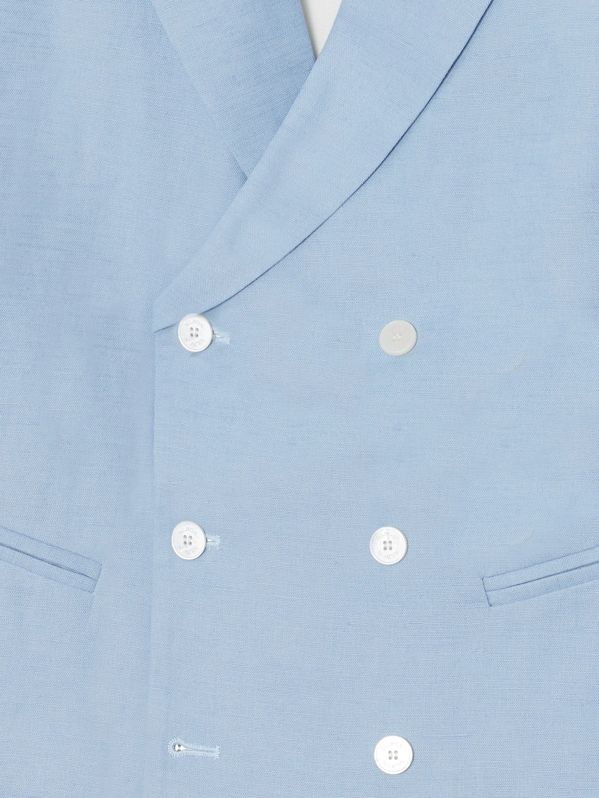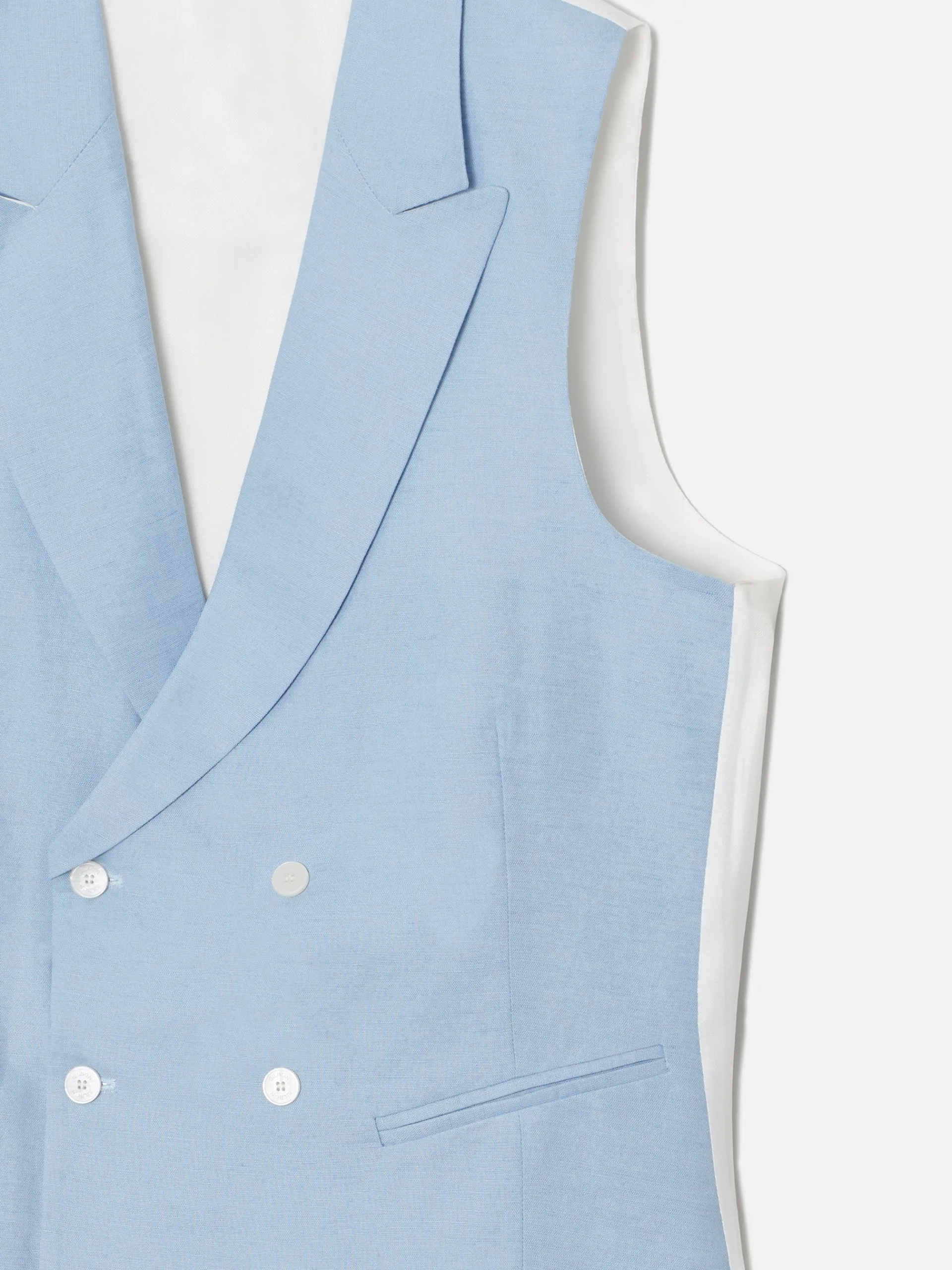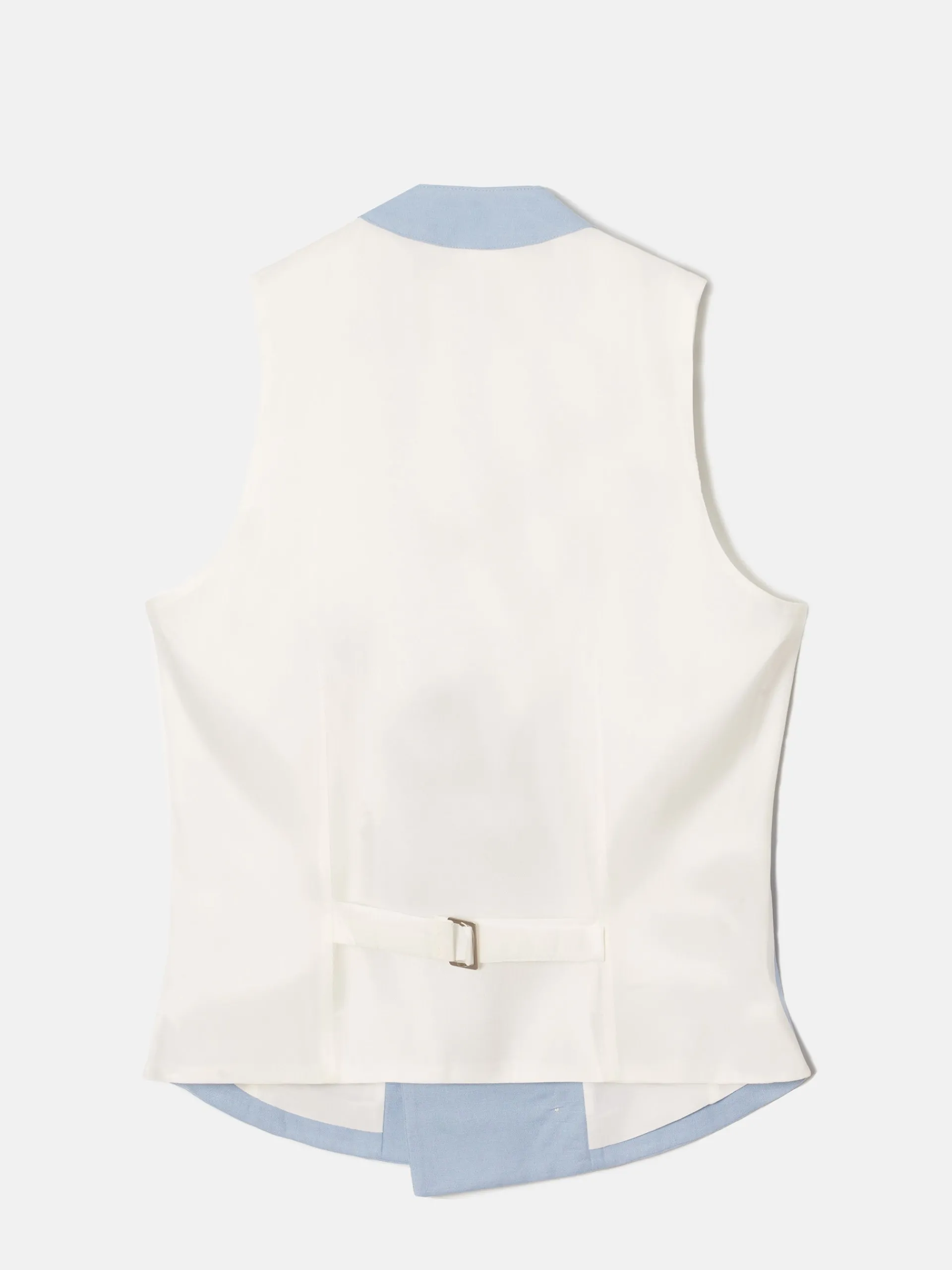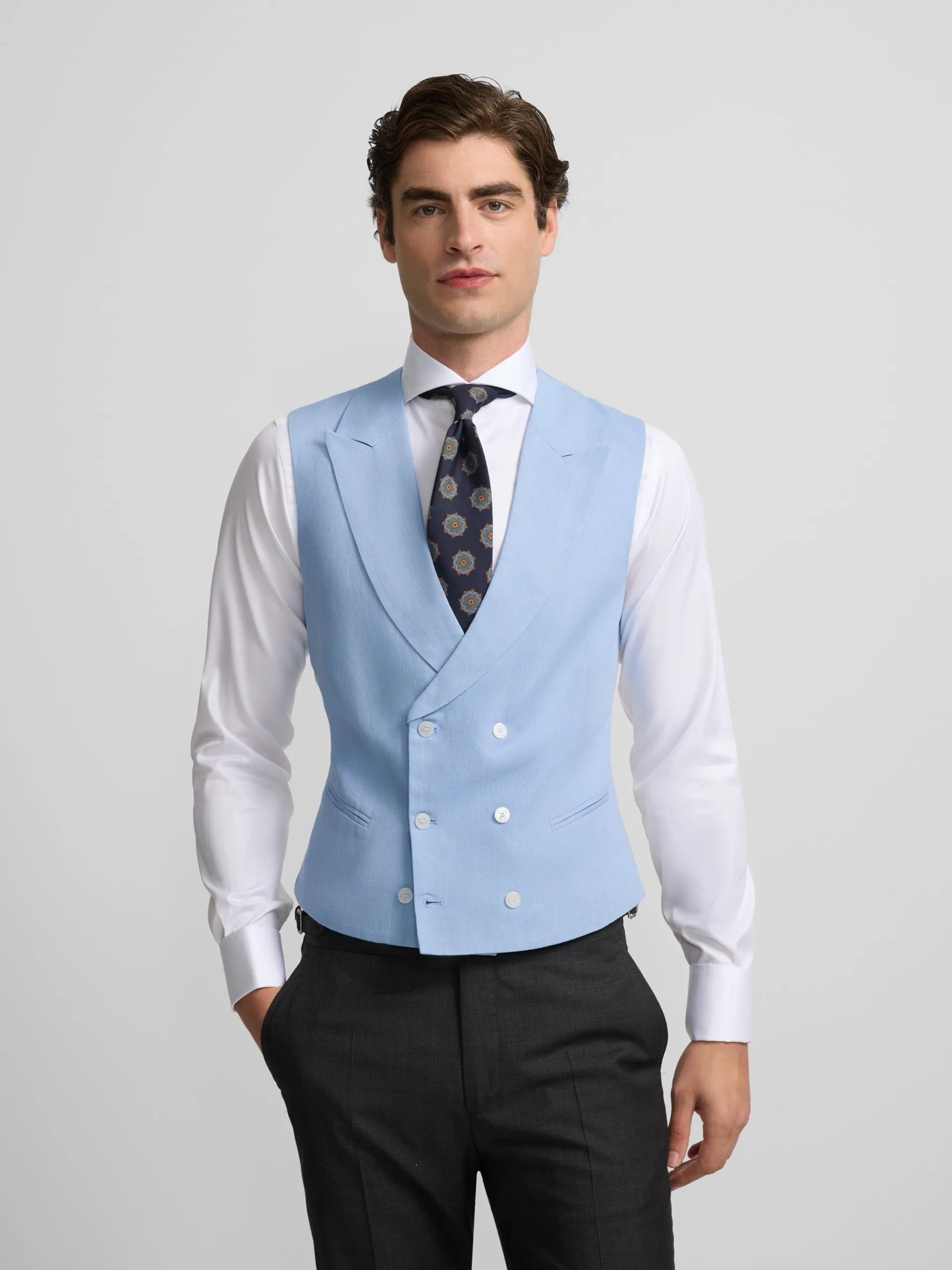 Chaleco de vestir azul confeccionado en mezcla de lino y algodón, de corte clásico y forro blanco con ajustable metálico. Este chaleco presenta solapas con forma de punta de lanza y cierre cruzado con seis botones personalizados de color blanco nacarado. Fabricado en España.