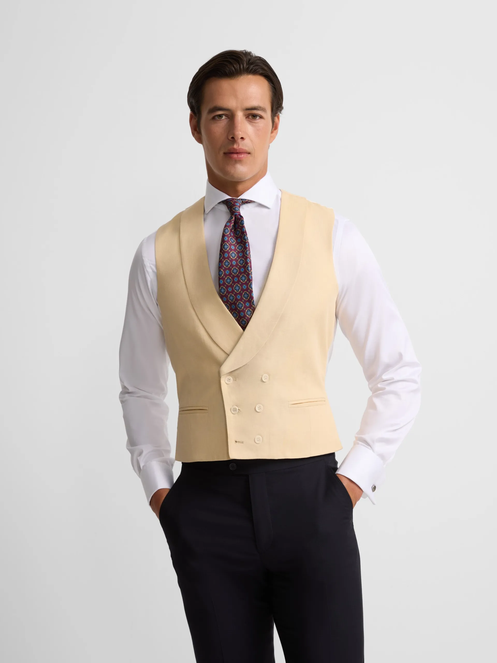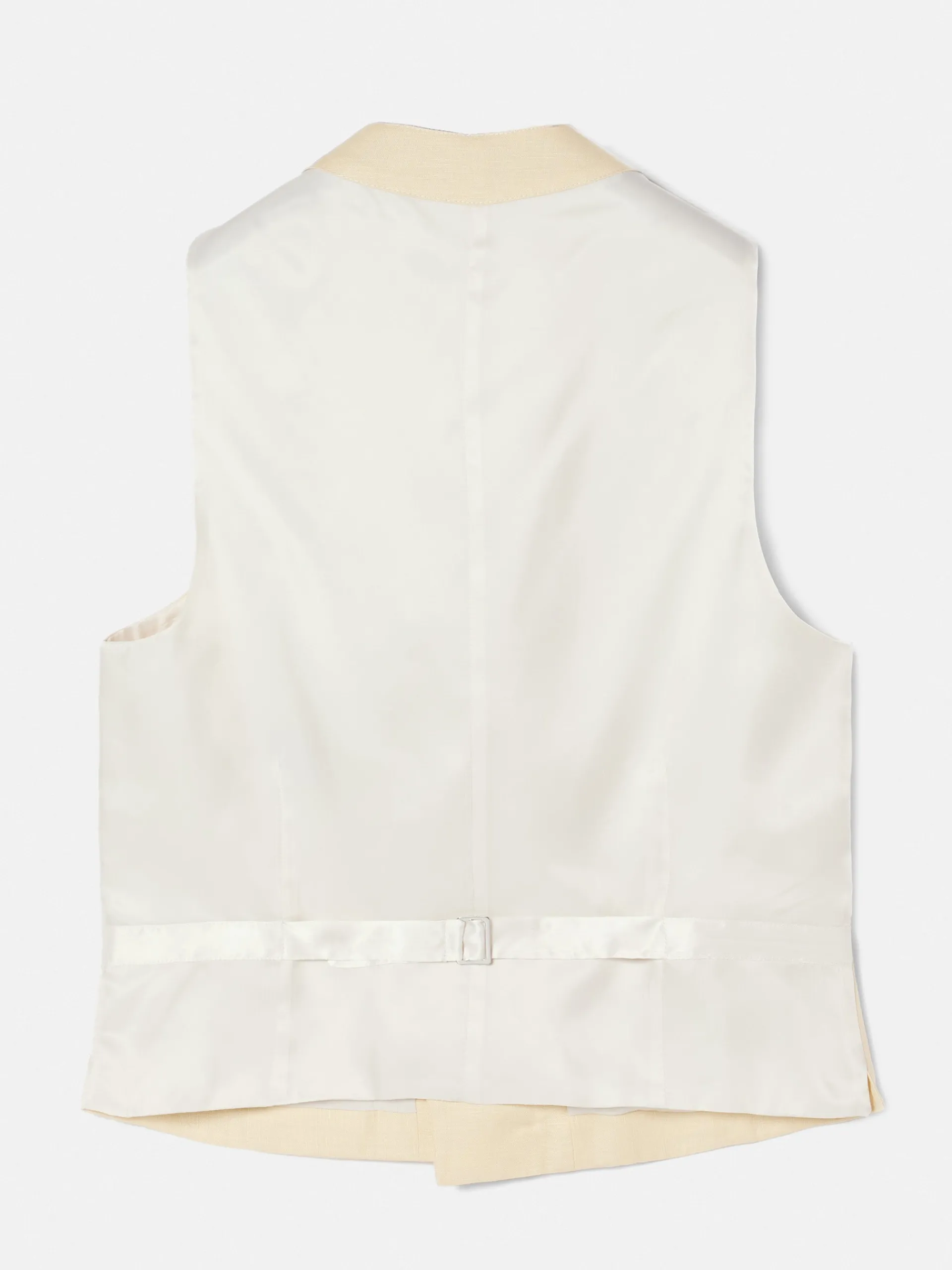 Chaleco de ceremonia de corte clásico de color camel confeccionado en mezcla de algodón y lino con microestructura. Este chaleco presenta solapas en forma redondeada, un punto de quiebre bajo y cierre cruzado con seis botones efecto nacarado. Cuenta con forro blanco roto con ajustable.