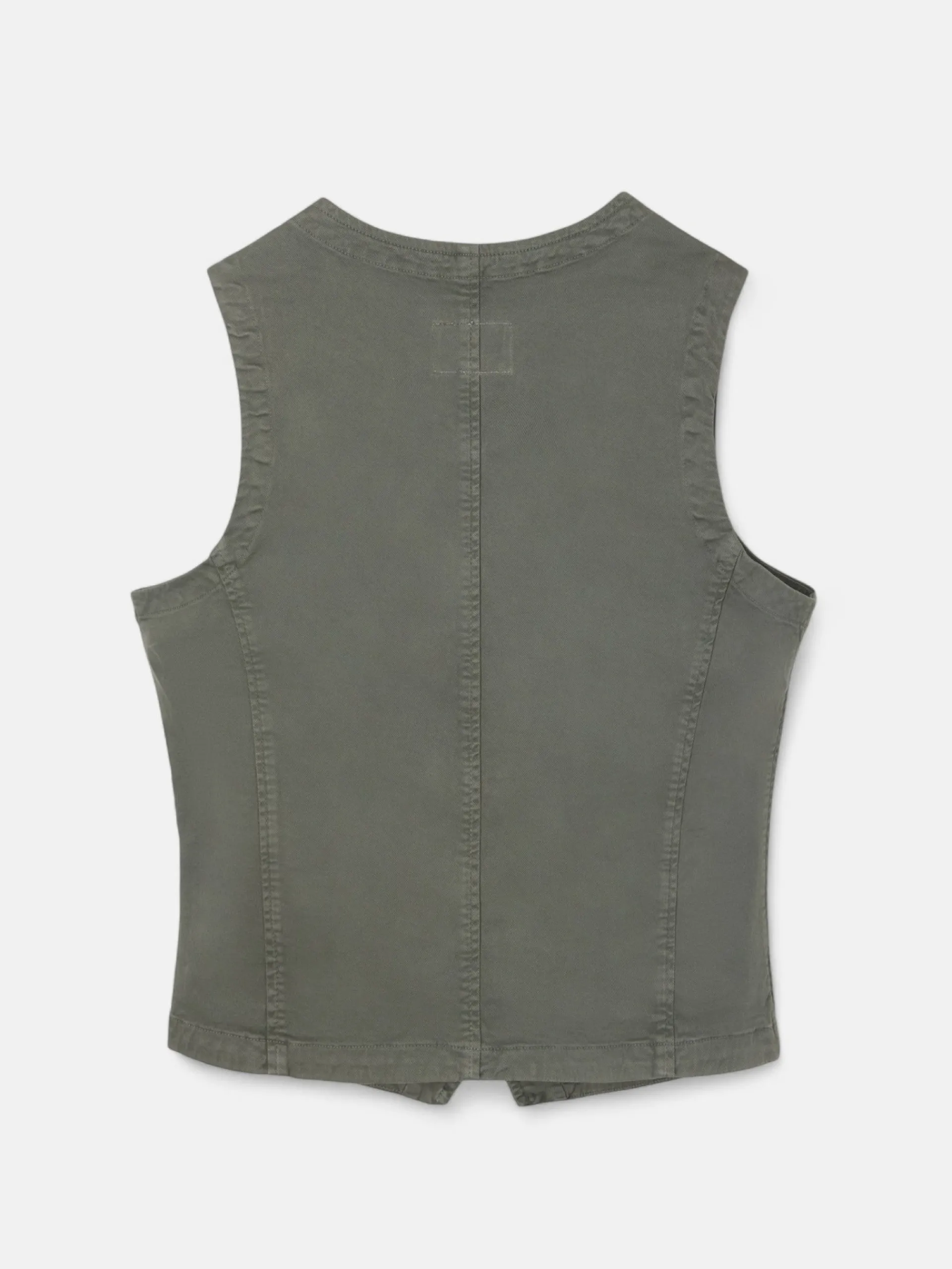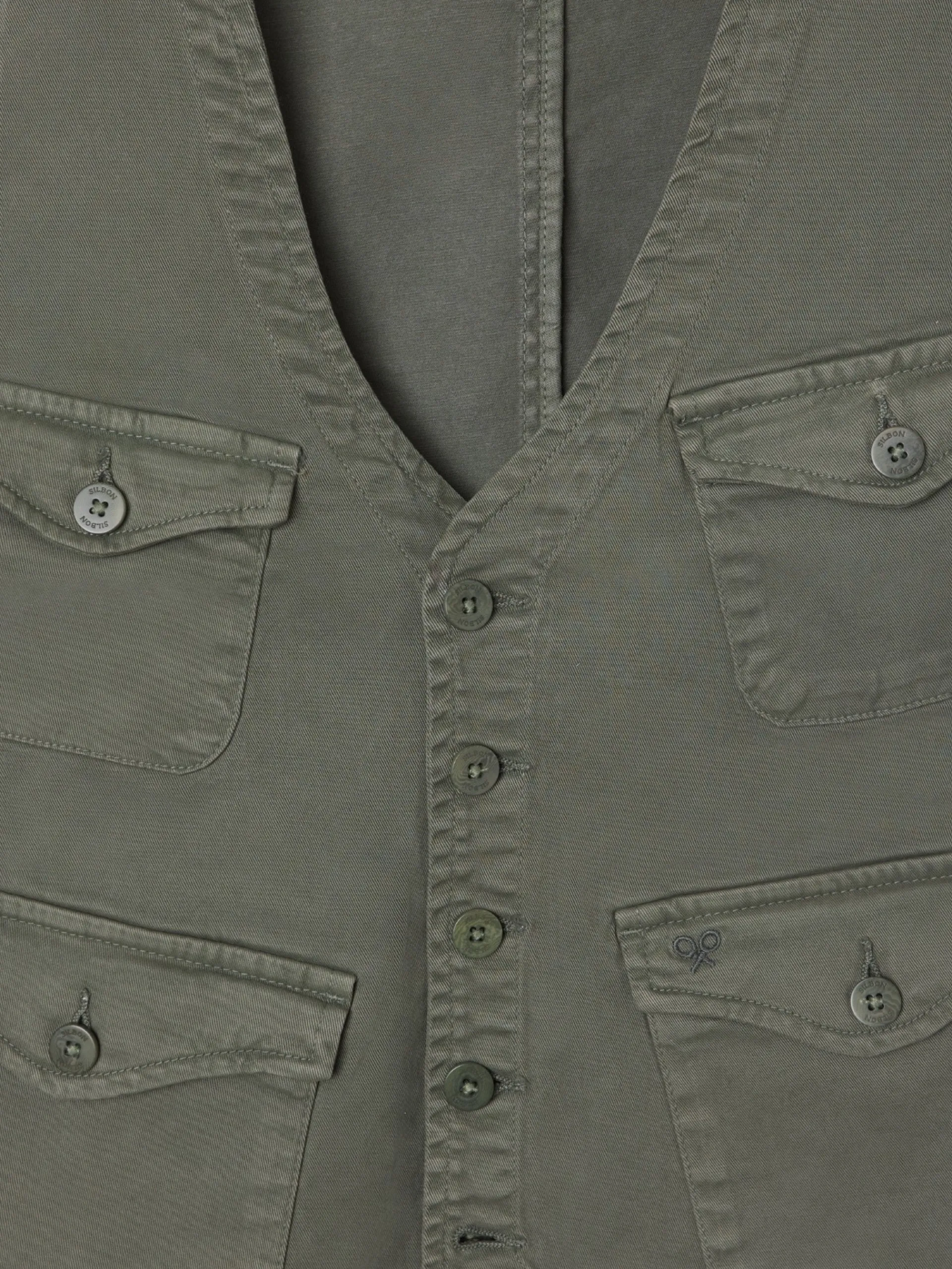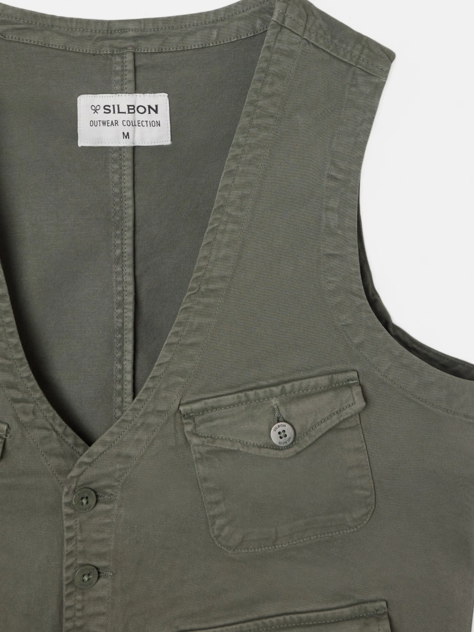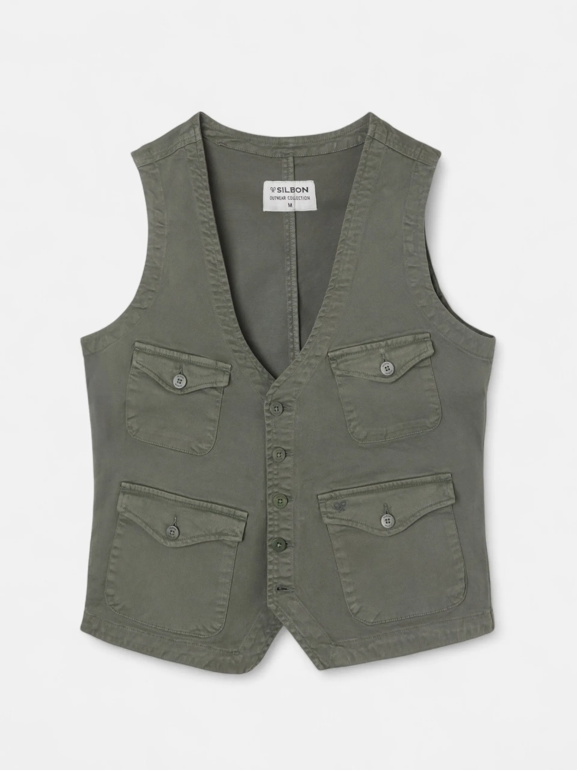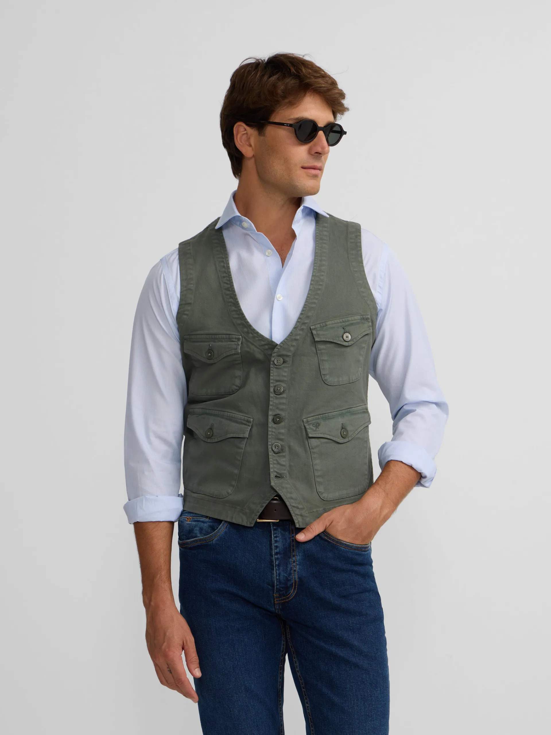 Chaleco multibolsillos en color verde confeccionado en 100% algodón. Presenta cierre frontal mediante botonadura y cuatro bolsillos tipo parche con botón en el torso. Cuenta con el cuello en forma de pico y no tiene mangas.