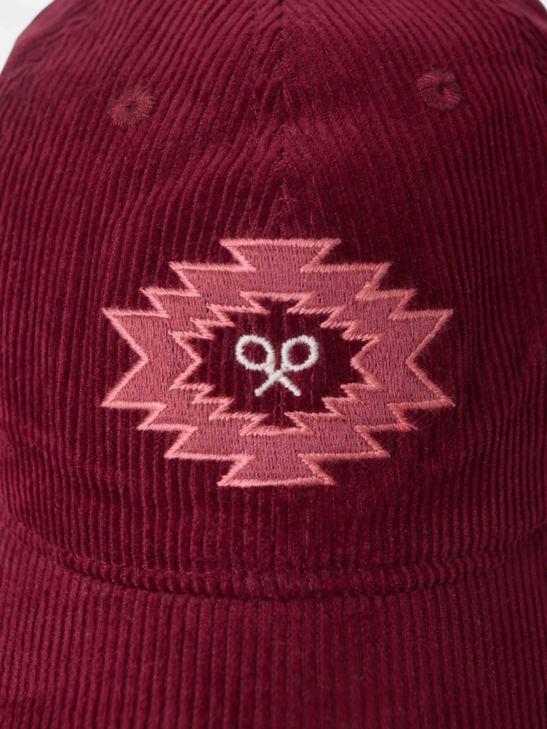Gorra girl de pana color burdeos confeccionada en 100% algodón. Cuenta con bordado frontal de motivo étnico en color rosa.