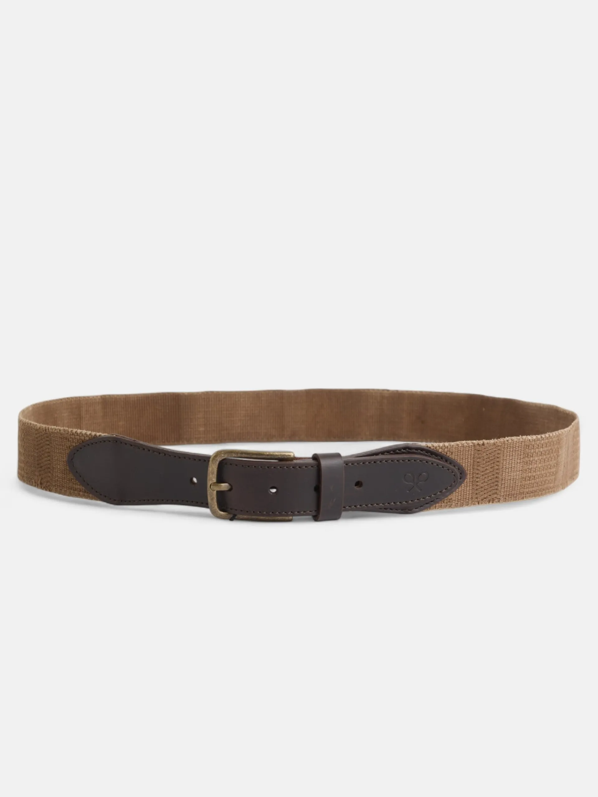 Cinturón de piel y lona beige medio. Presenta cierre con trabilla y hebilla metálica personalizada en color oro viejo. Cuenta con raquetas grabadas en el extremo. Fabricado en España.