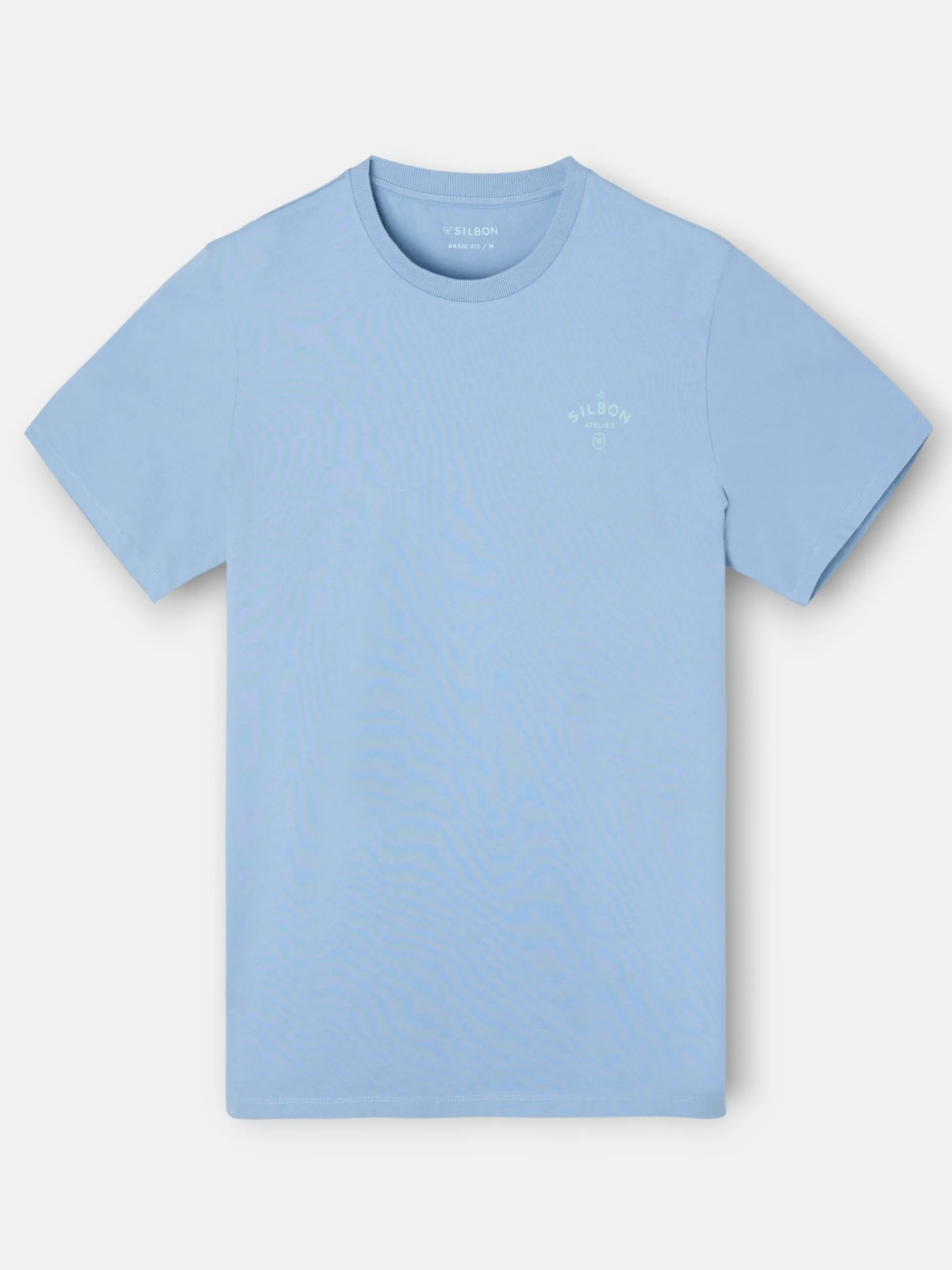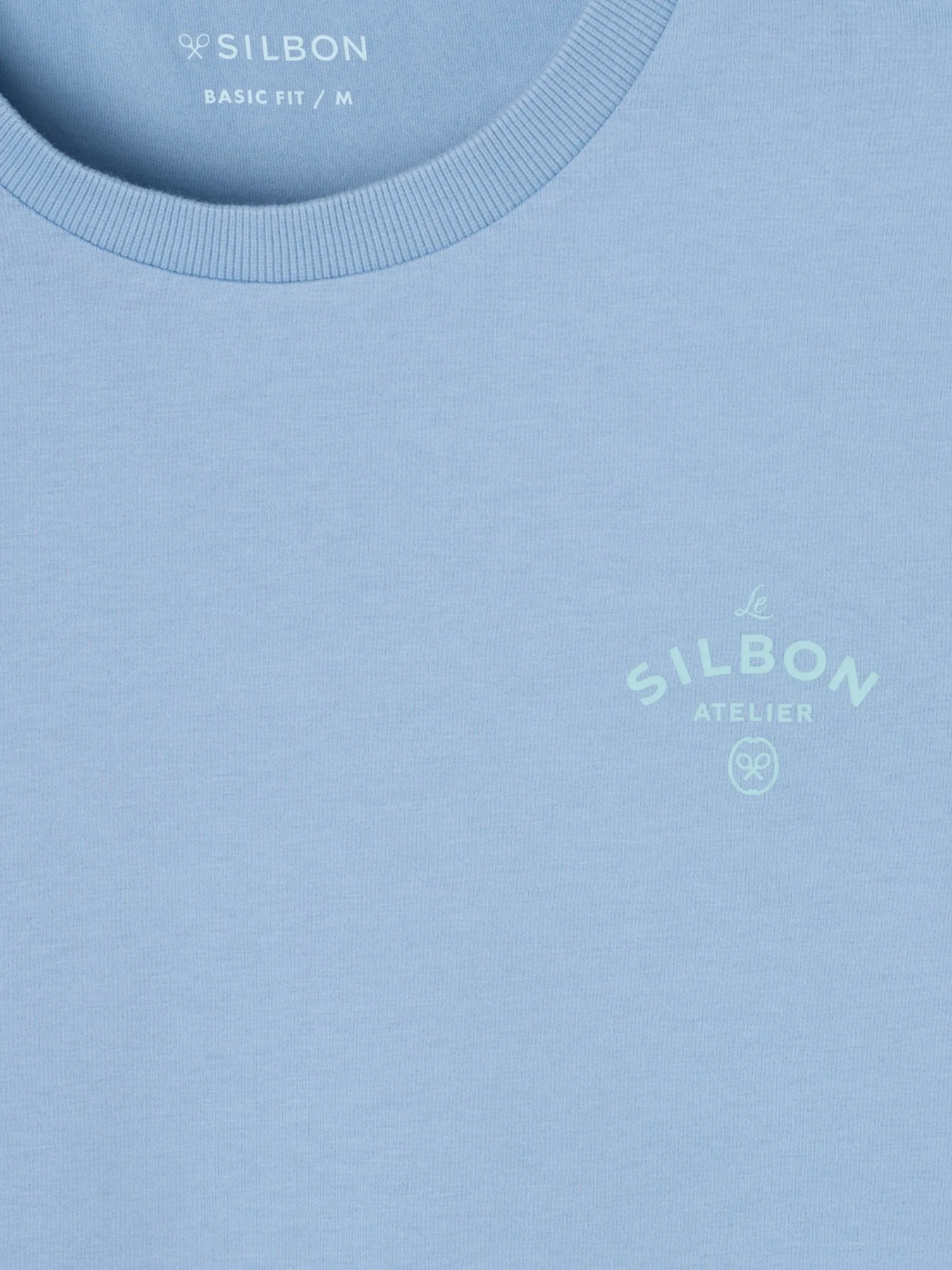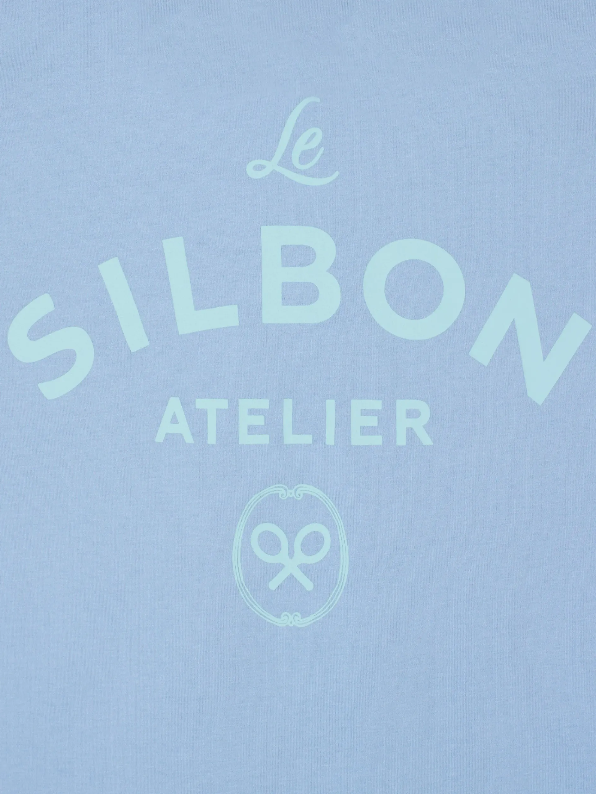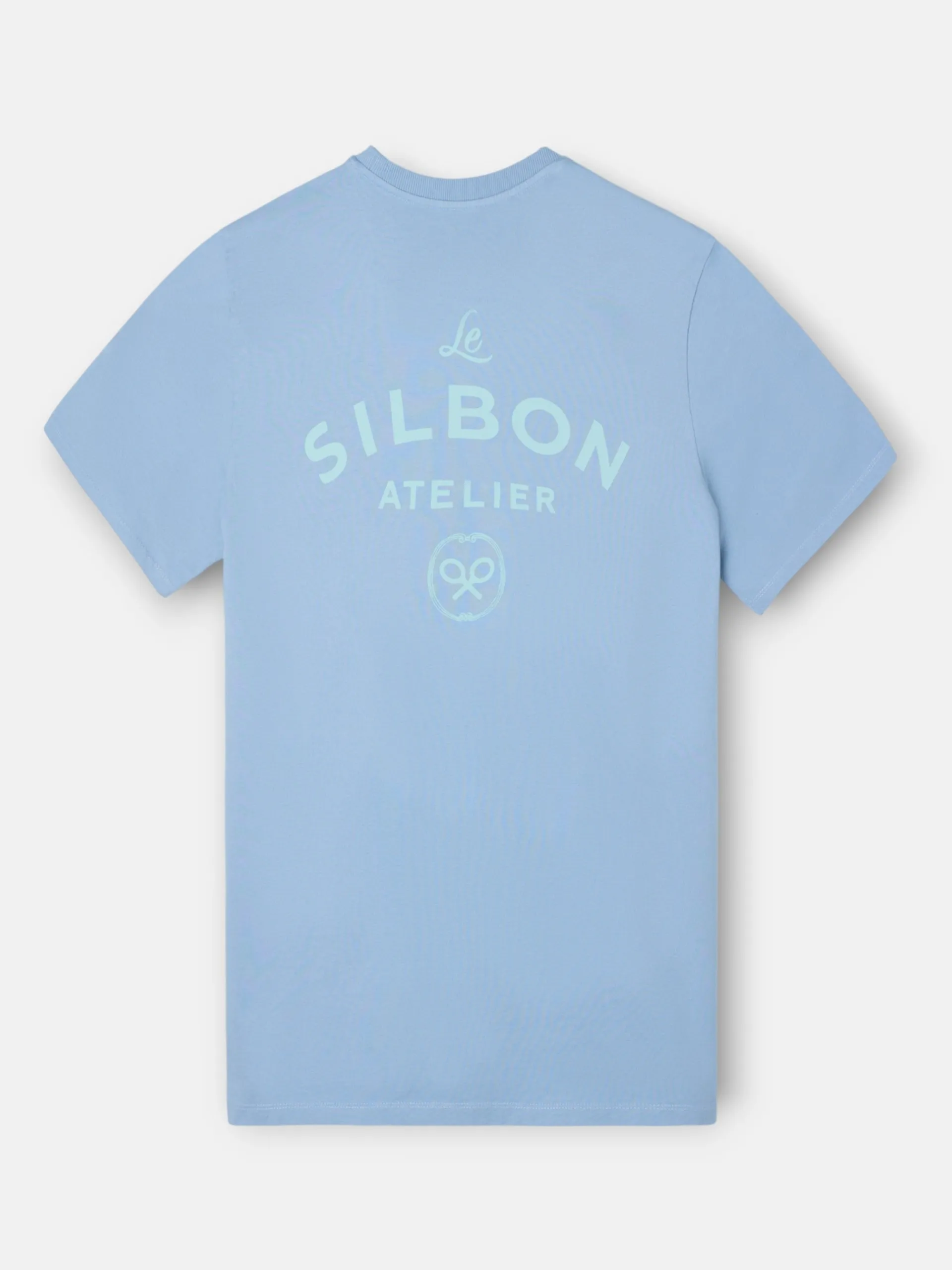 Camiseta atelier azul confeccionada en 100% algodón de corte Regular Fit. Presenta cuello redondo y manga corta. Cuenta con print de de diseño «Silbon Atelier» a contraste en la espalda y pequeño print en el torso. Fabricada en Portugal.