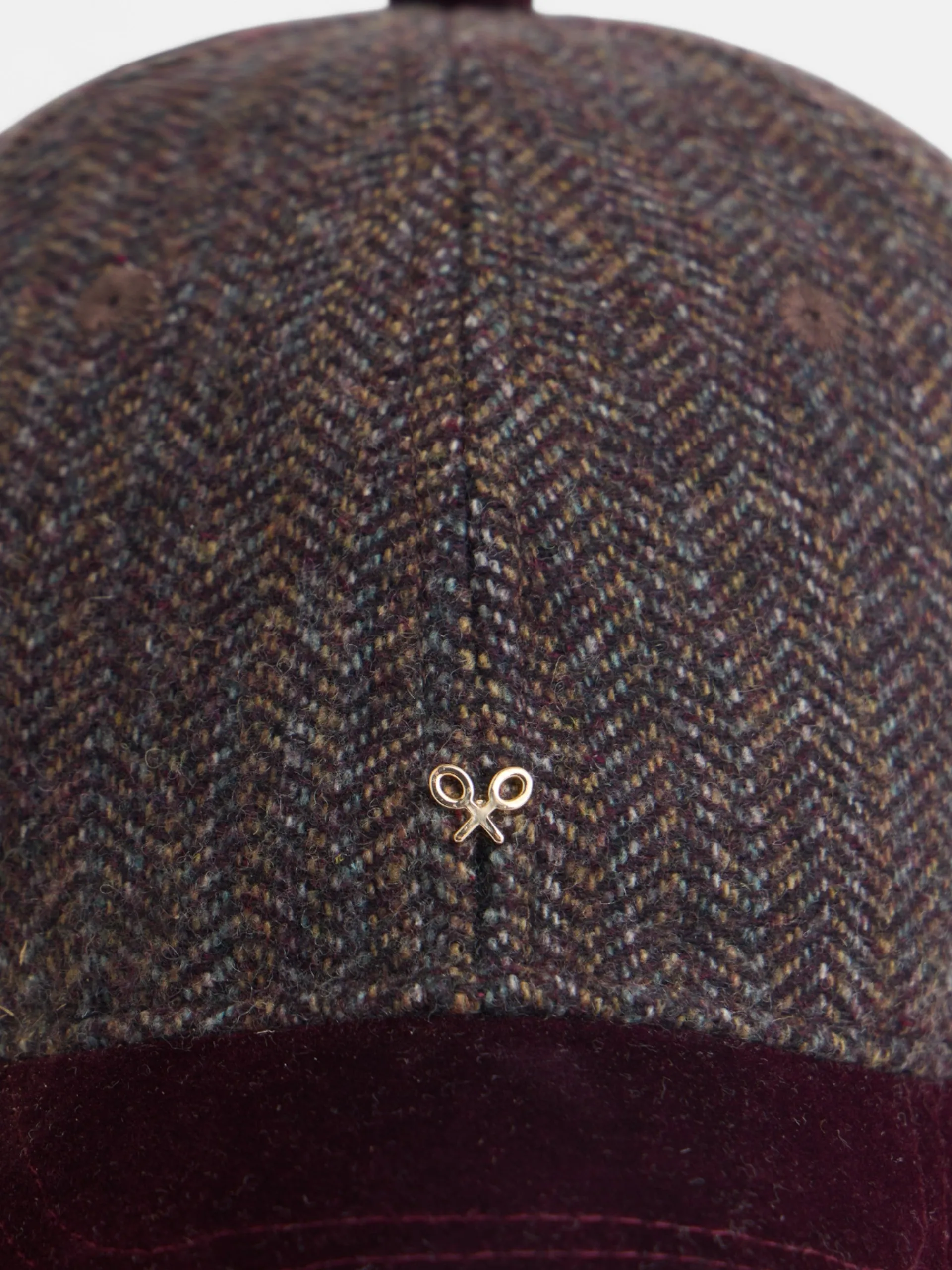 Gorra en tejido de espiga tonos burdeos presenta ajuste posterior mediante hebilla metálica color oro viejo. Presenta visera a contraste en terciopelo burdeos. Cuenta con aplique metálico personalizado en frontal de logo raquetas en dorado.