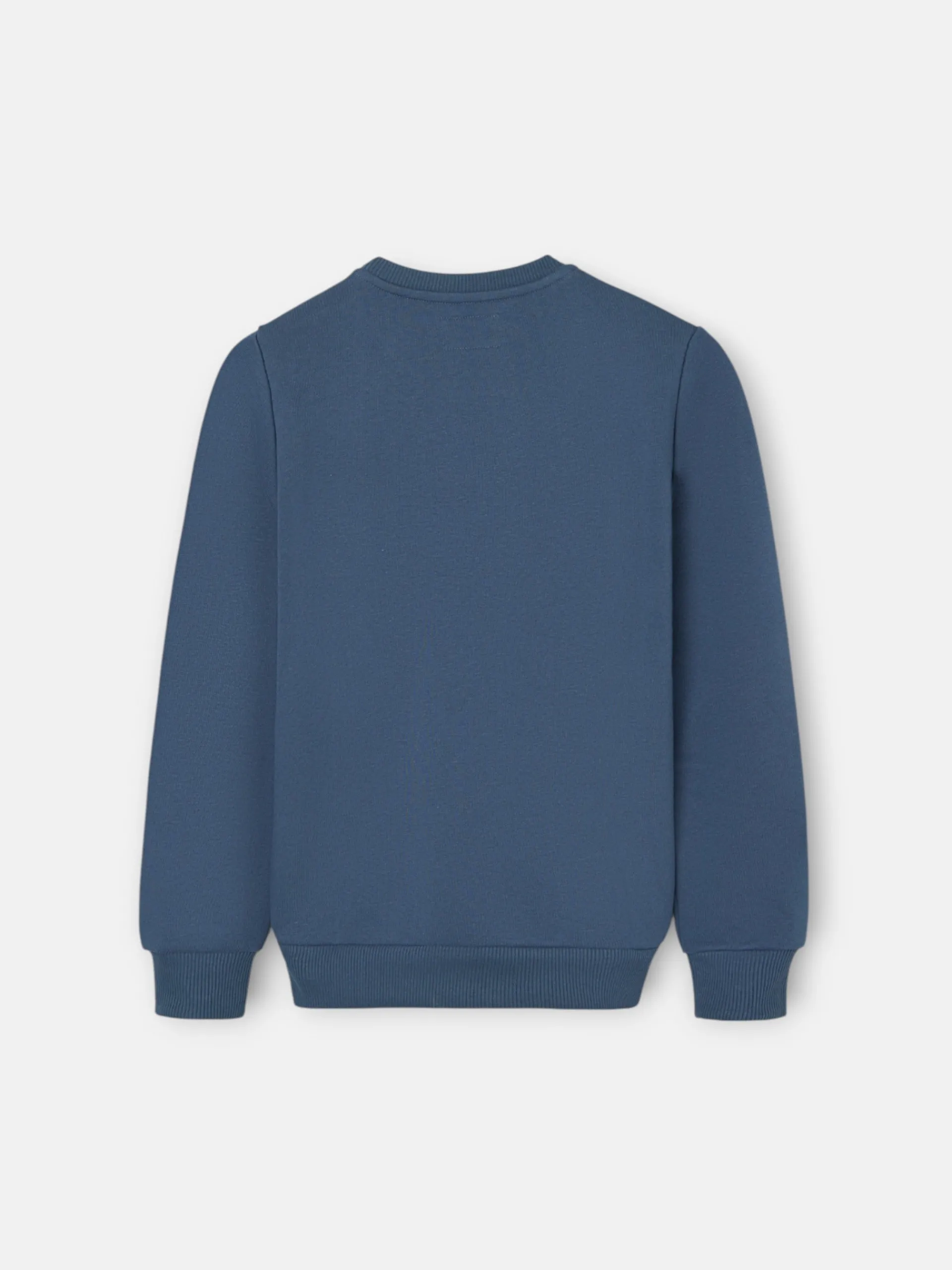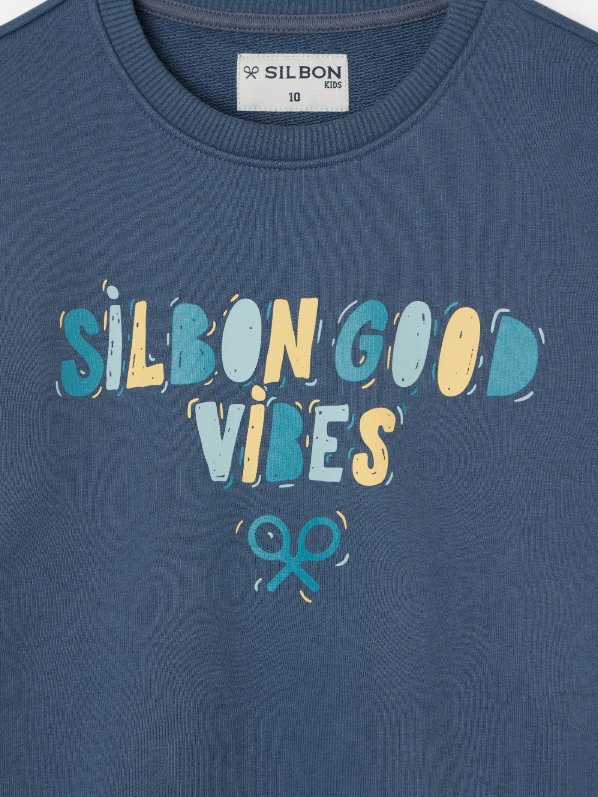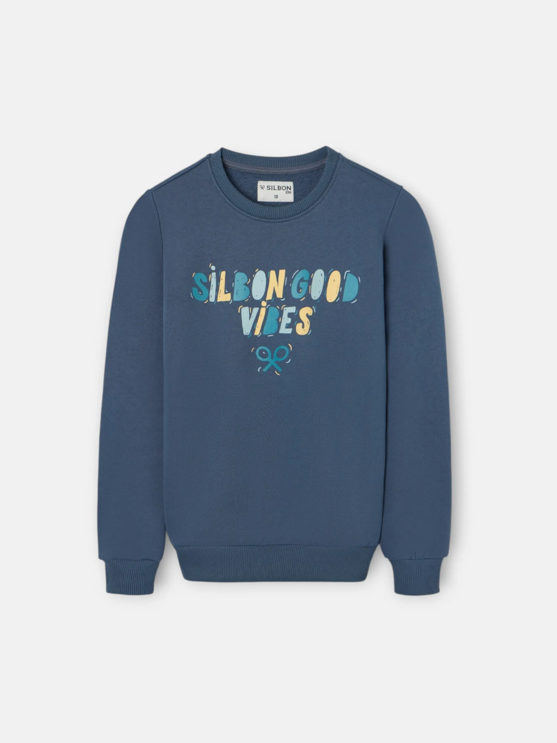 Sudadera kids color azul marino confeccionada en mezcla de algodón con corte Regular fit. Presenta cuello redondo y manga larga. Cuenta con bordado de diseño multicolor de «Good Vibes» en el torso. Fabricada en Portugal.