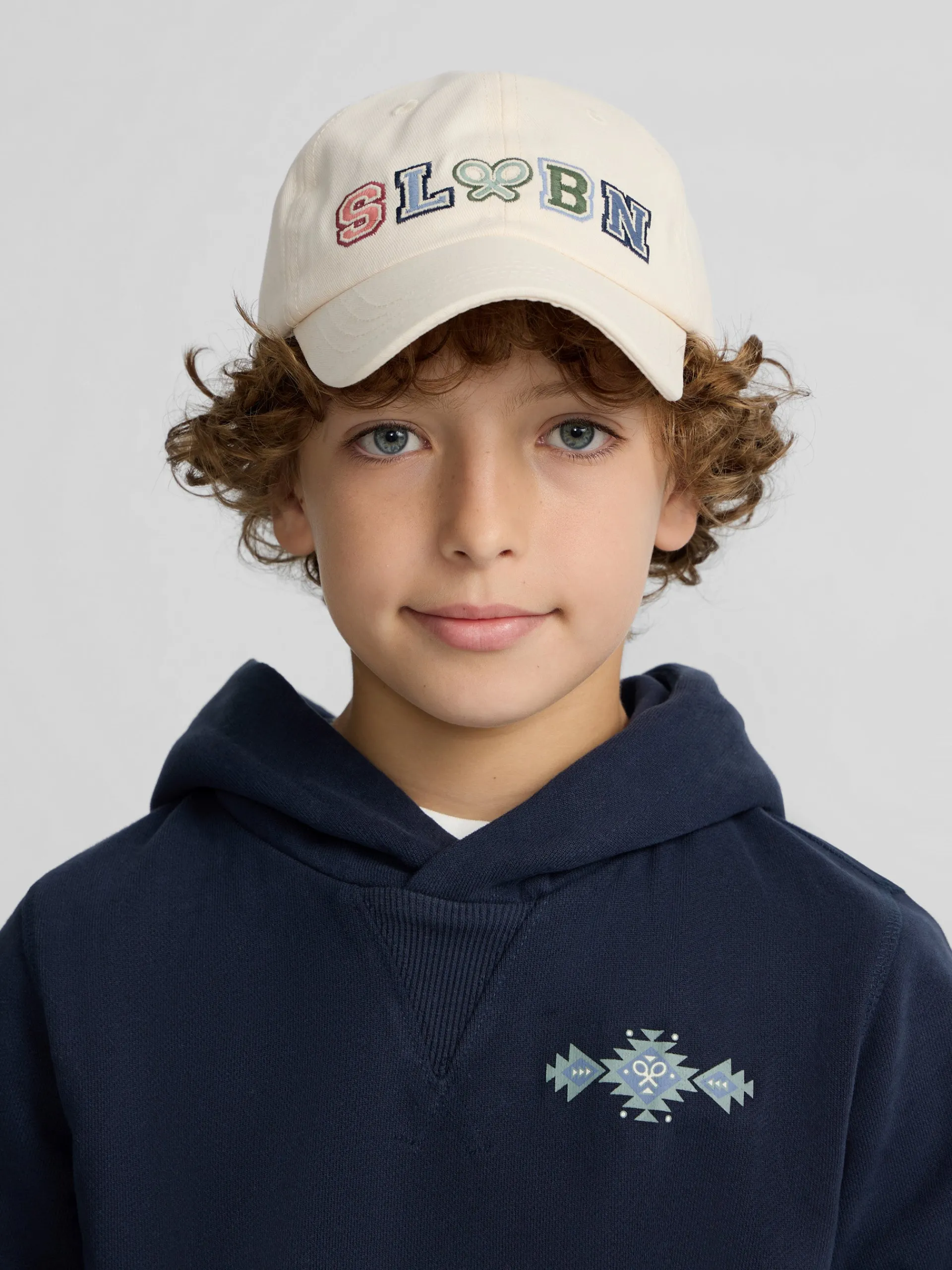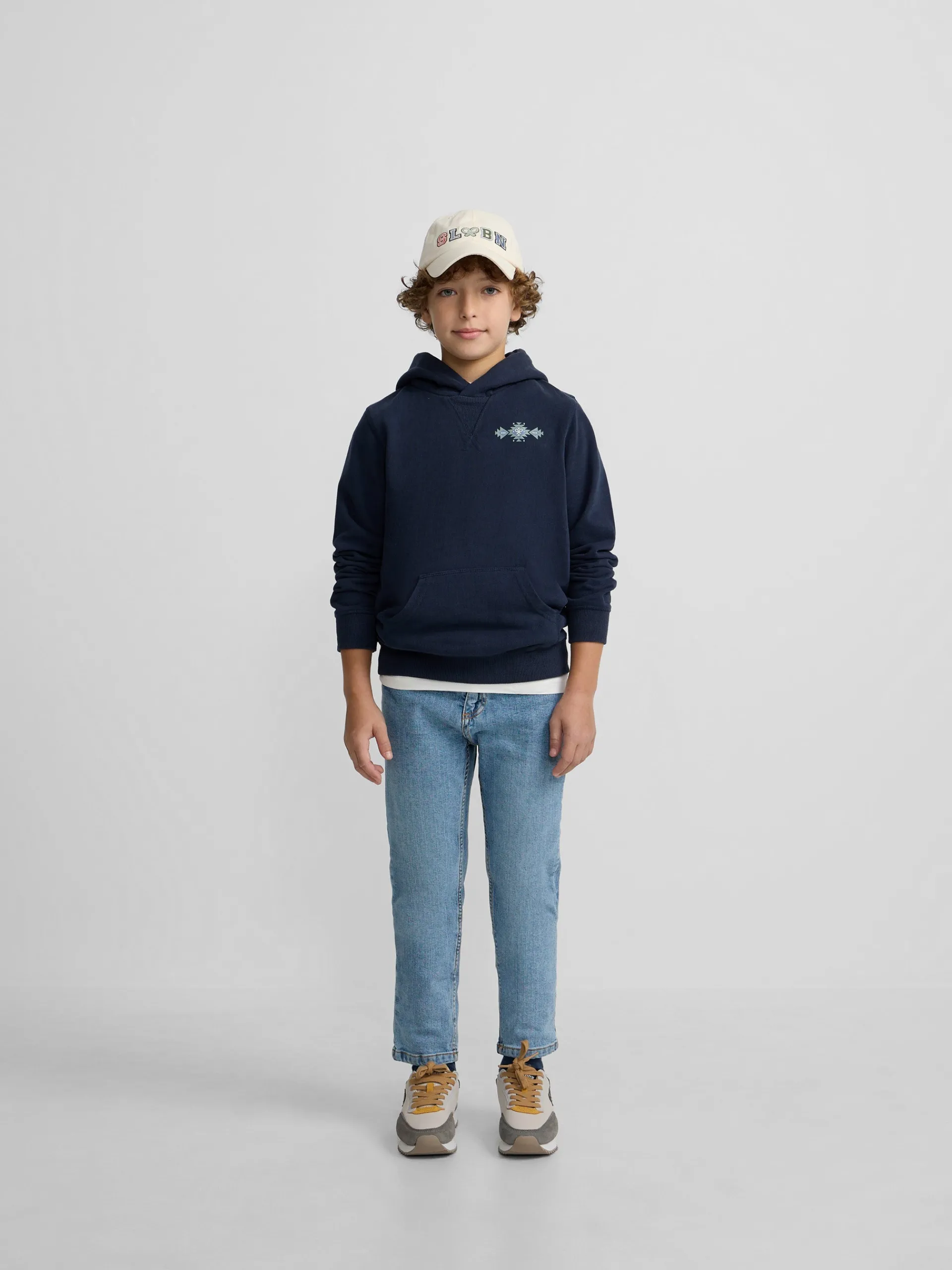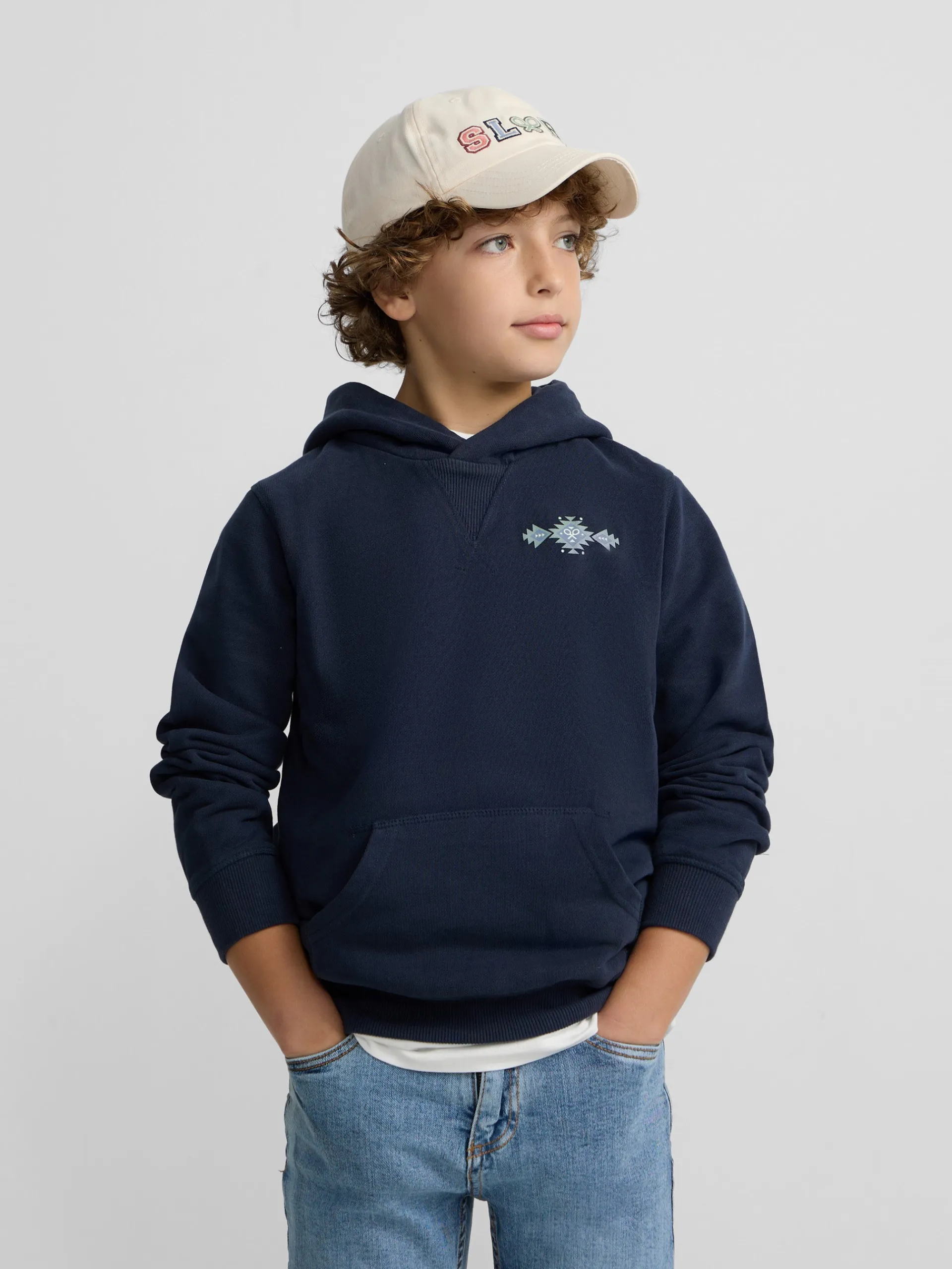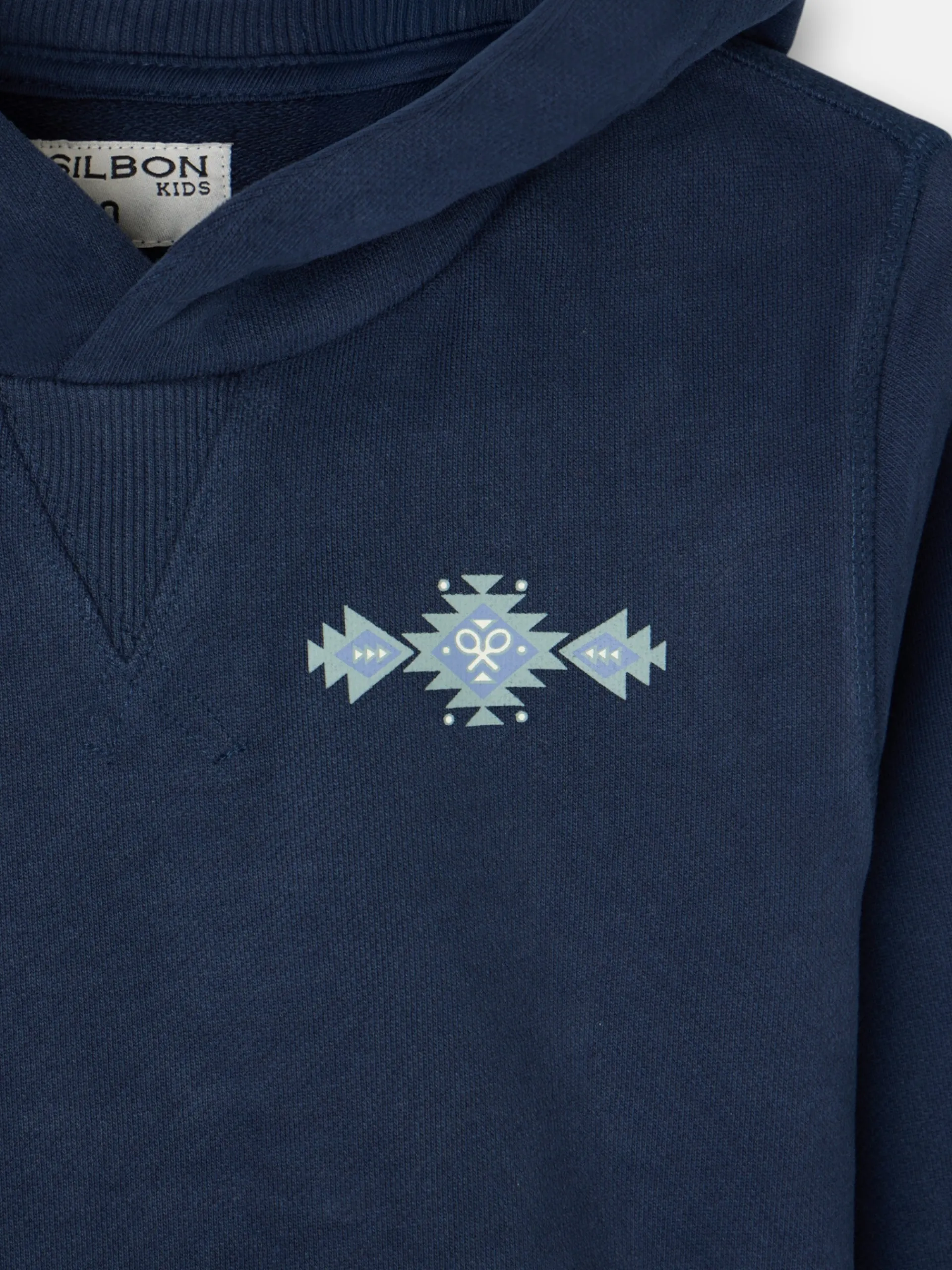 Sudadera kids hoodie color azul marino confeccionada en 100% algodón. Presenta capucha y manga larga con elástico. Cuenta con print étnico en tonos azules en el torso.
