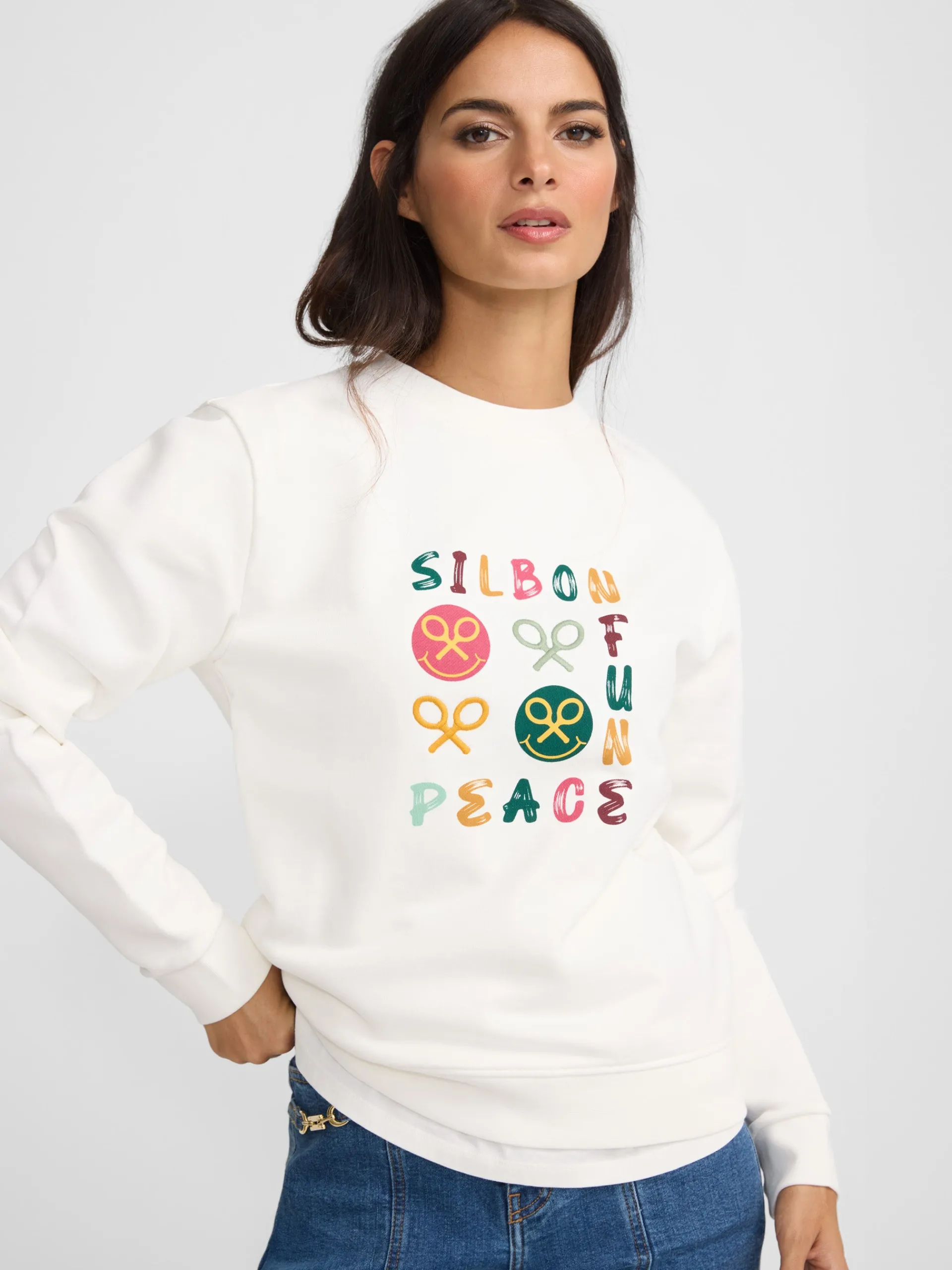 Sudadera woman fun and peace cruda confeccionada en 100% algodón. Presenta detalle de print multicolor en la parte delantera. Cuenta con cuello redondo y manga recta con puño elástico. Fabricada en Portugal.