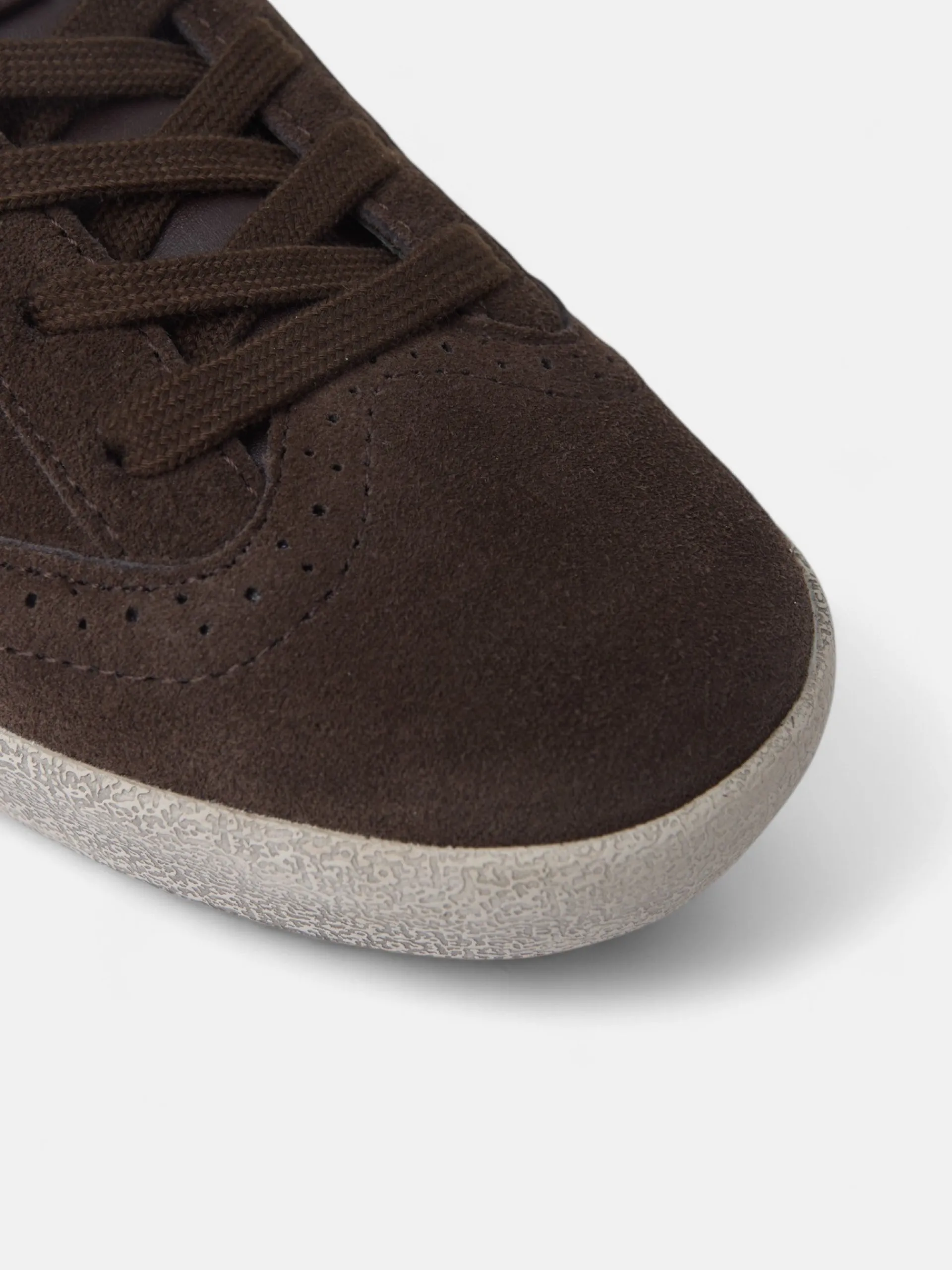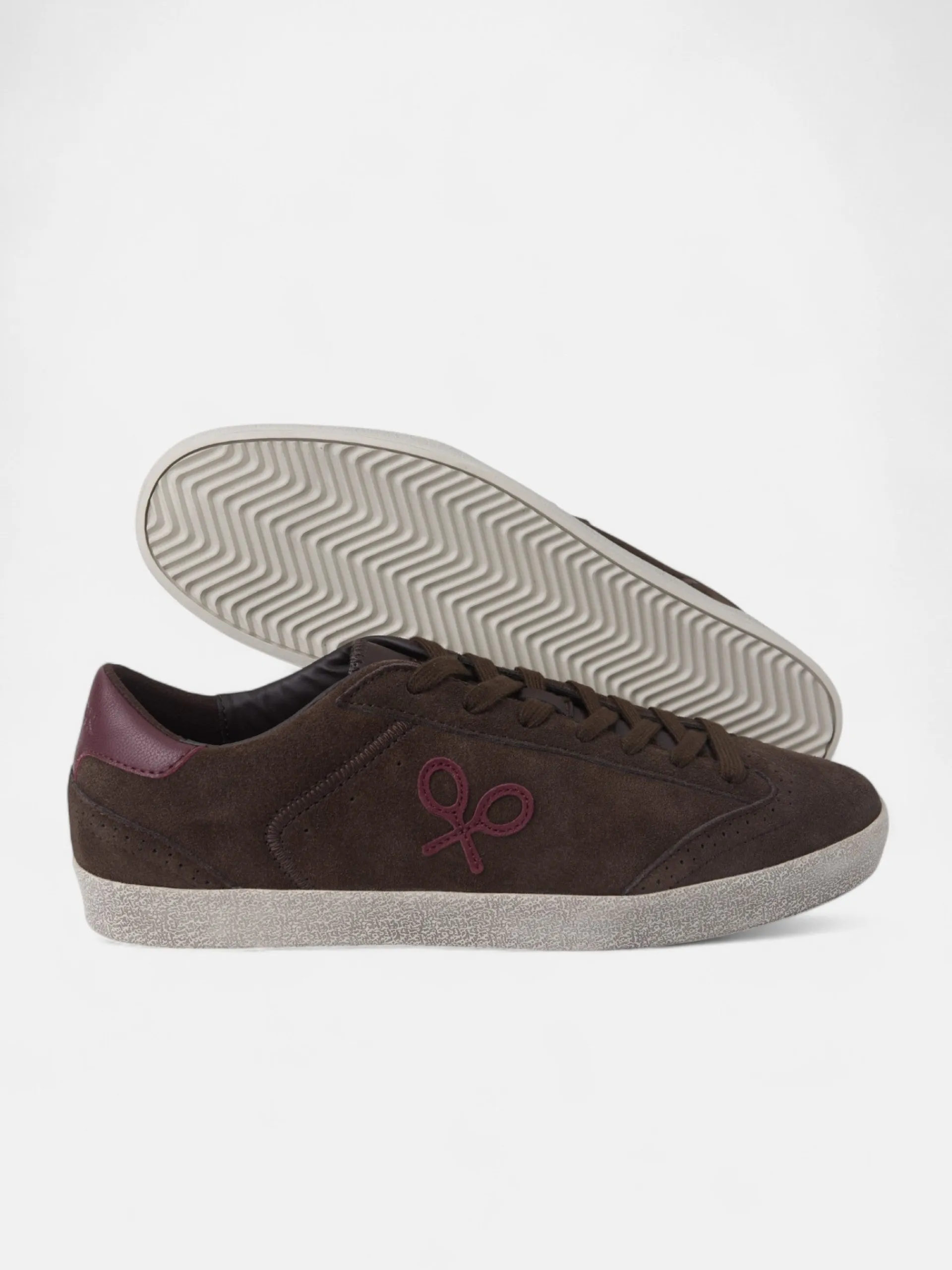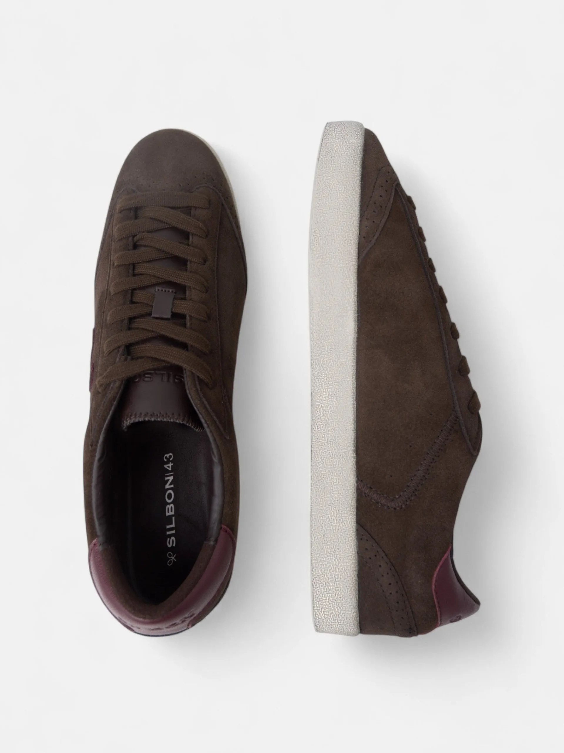 Zapatilla casual lisa marrón confeccionadas en piel serraje. Presenta aplique de piel de raqueta lateral, cierre con cordones y lengüeta con detalle de letras Silbon. Cuenta con suela de goma confortable, interior en piel suave, y letras grabadas en la parte trasera.