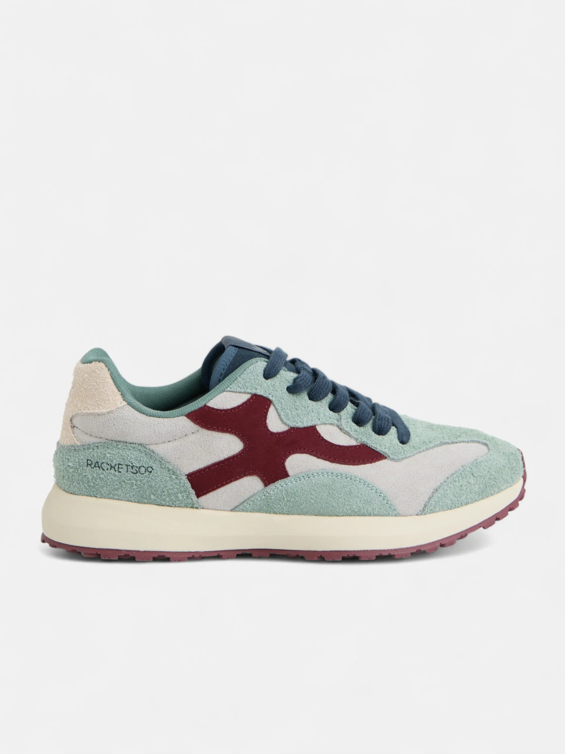 Zapatilla RACKETS09 verde burdeos confeccionadas en piel. Presenta cierre de cordones en crudo y lengüeta de piel color azul con detalle de letras “Silbon” grabadas. Cuenta con puntera y talonera en verde con parte alta del talón en beige, base de tejido en gris y presenta raqueta lateral en burdeos. Contiene suela de goma confortable e interior en piel suave. Tiene cordones de repuesto en color azul.