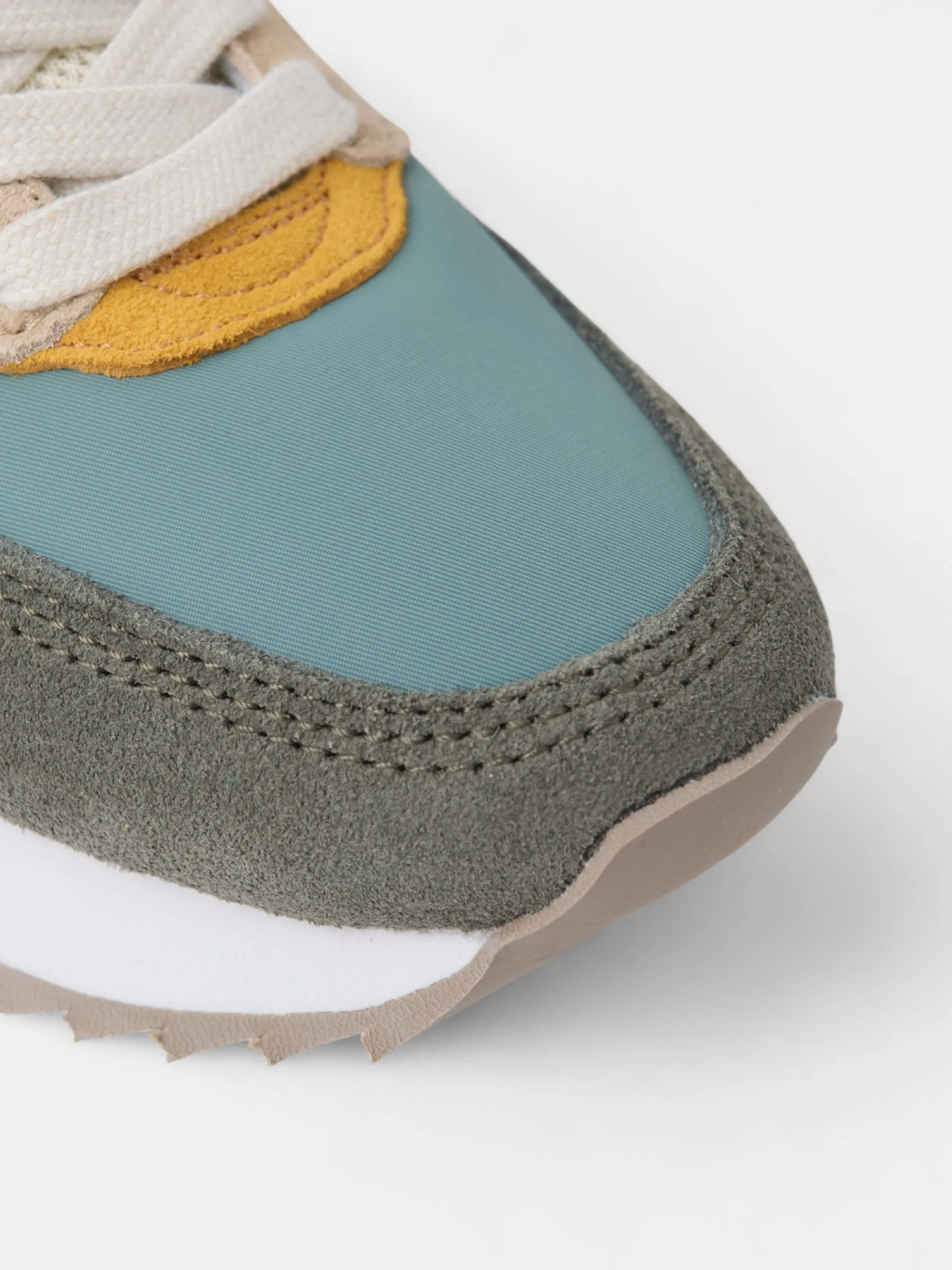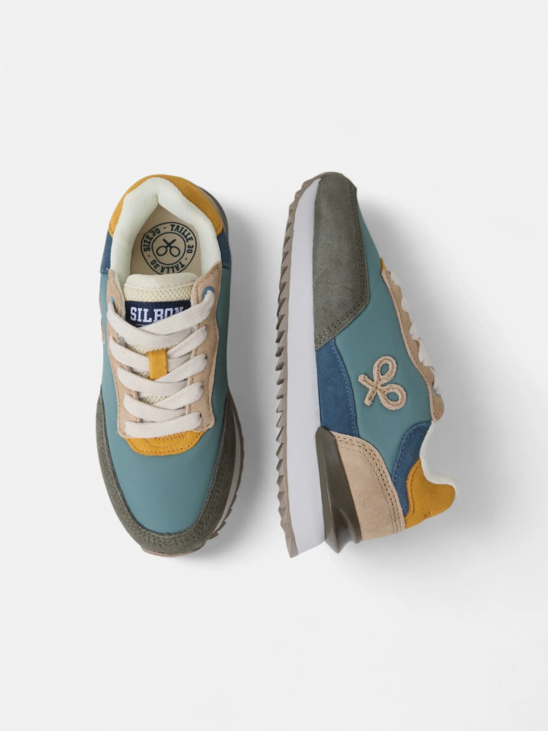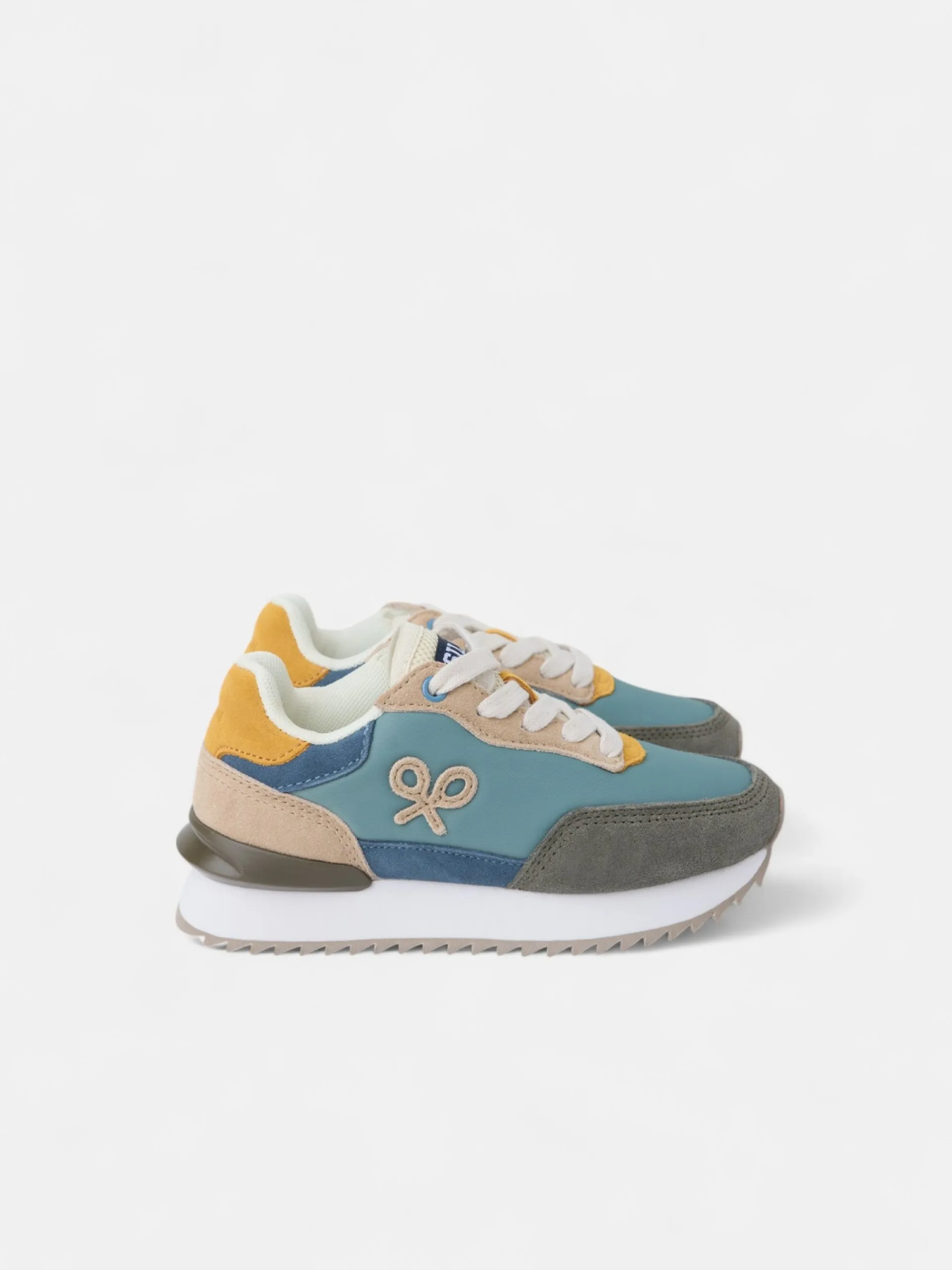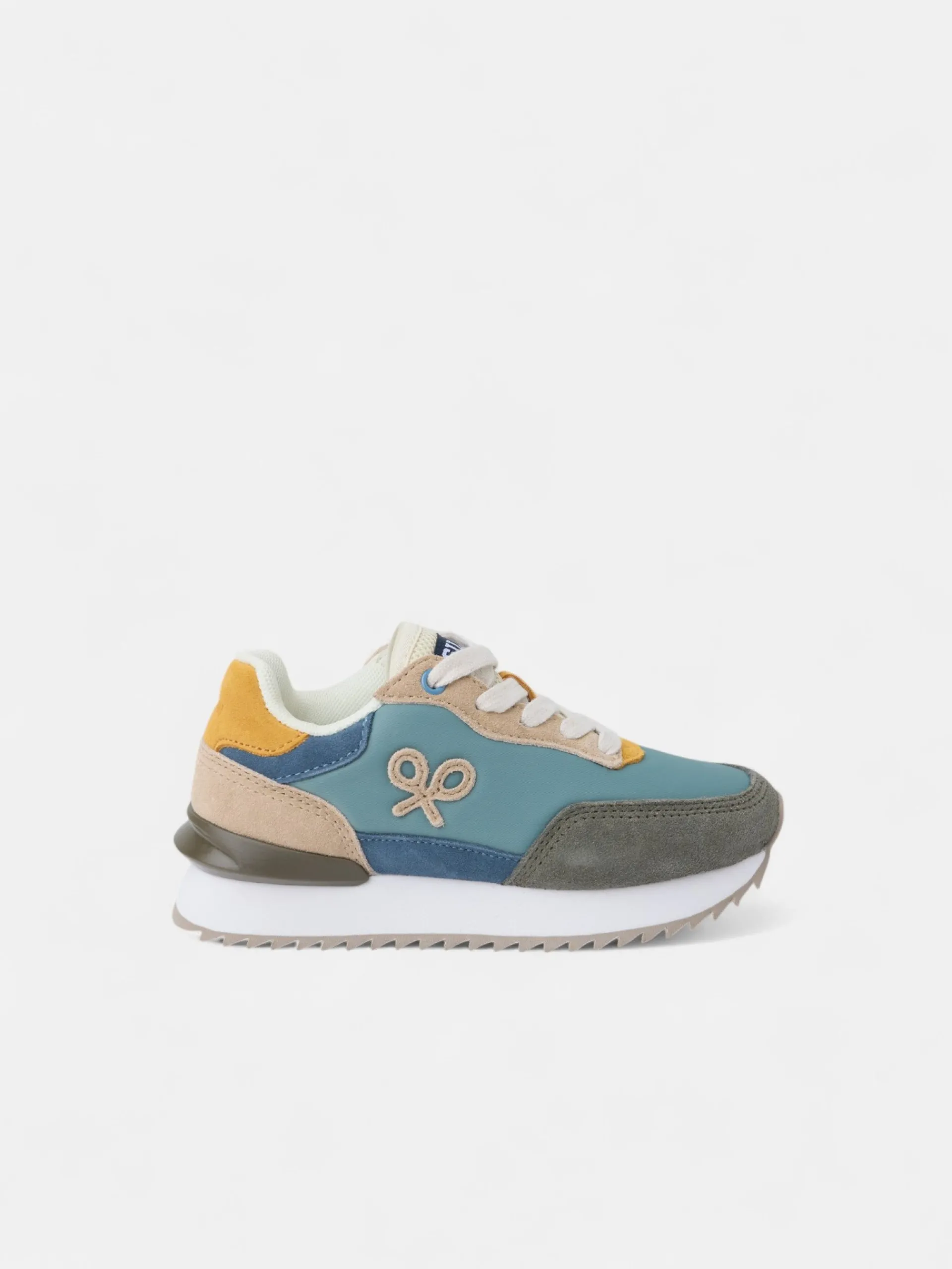 Zapatilla kids running multicolor en tonos verdes, azules y amarillos confeccionada en piel de serraje y tejido técnico perforado. Presenta aplique de raqueta lateral y cierre con cordones personalizados. Cuenta con suela de goma confortable, interior en piel suave y etiqueta personalizada en lengüeta.