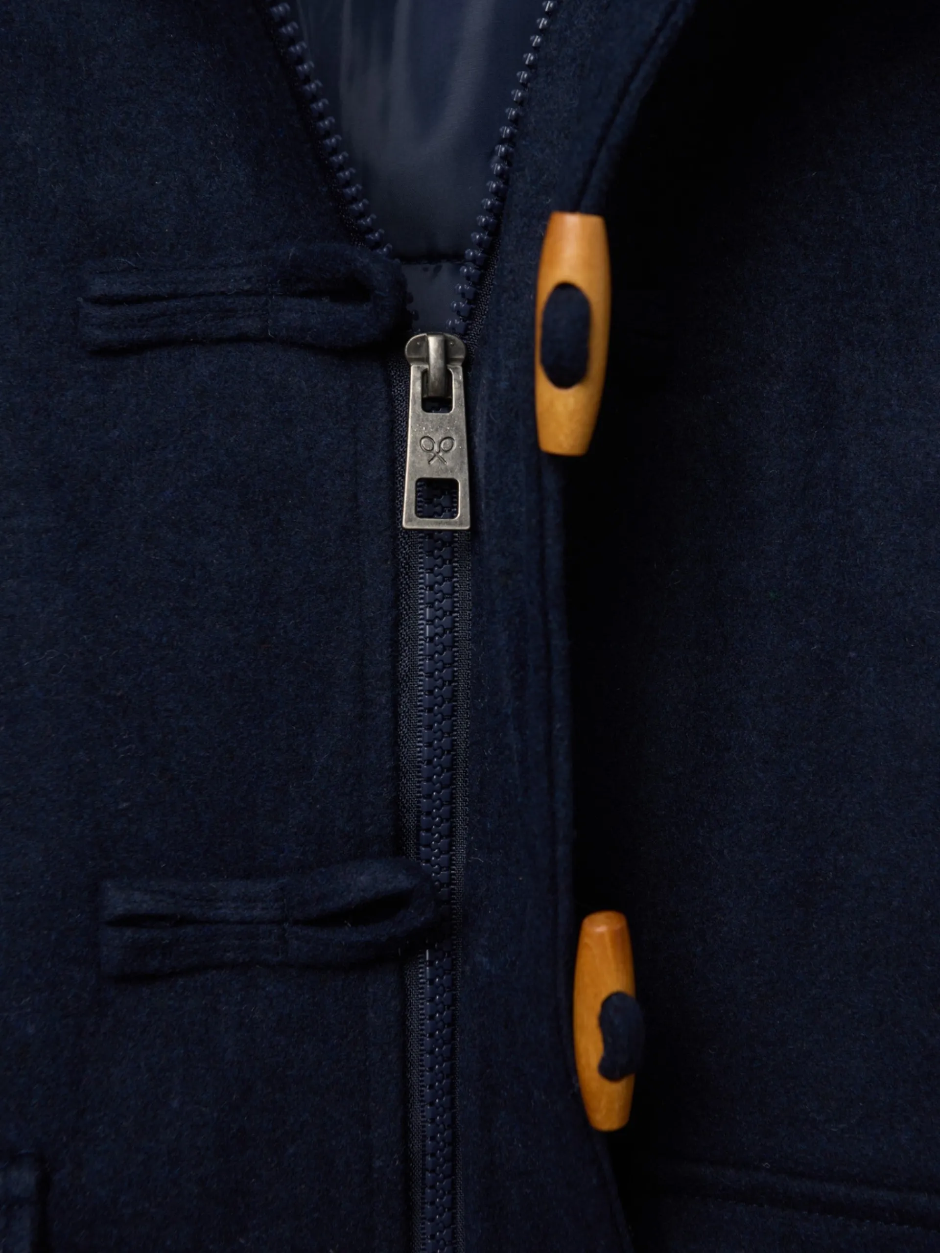 Abrigo de kids clásico color azul marino de corte recto. Presenta bolsillos delanteros tipo parche con tapeta y cuello clásico con capucha. Cuenta con cierre frontal de cremallera metálica y botones de refuerzo. Contiene raquetas bordadas a contraste en color verde en el torso.
