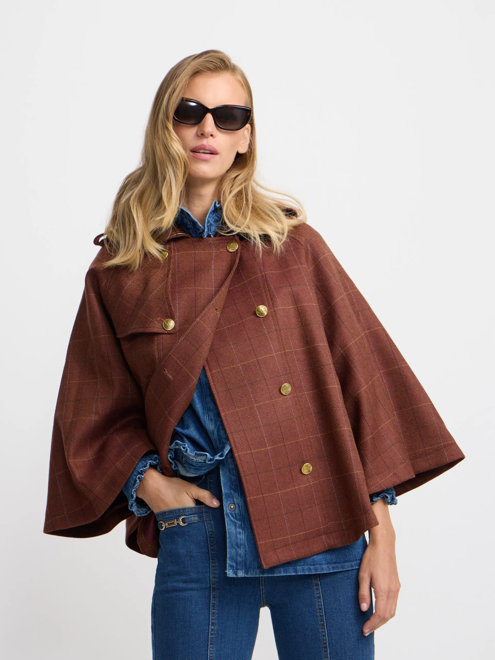 Capa de tejido de cuadros en tonos marrones confeccionada 100% en lana. Cuenta con cuello a contraste en piel marrón, con detalle de botones personalizados SILBON color oro. Presenta bolsillos a contraste en piel y forro interior en marrón. Fabricado en España.