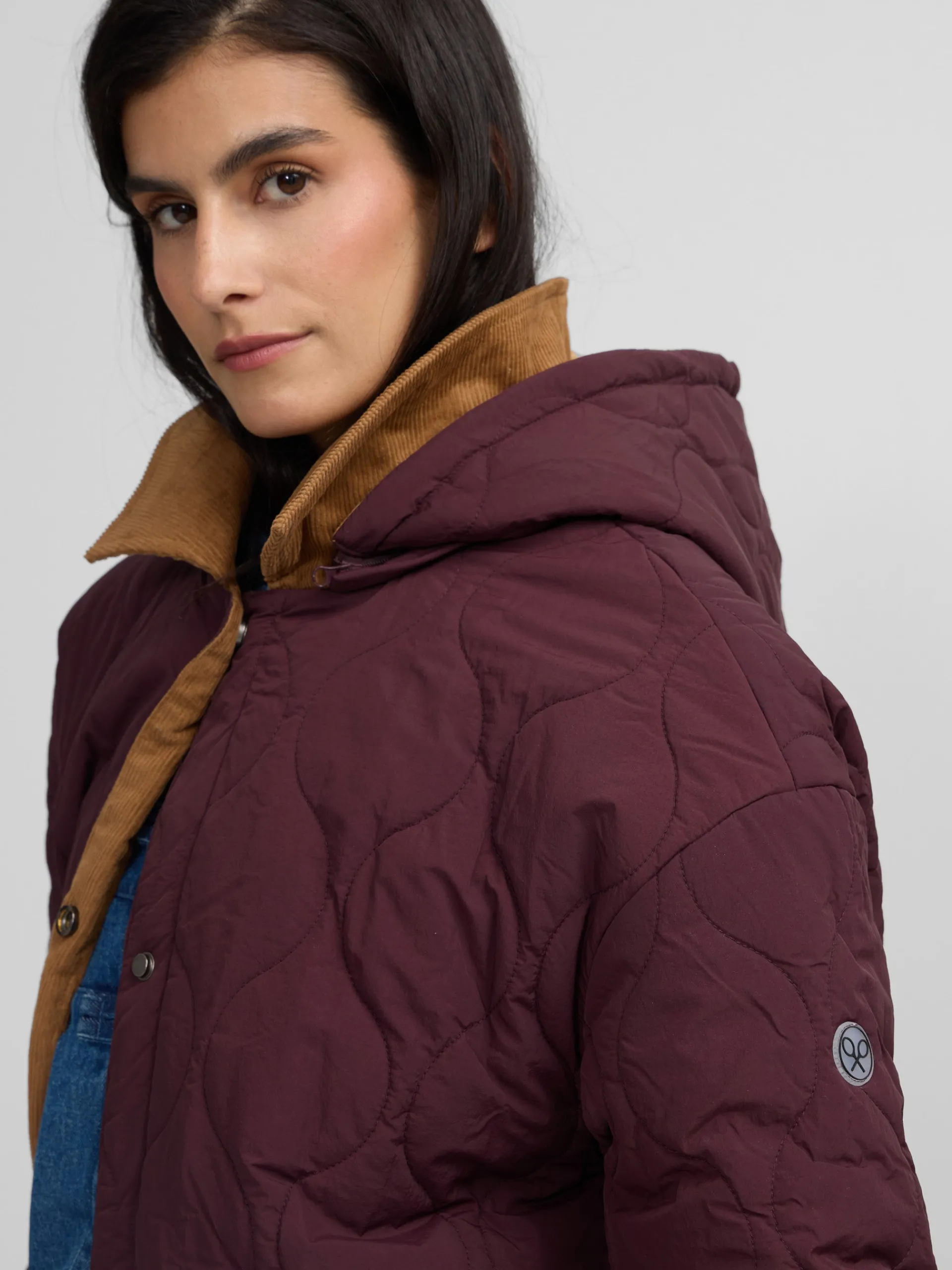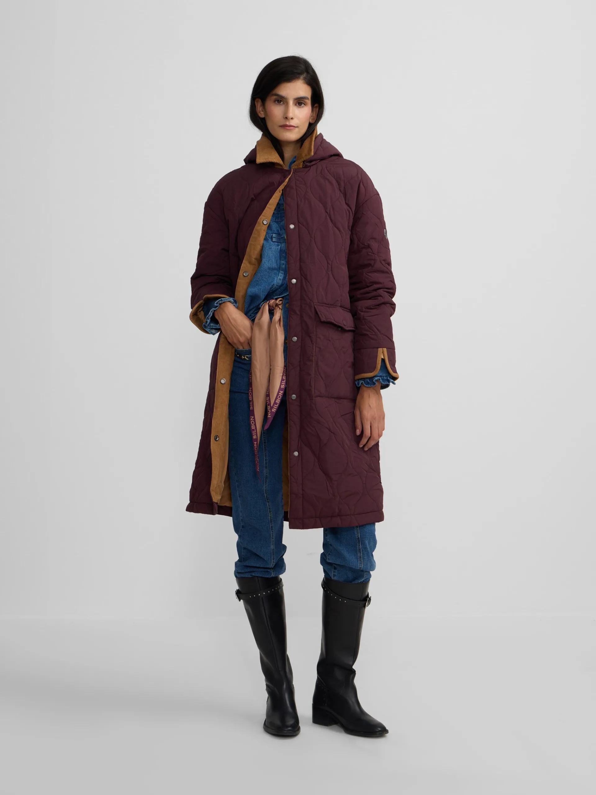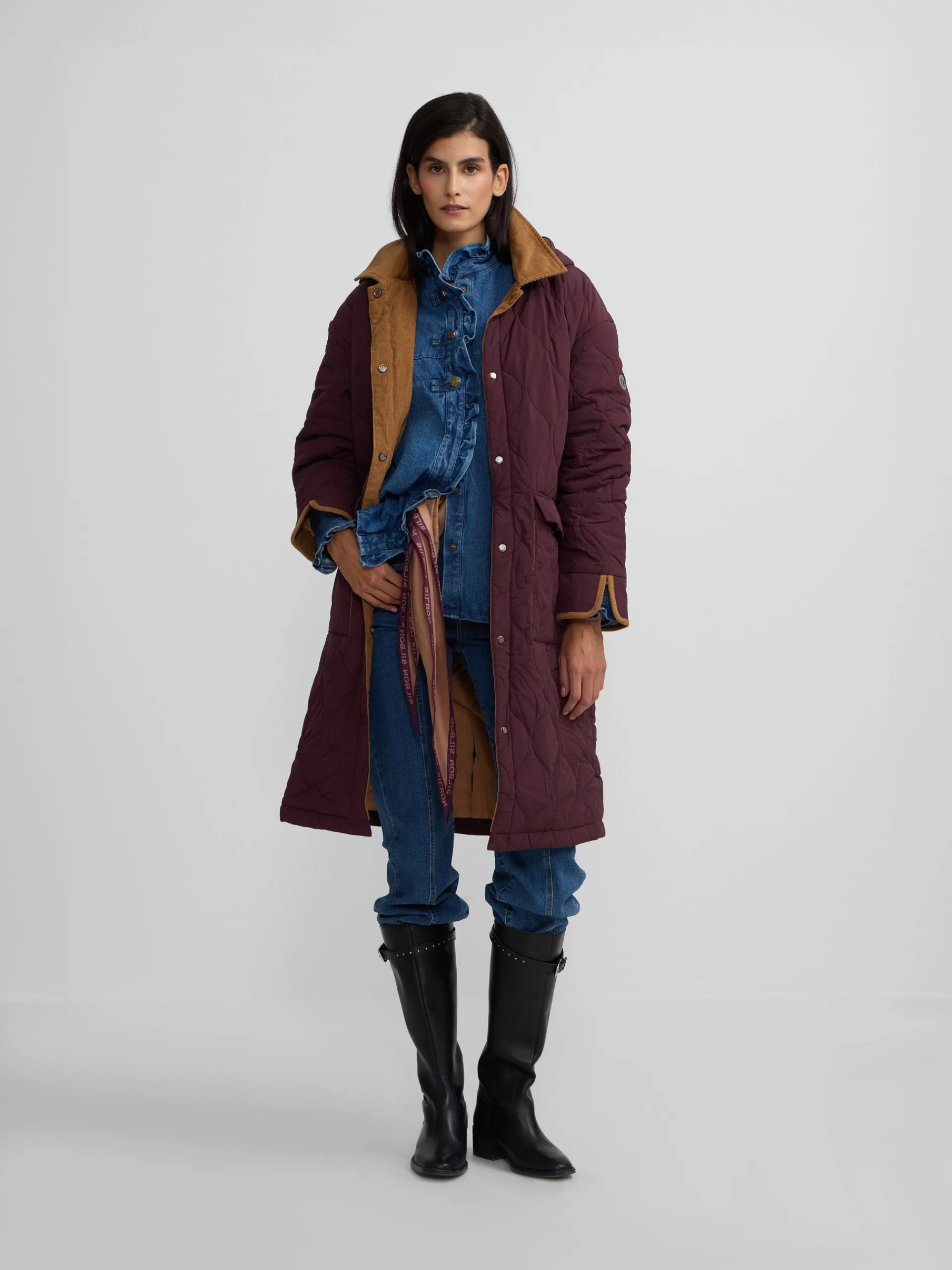 Parka larga acolchada color burdeos de estilo husky con cuello de solapa en pana marrón a contraste. Presenta detalle de bolsillos de parche con tapeta y snap button al tono. Cuenta con cierre con tapeta con broches vistos al tono y cremallera inyectada metálica con tirador personalizado. Prenda watter repelent.