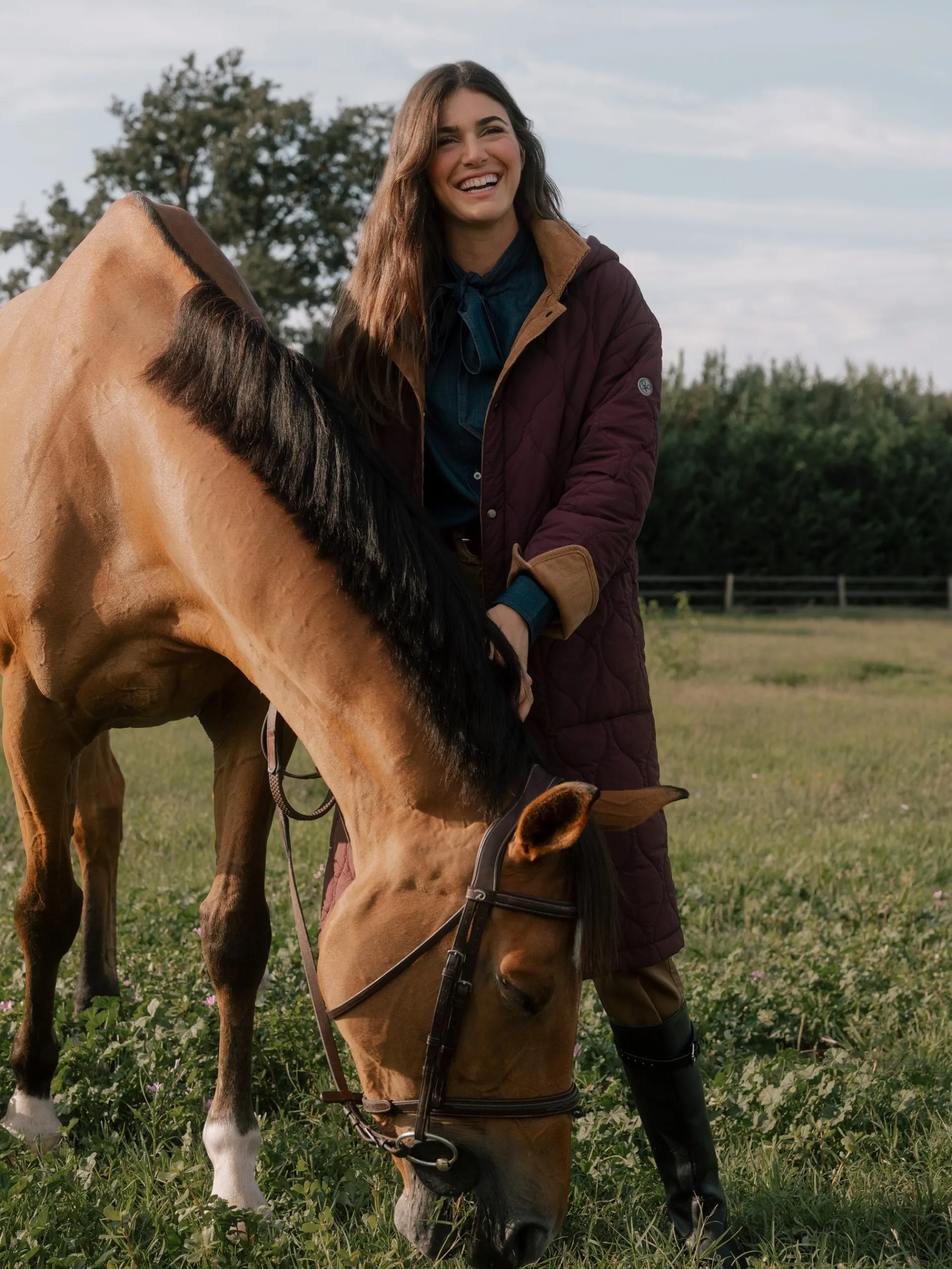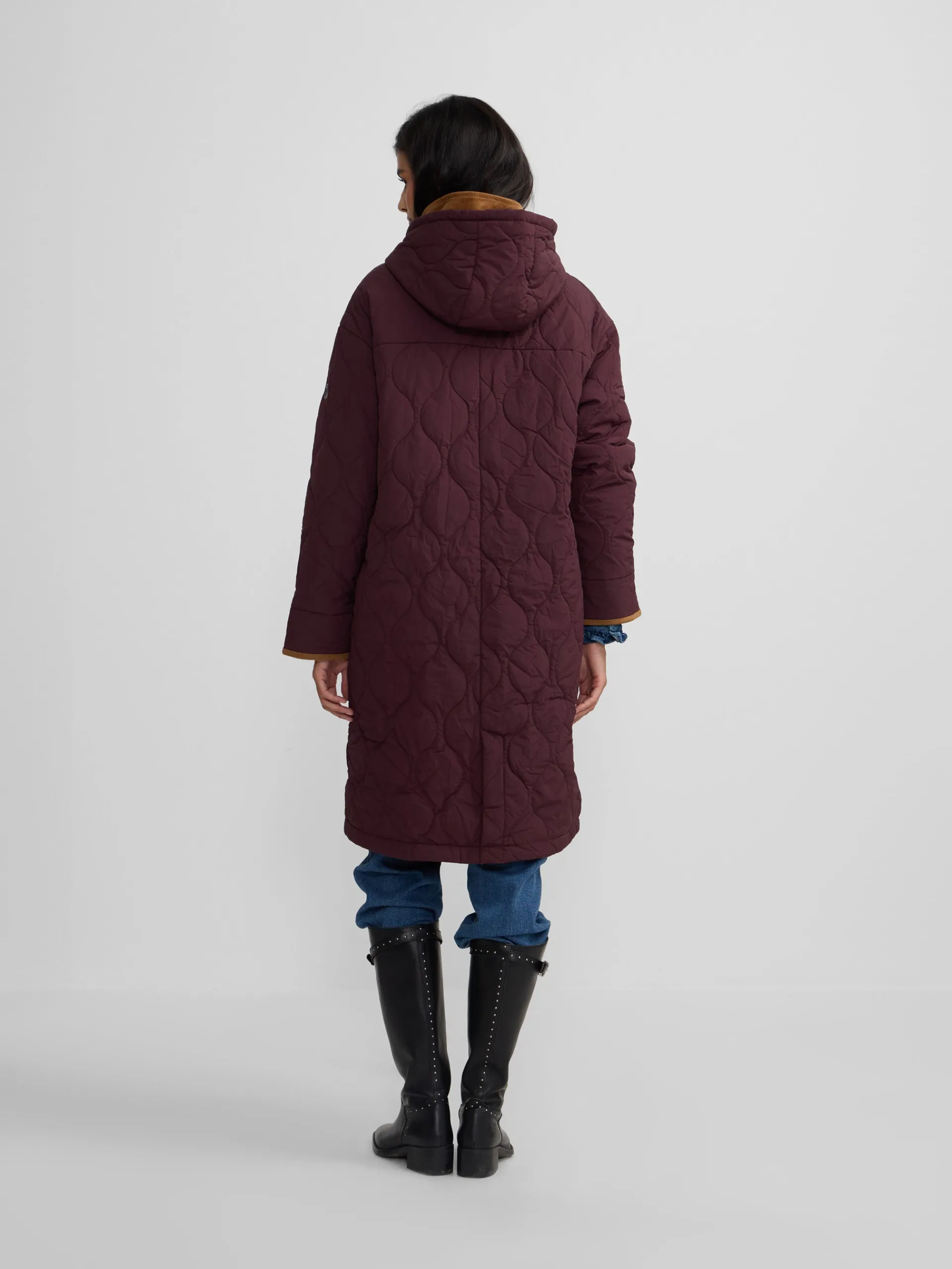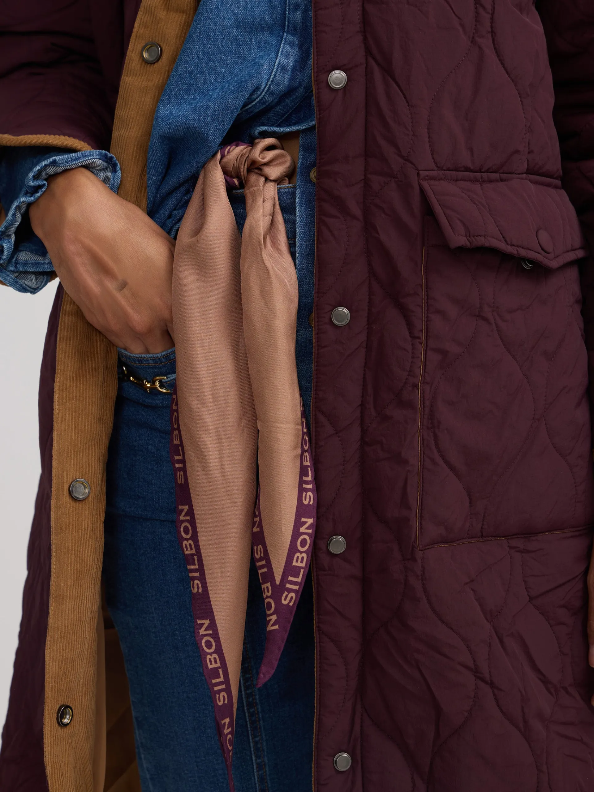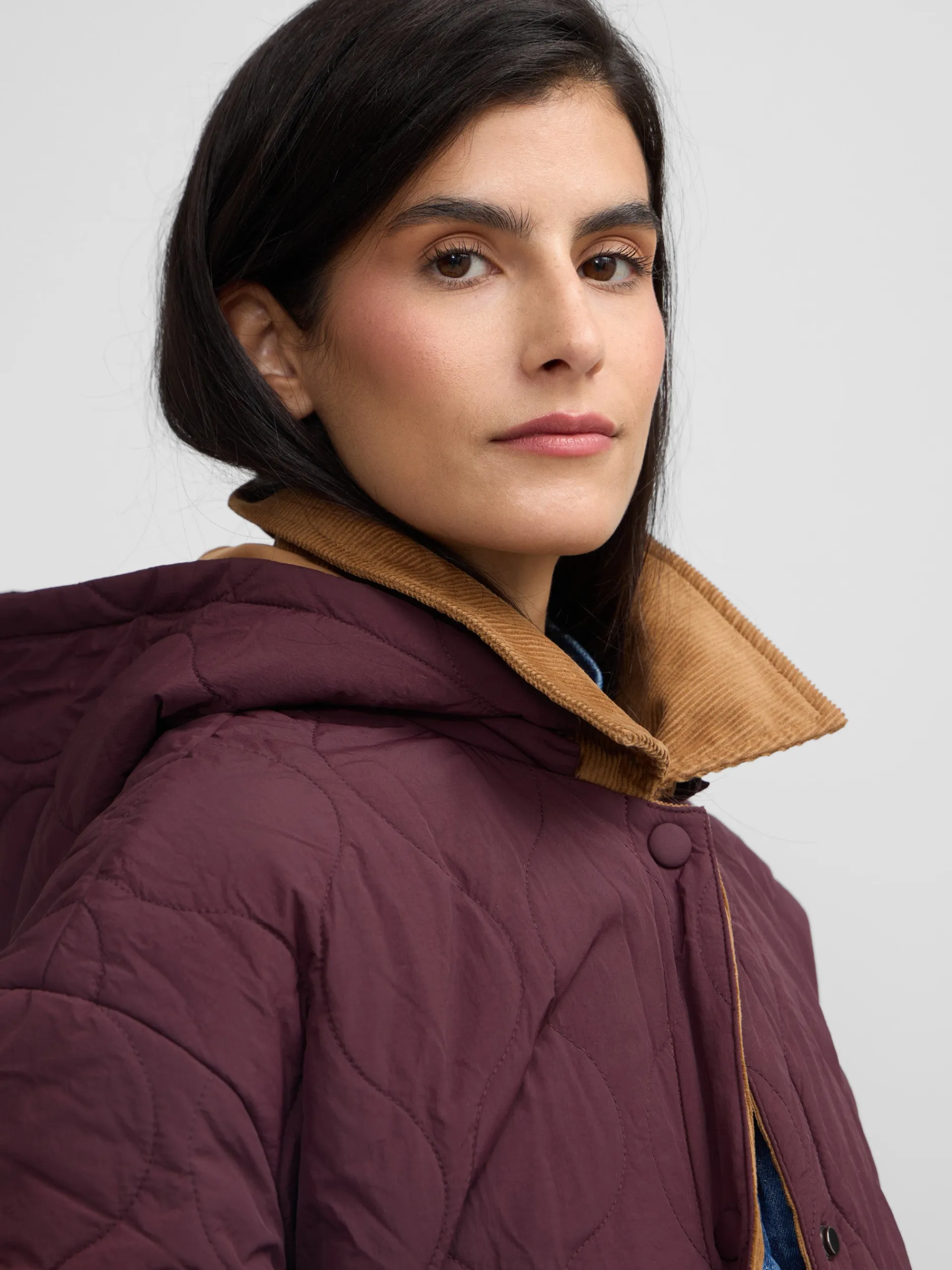 Parka larga acolchada color burdeos de estilo husky con cuello de solapa en pana marrón a contraste. Presenta detalle de bolsillos de parche con tapeta y snap button al tono. Cuenta con cierre con tapeta con broches vistos al tono y cremallera inyectada metálica con tirador personalizado. Prenda watter repelent.