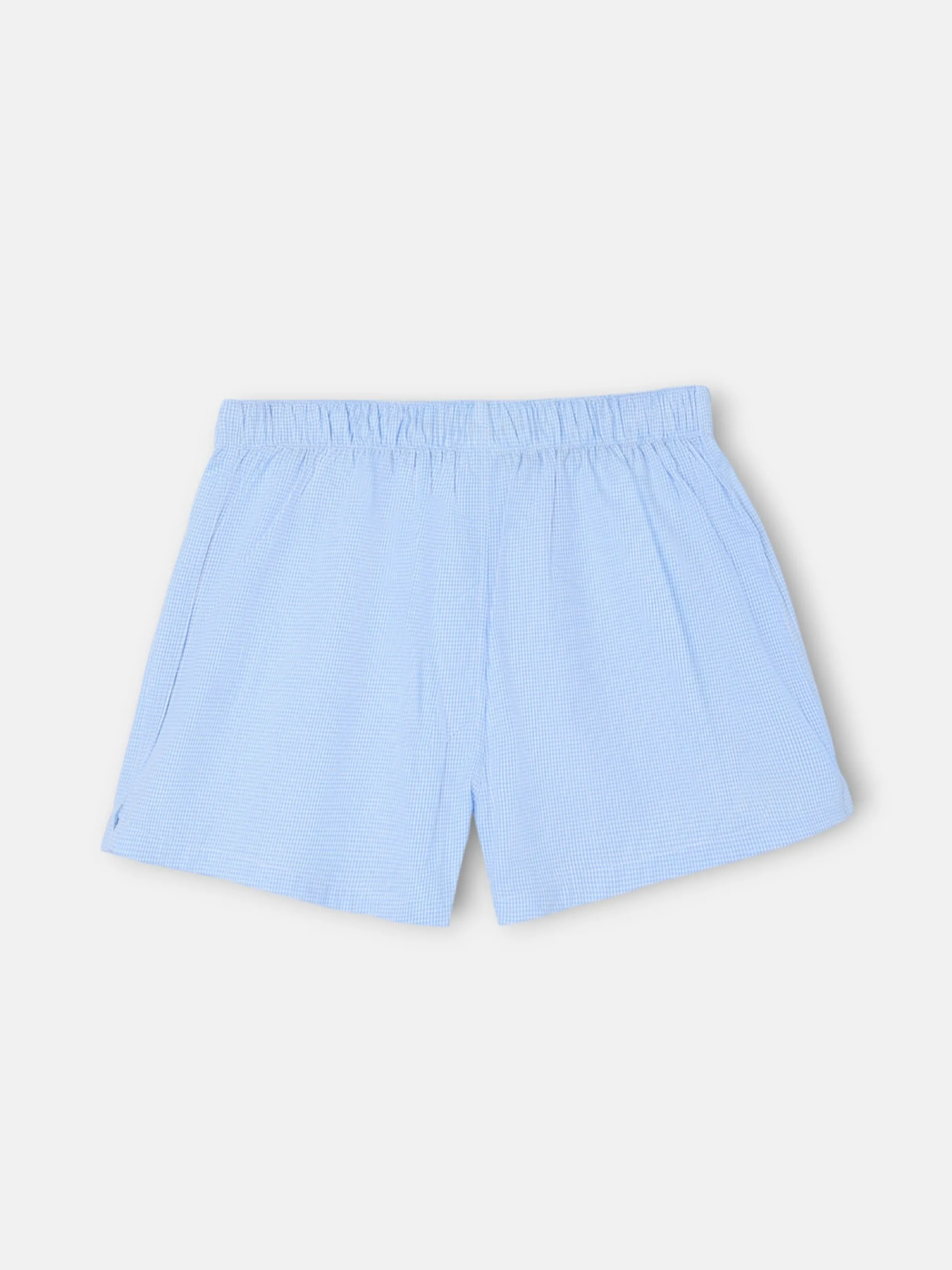 Calzoncillo mini cuadros celeste confeccionado en mezcla de algodón. Presenta cierre con botones personalizados y elástico interior. Cuenta con bordado de letras Silbon en la parte inferior.