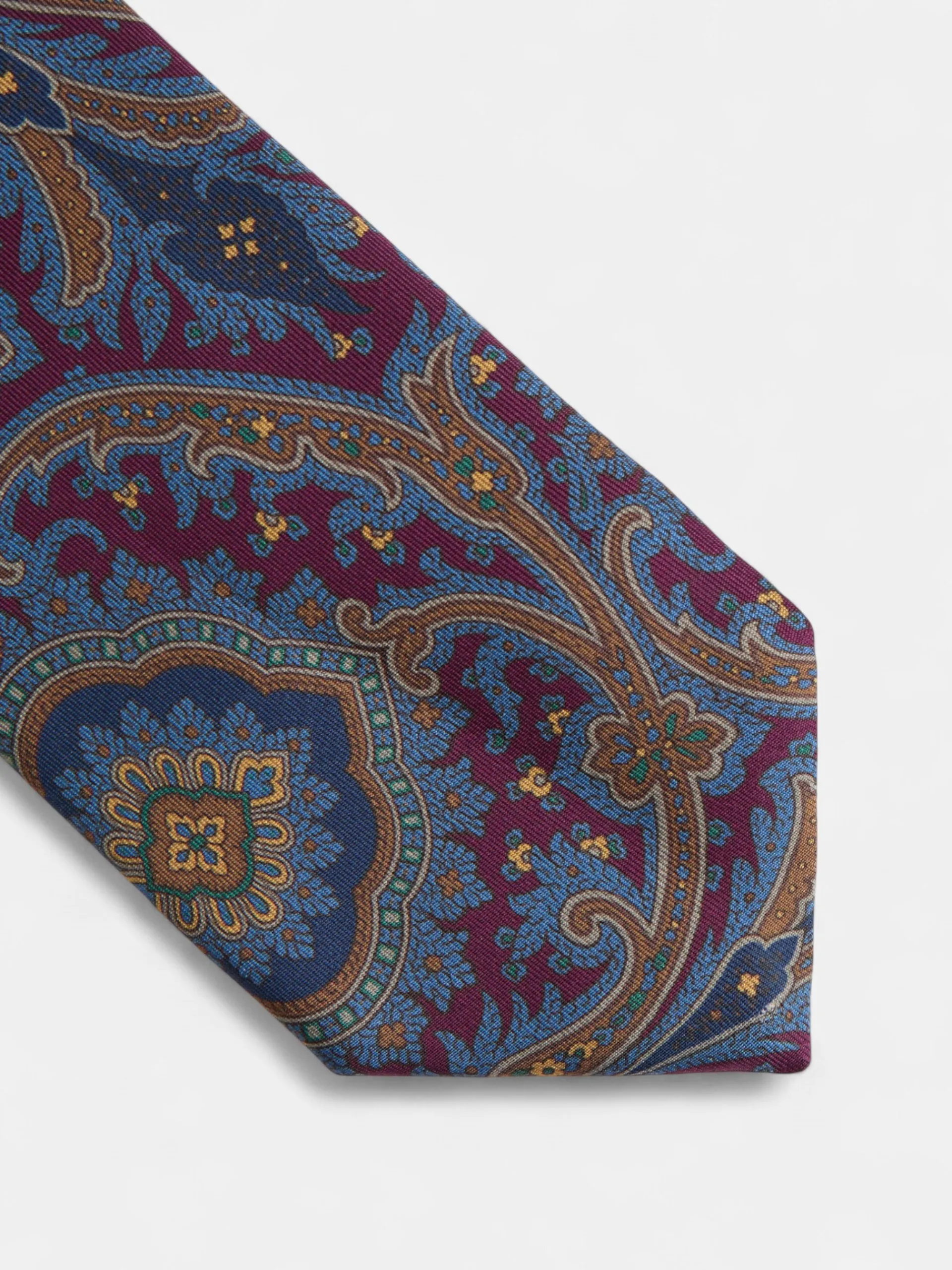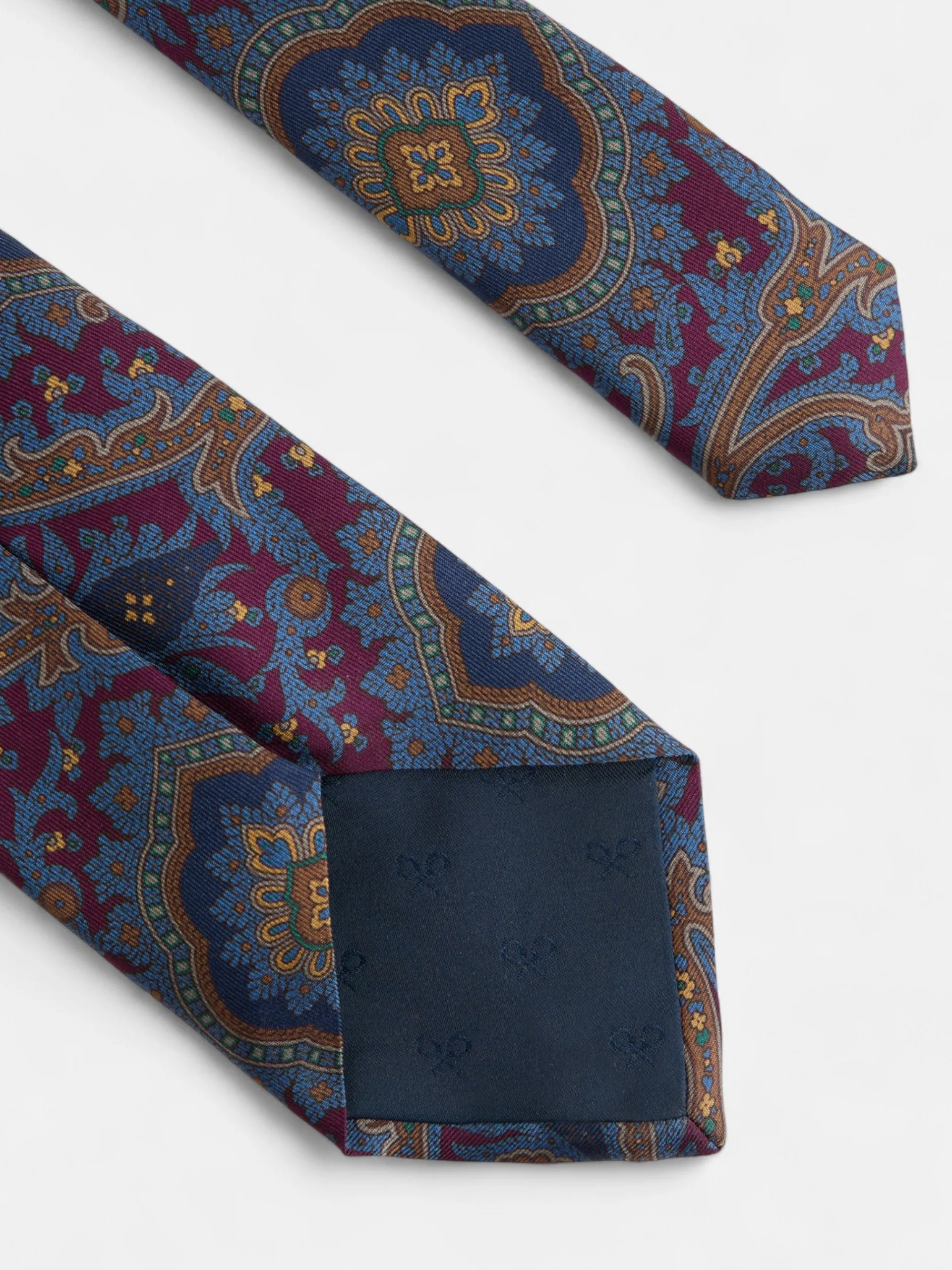 Corbata estampado acanto en tonos burdeos y azul confeccionada en 100% seda.