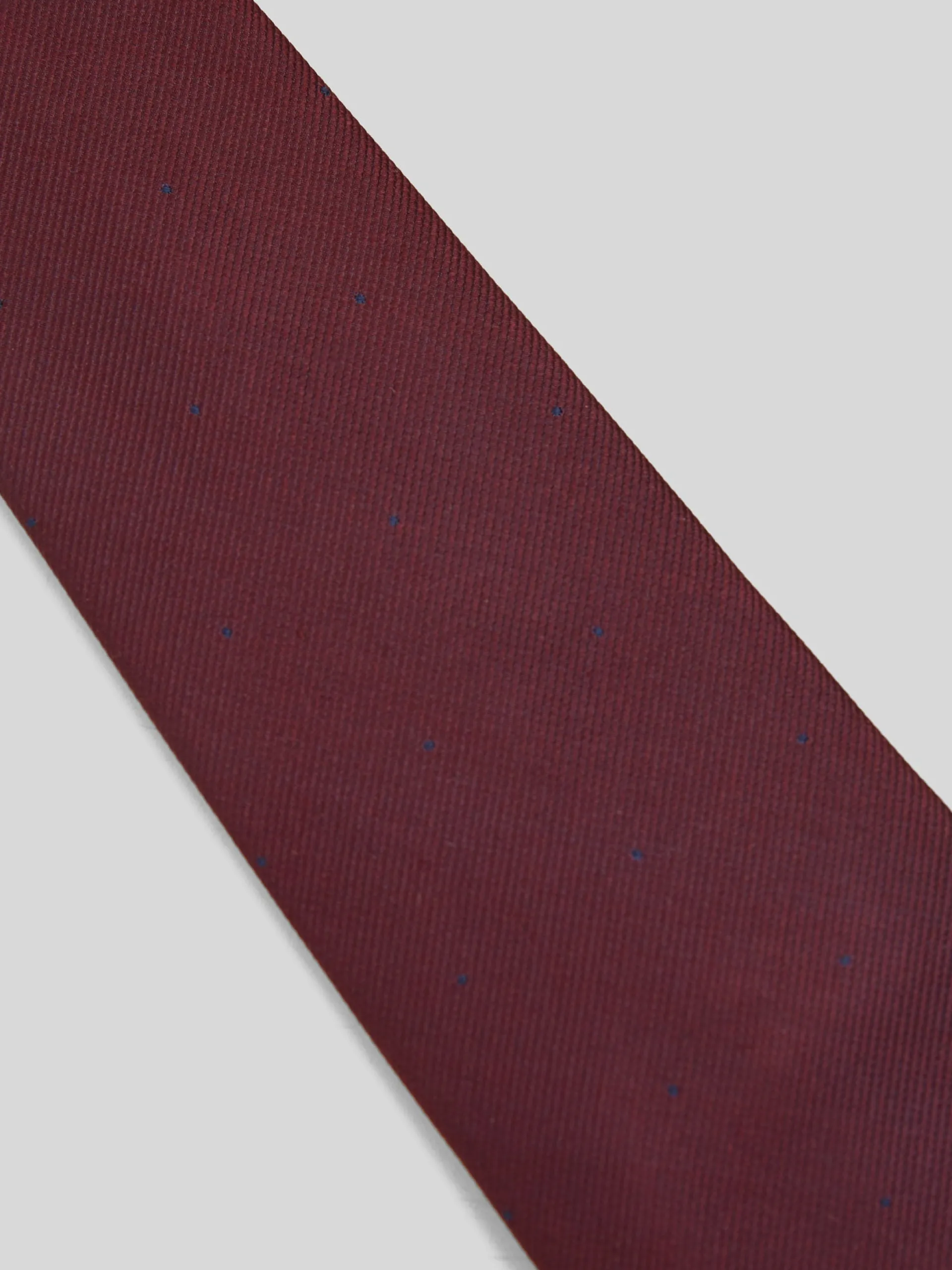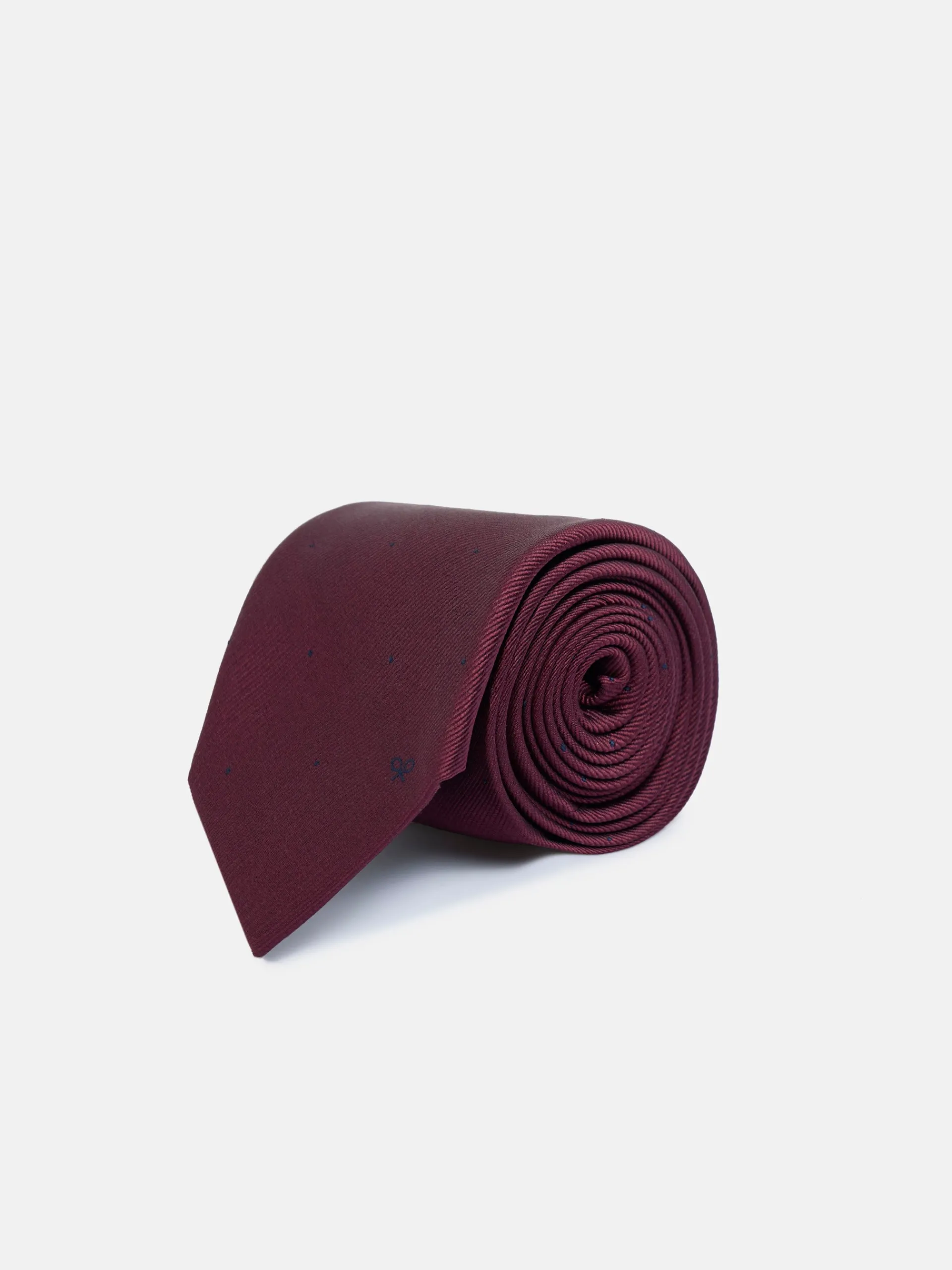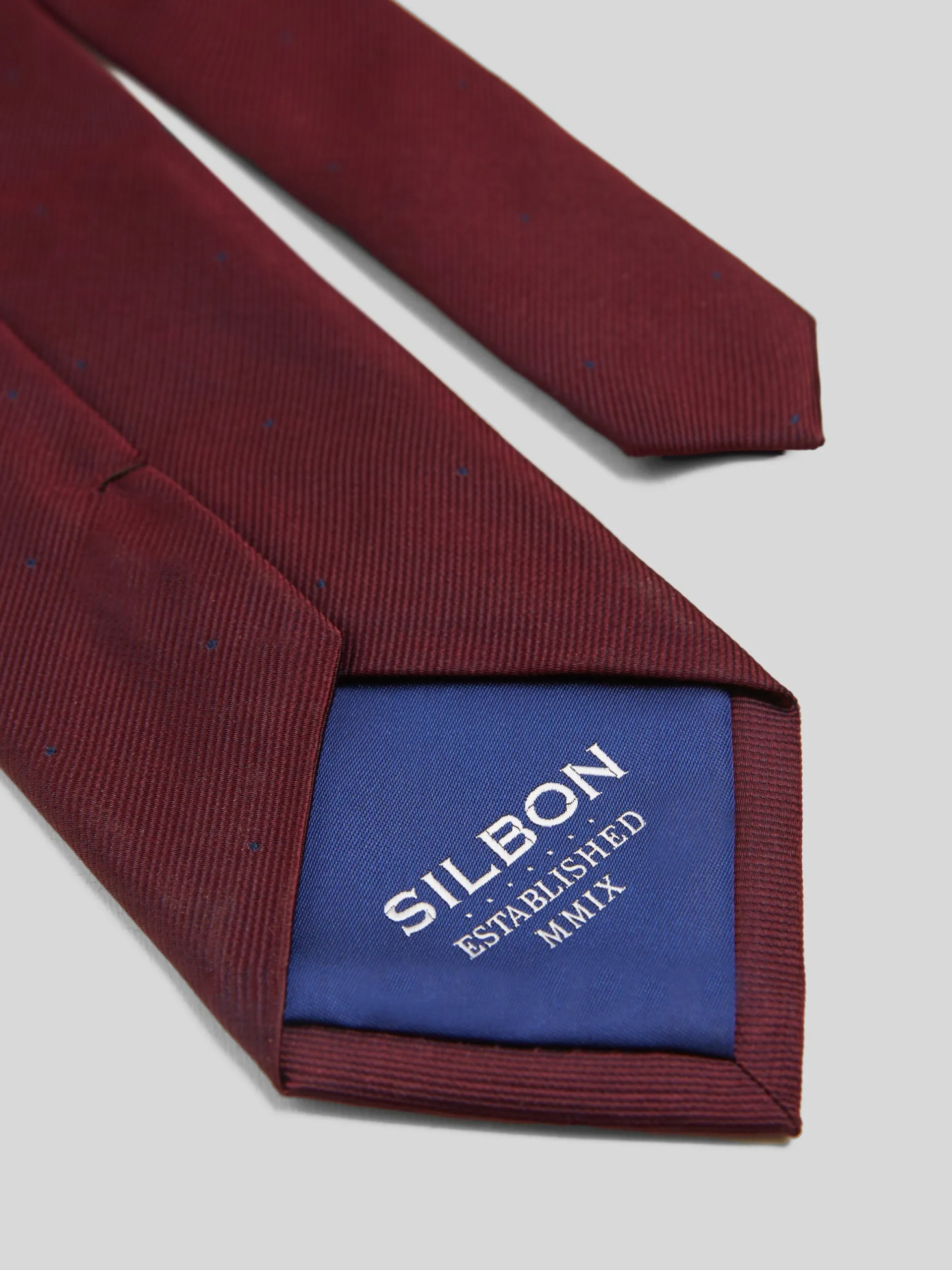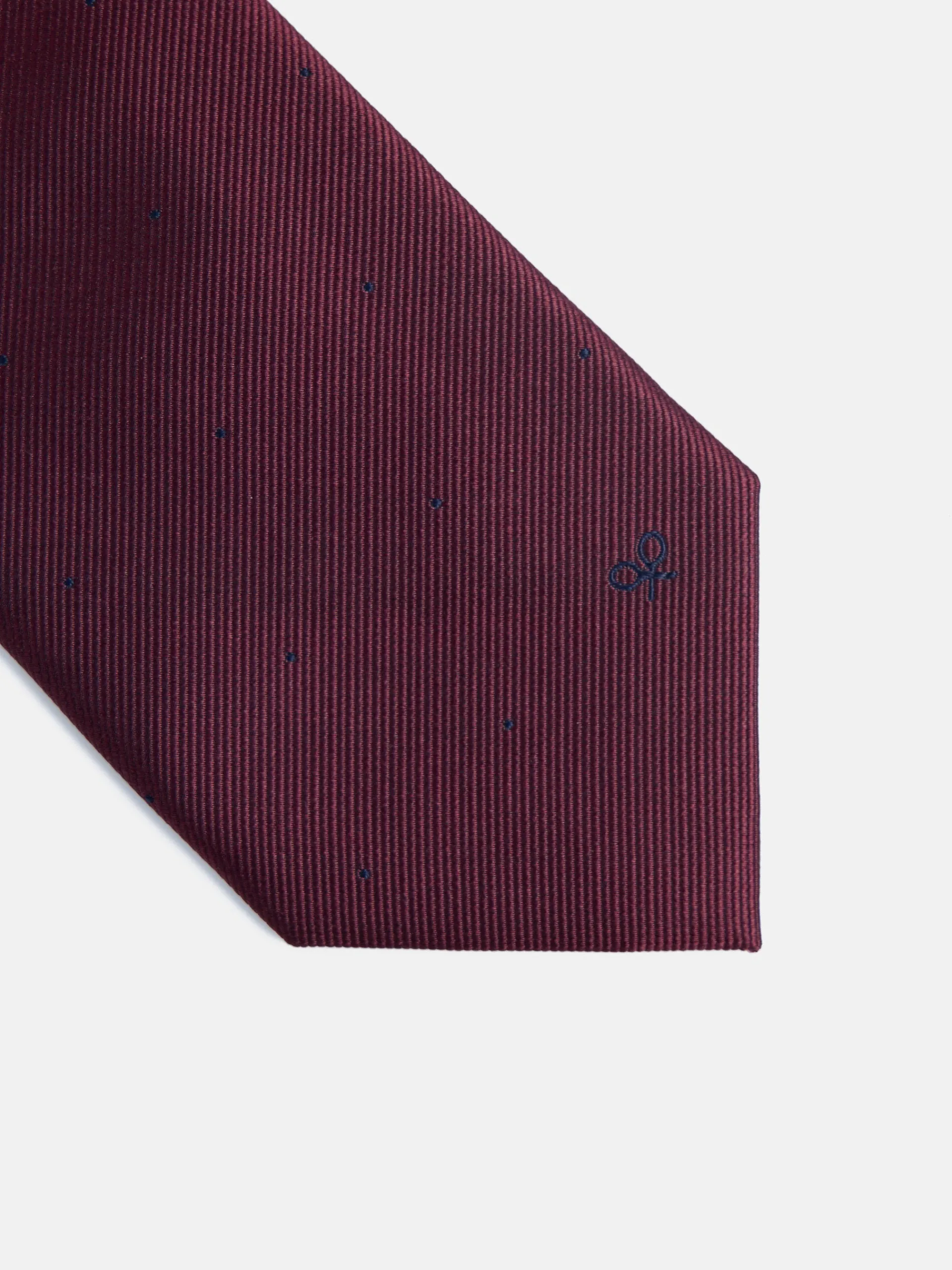Corbata de color burdeos confeccionada en seda con lunares y raquetas bordadas en azul marino. Presenta forro interior azul personalizado.