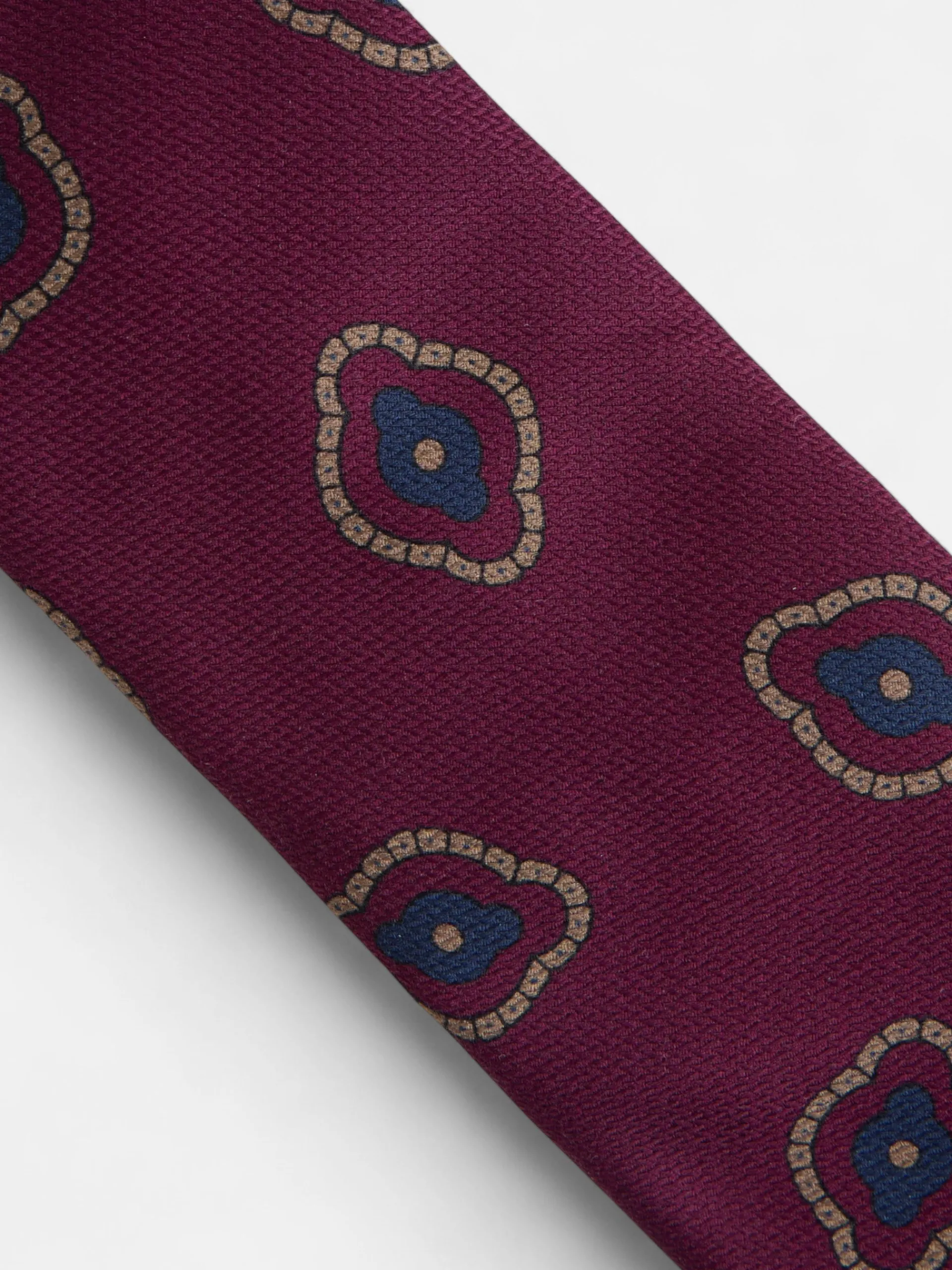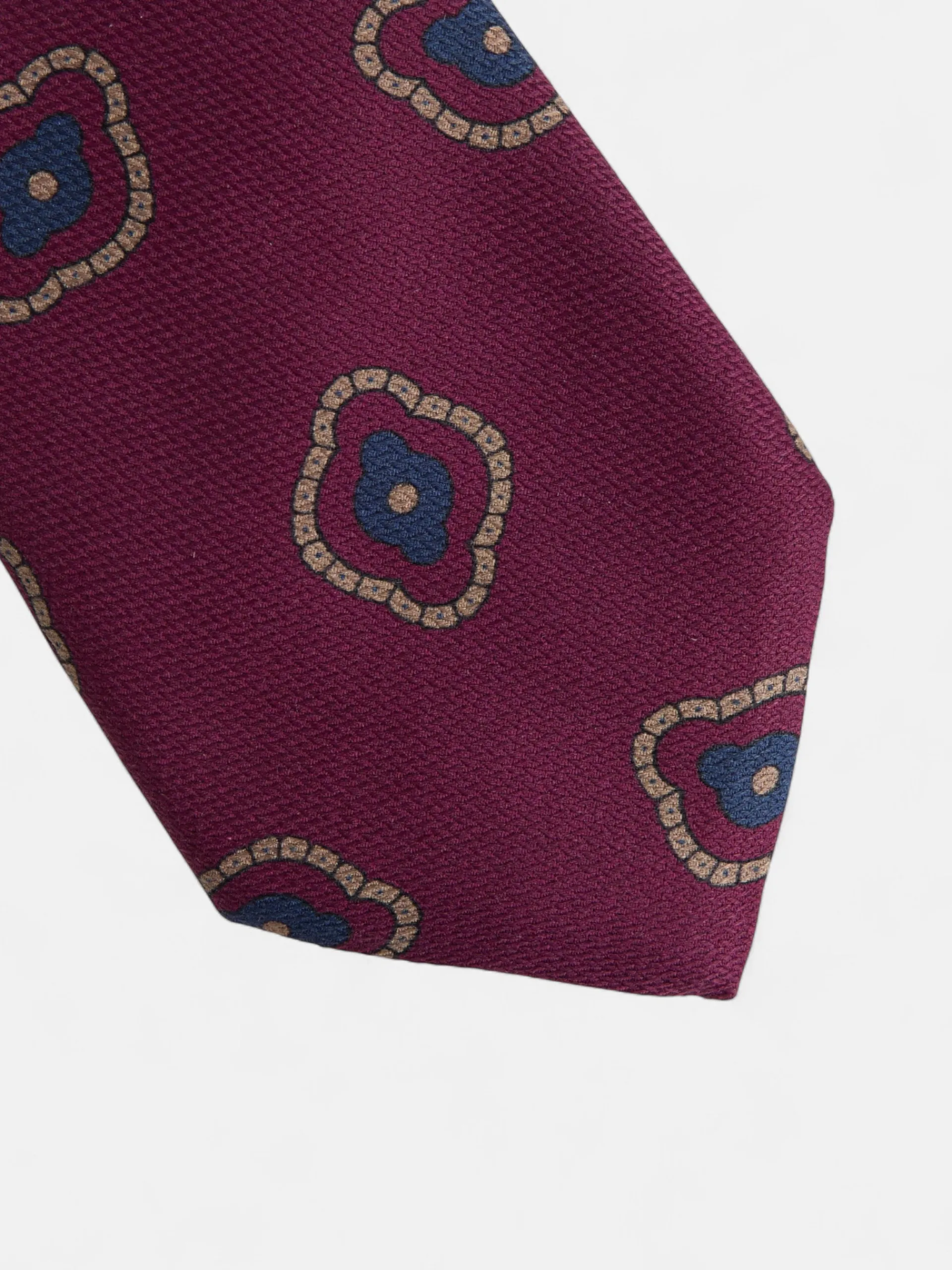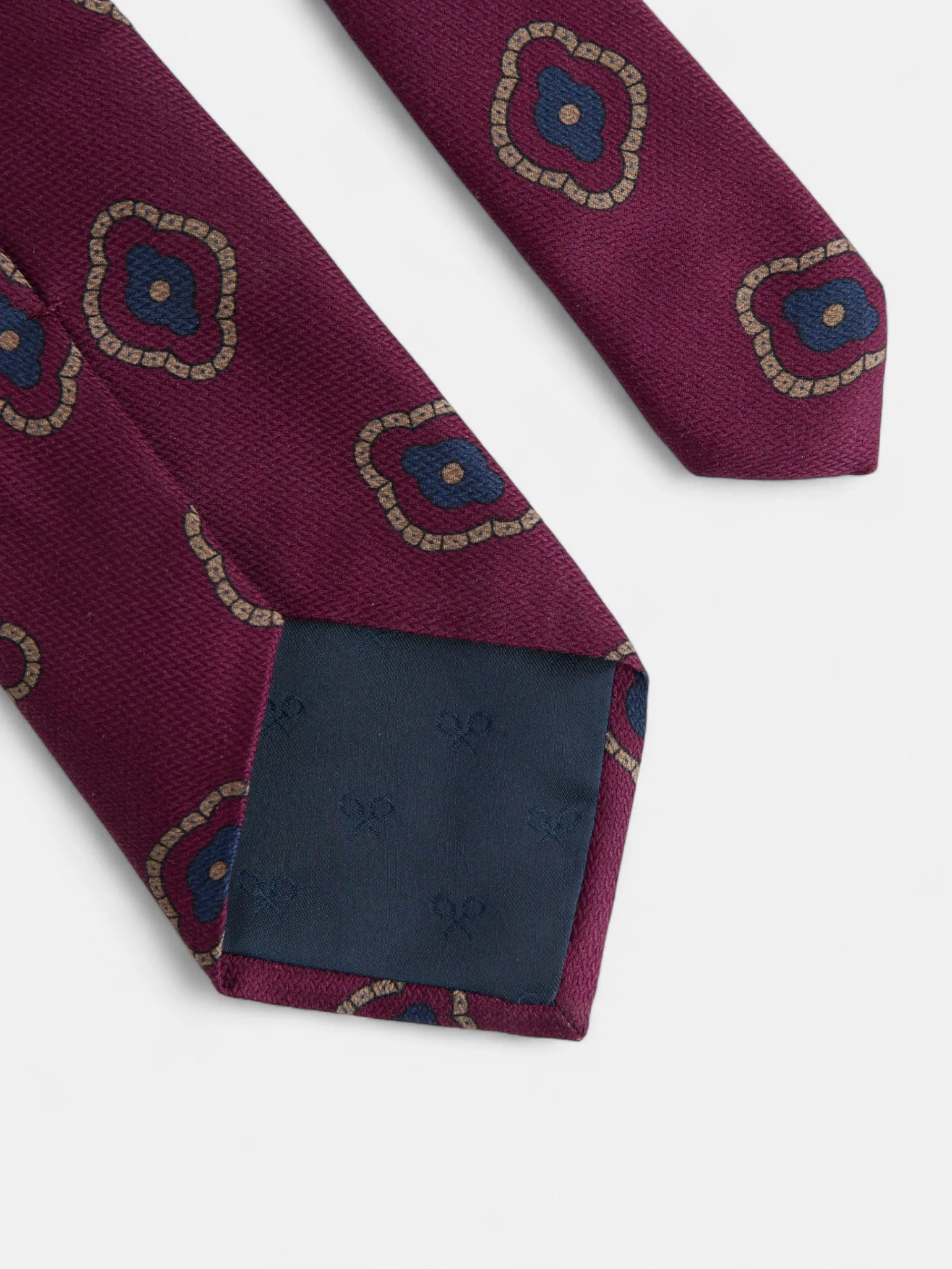 Corbata burdeos confeccionada en seda 100%. Presenta estampado geométrico, y tiene forro interior personalizado con multiraquetas. Fabricada en Italia.