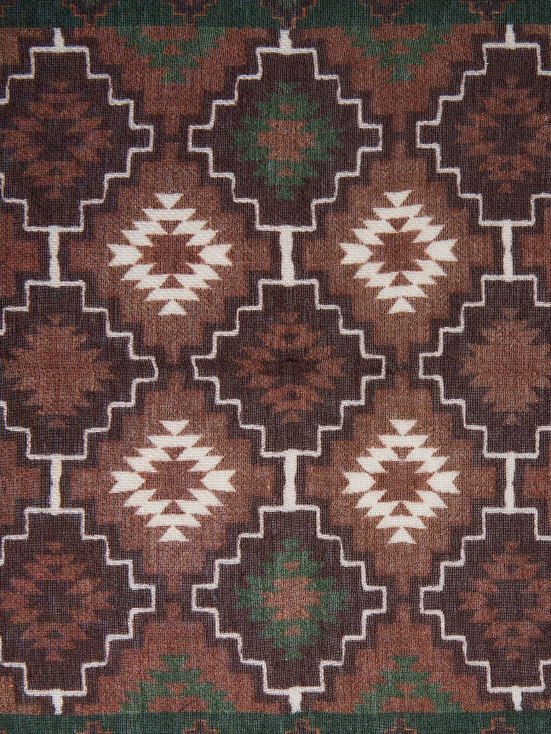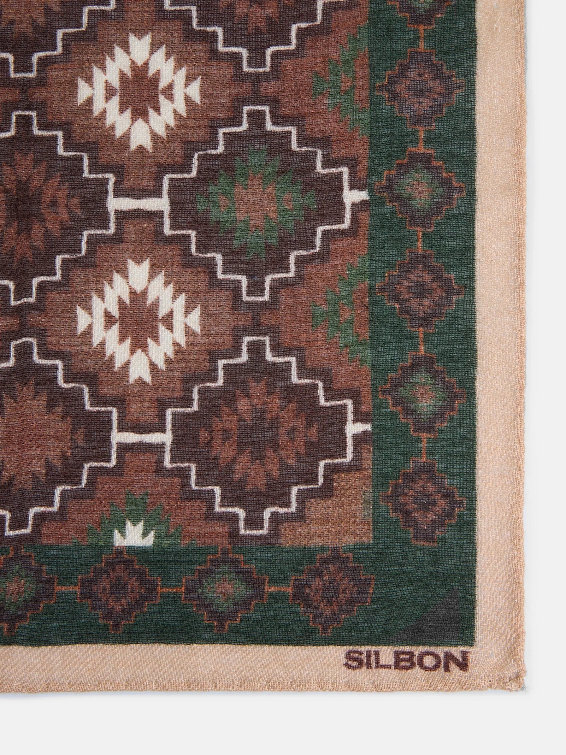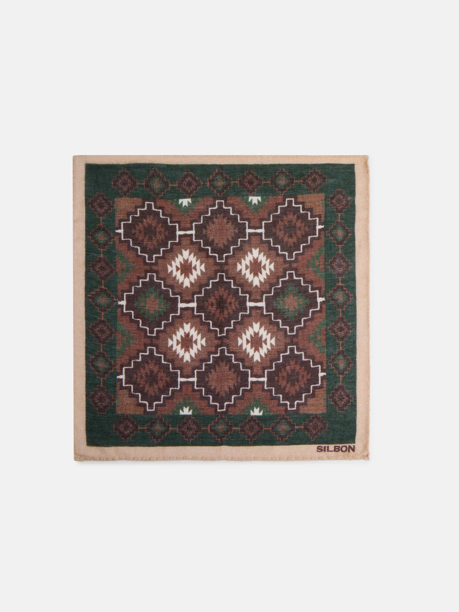 Pañuelo étnico confeccionado en mezcla de lana. Presenta estampado y letras en jacquard y detalle de perfil a contraste por el contorno. Fabricado en Italia.