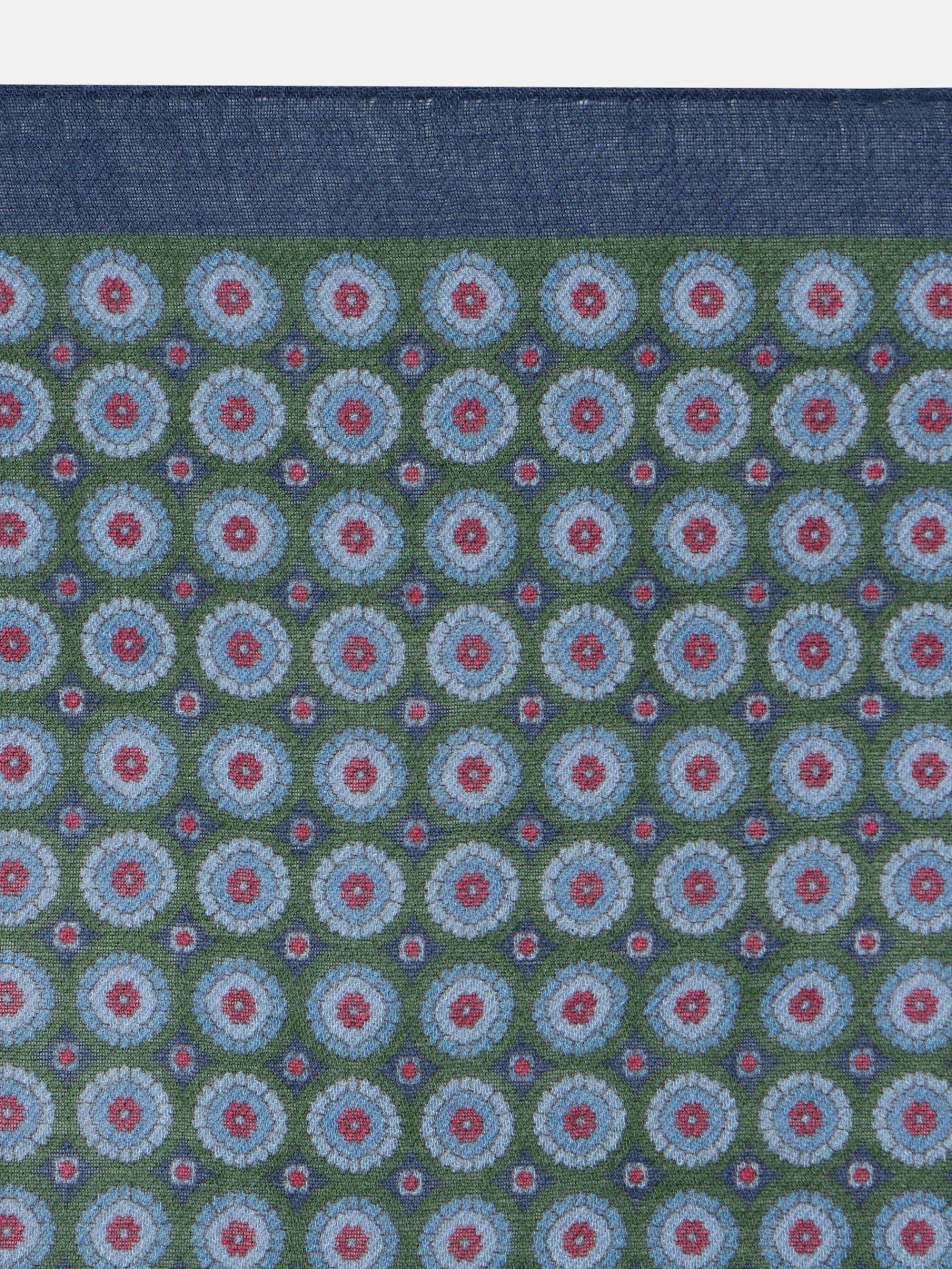 Pañuelo geometrico floral confeccionado en mezcla de lana. Presenta estampado étnico y letras Silbon en jacquard. Cuenta con detalle de perfil a contraste por el contorno. Fabricado en Italia.