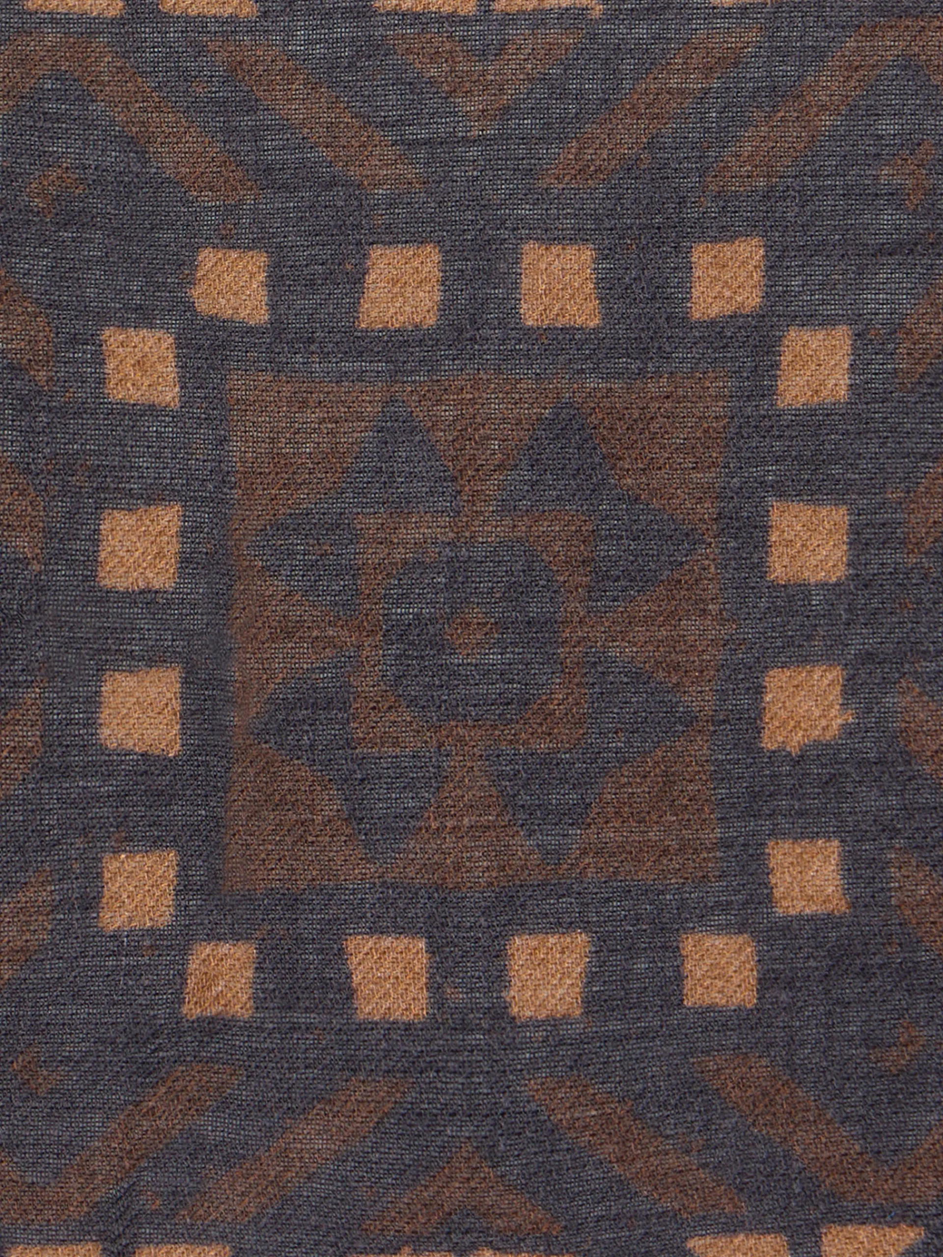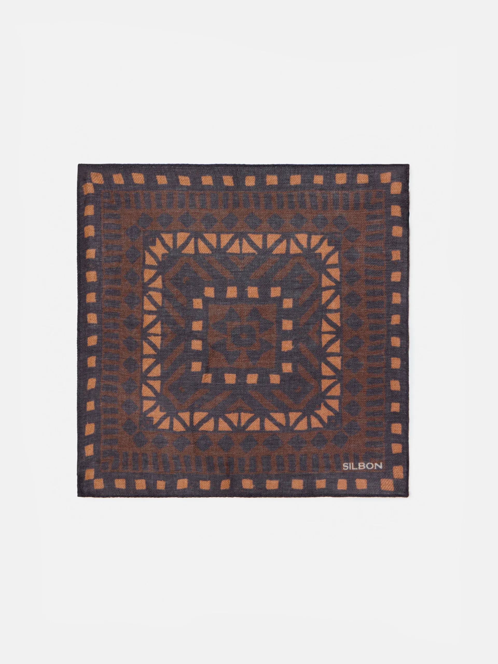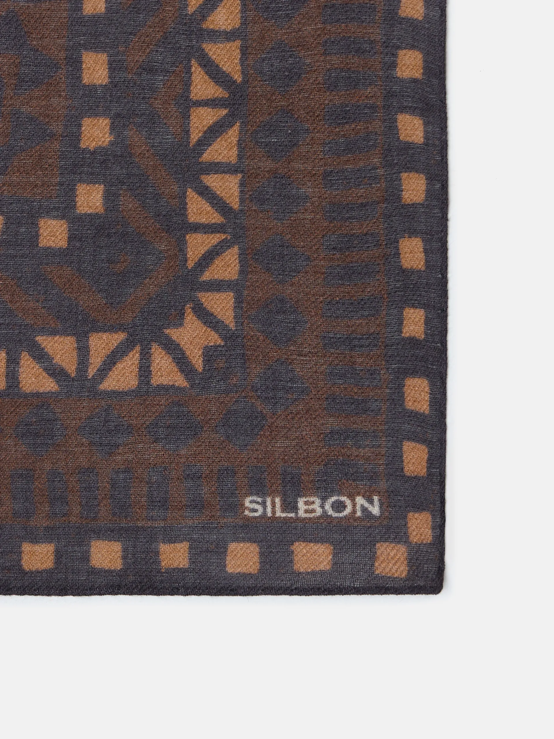 Pañuelo motivos étnicos confeccionado en mezcla de lana. Presenta estampado étnico y letras Silbon en jacquard. Cuenta con detalle de perfil a contraste por el contorno. Fabricado en Italia.