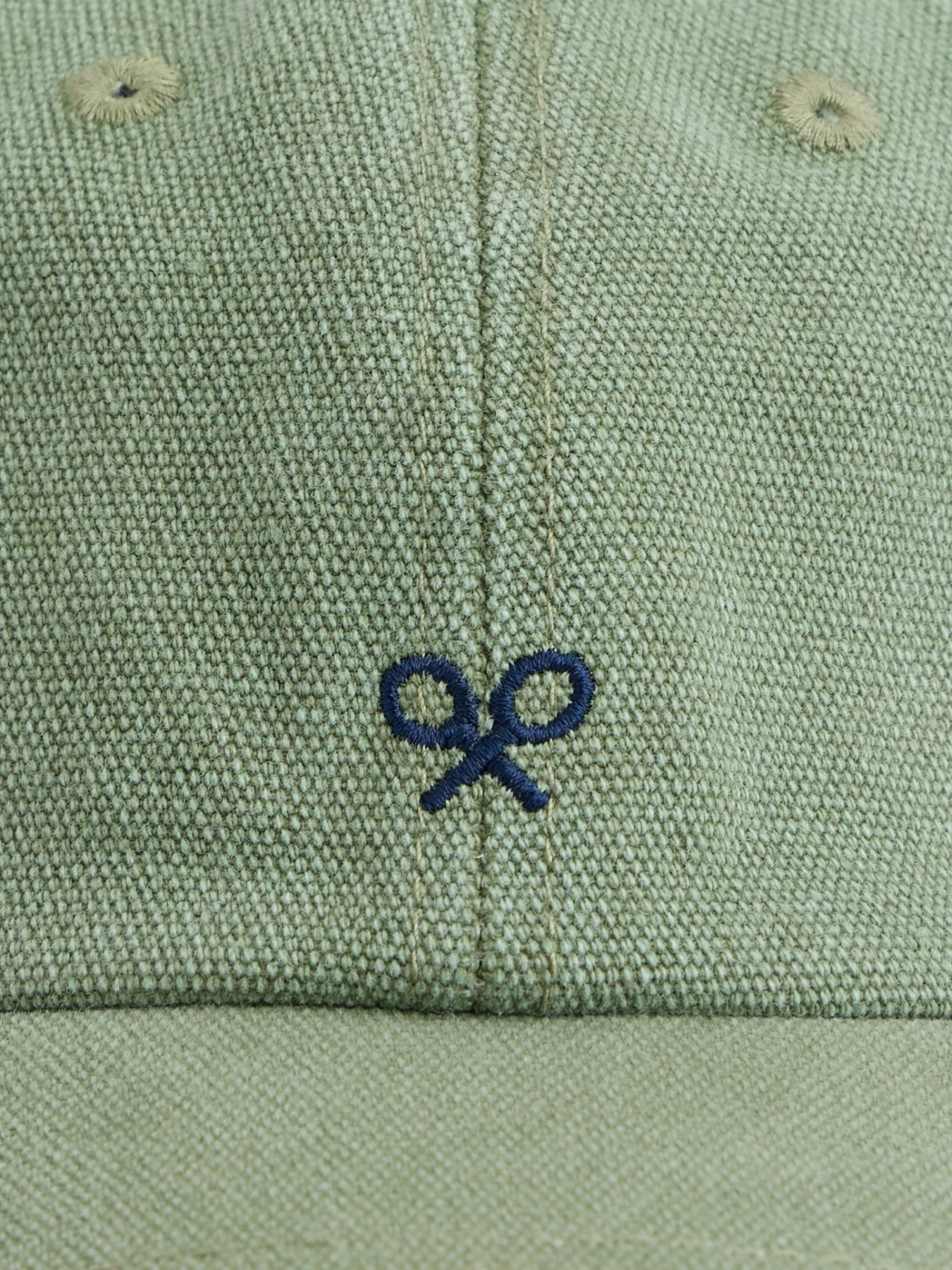Gorra verde confeccionada en 100% algodón. Presenta detalle de raquetas bordadas a contraste en color azul marino. Cuenta con ajustable y etiqueta personalizada trasera.
