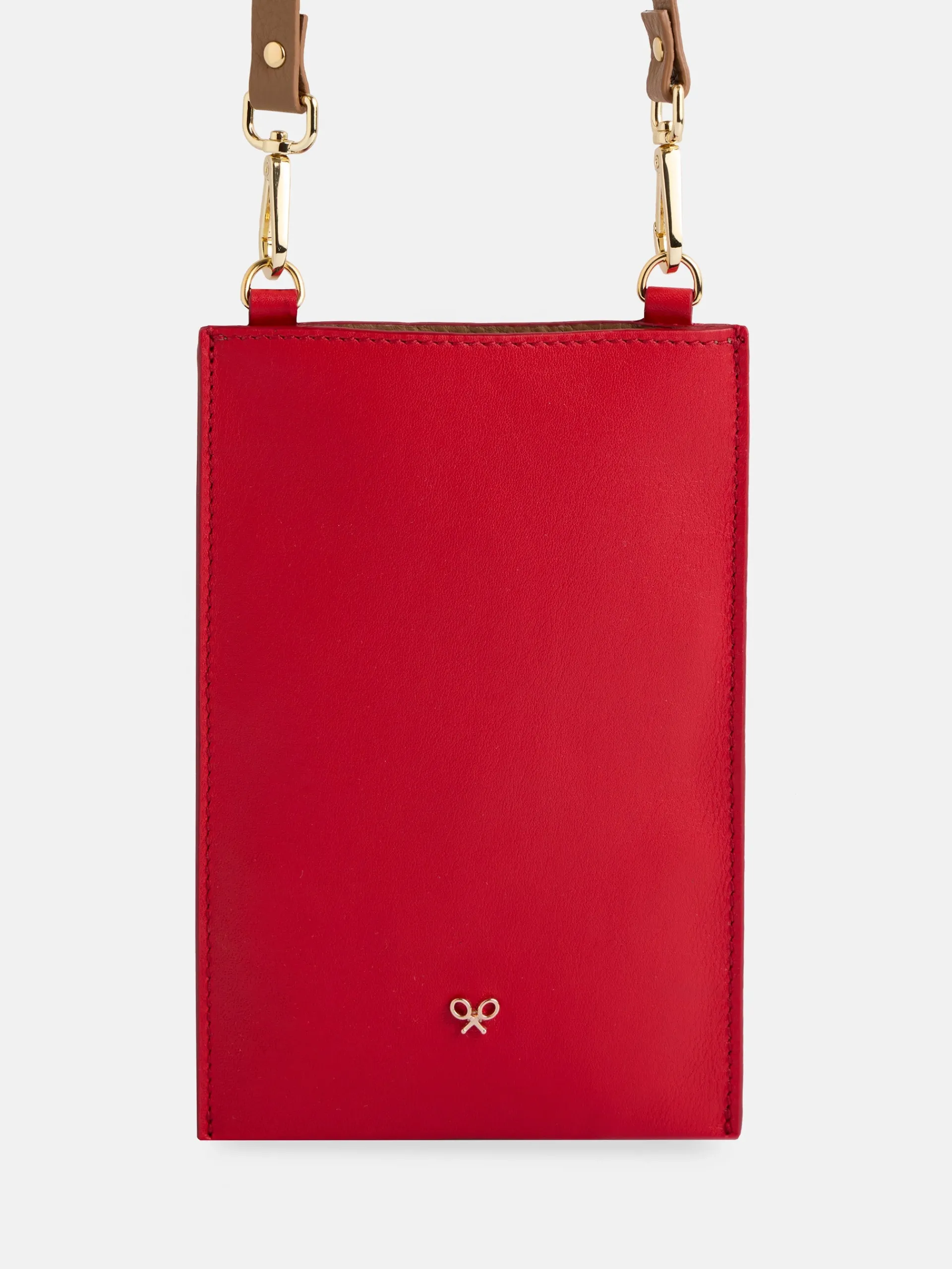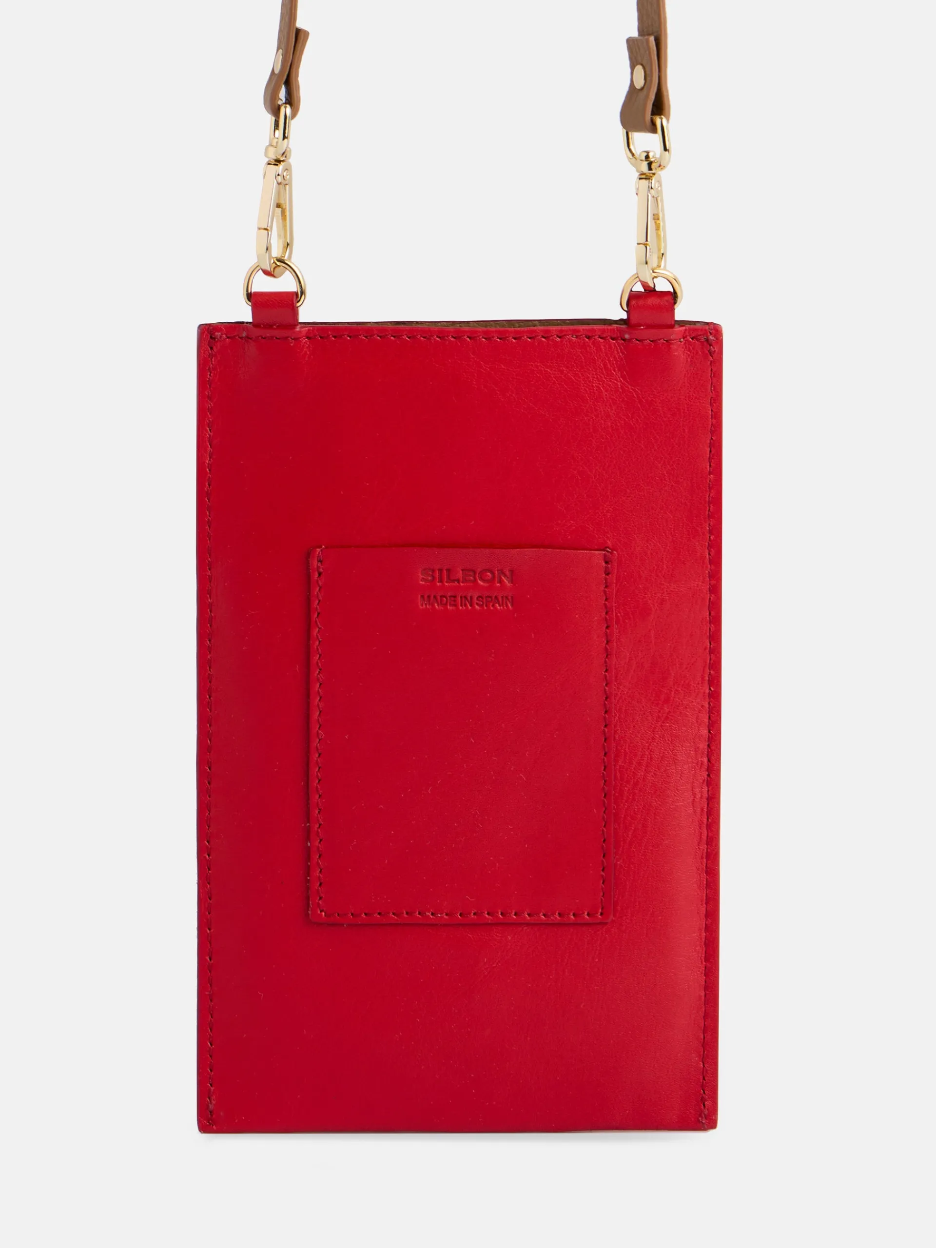 Portamóvil confeccionado en 100% piel con bolsillo al tono. Presenta asa larga regulable y removible con mosquetones. Personalizada con remache mini raqueta. Fabricado en España.