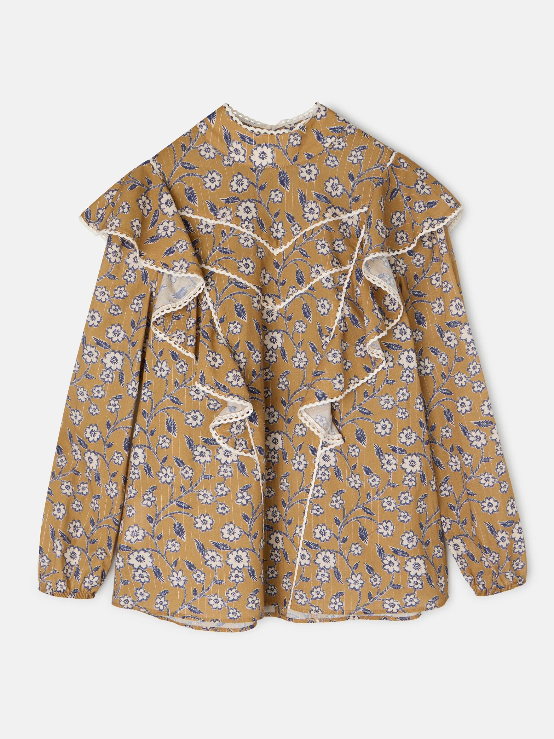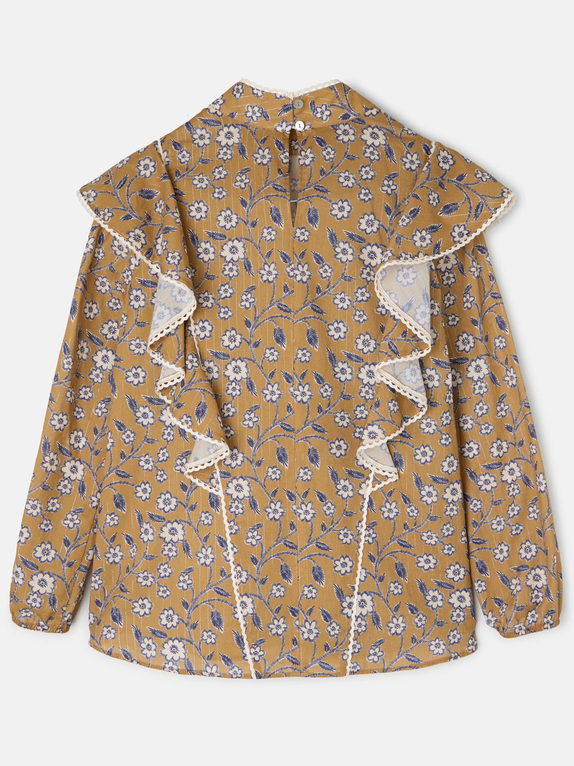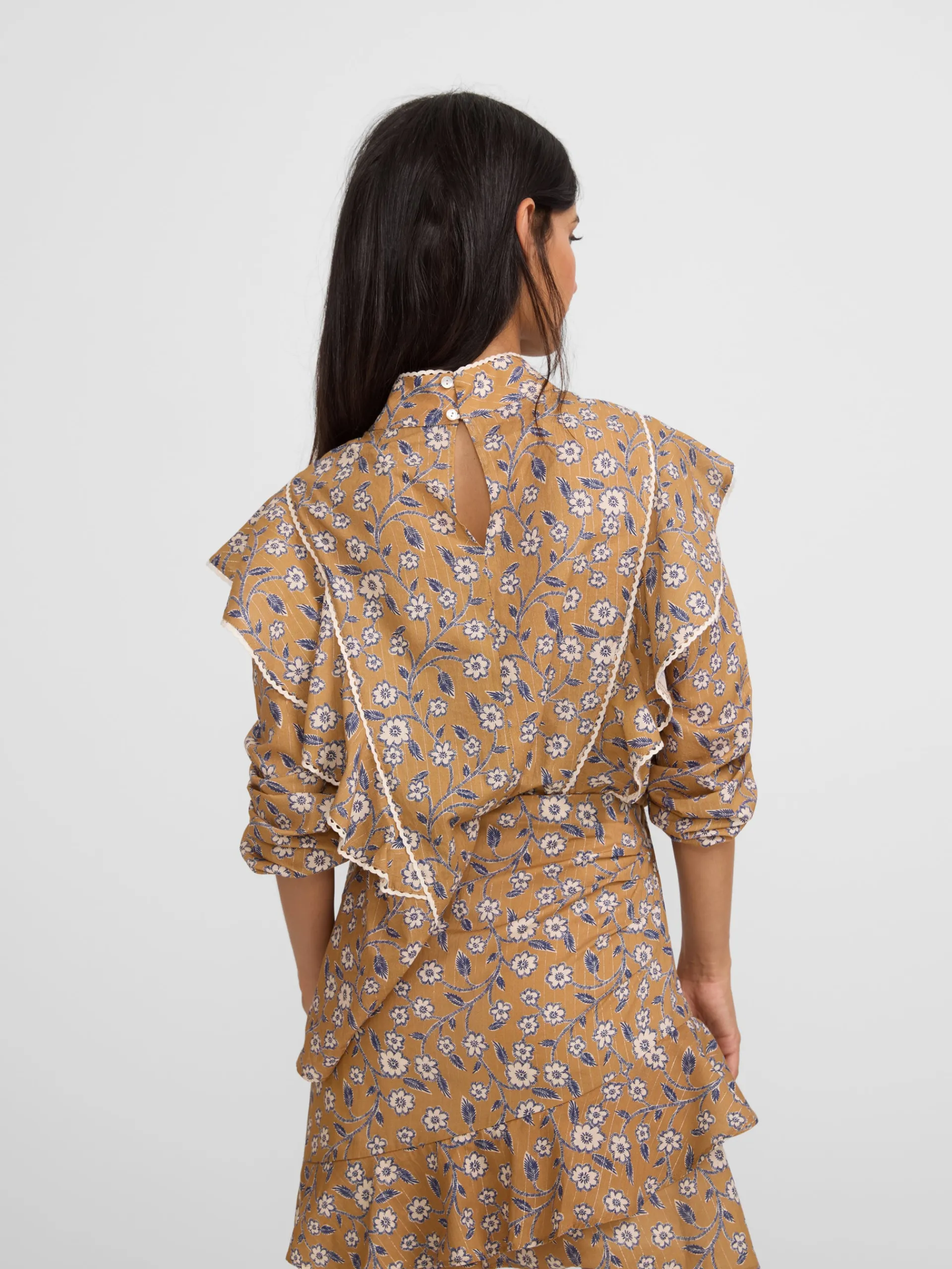 Blusa fluida con estampado floral en tonos camel y marino. Los volantes en el frontal y la espalda aportan movimiento y un toque femenino, mientras que la manga abullonada con puño elástico ofrece comodidad y estilo. El detalle de blonda festoneada en color crudo añade un acabado delicado y sofisticado. Fabricada en España.