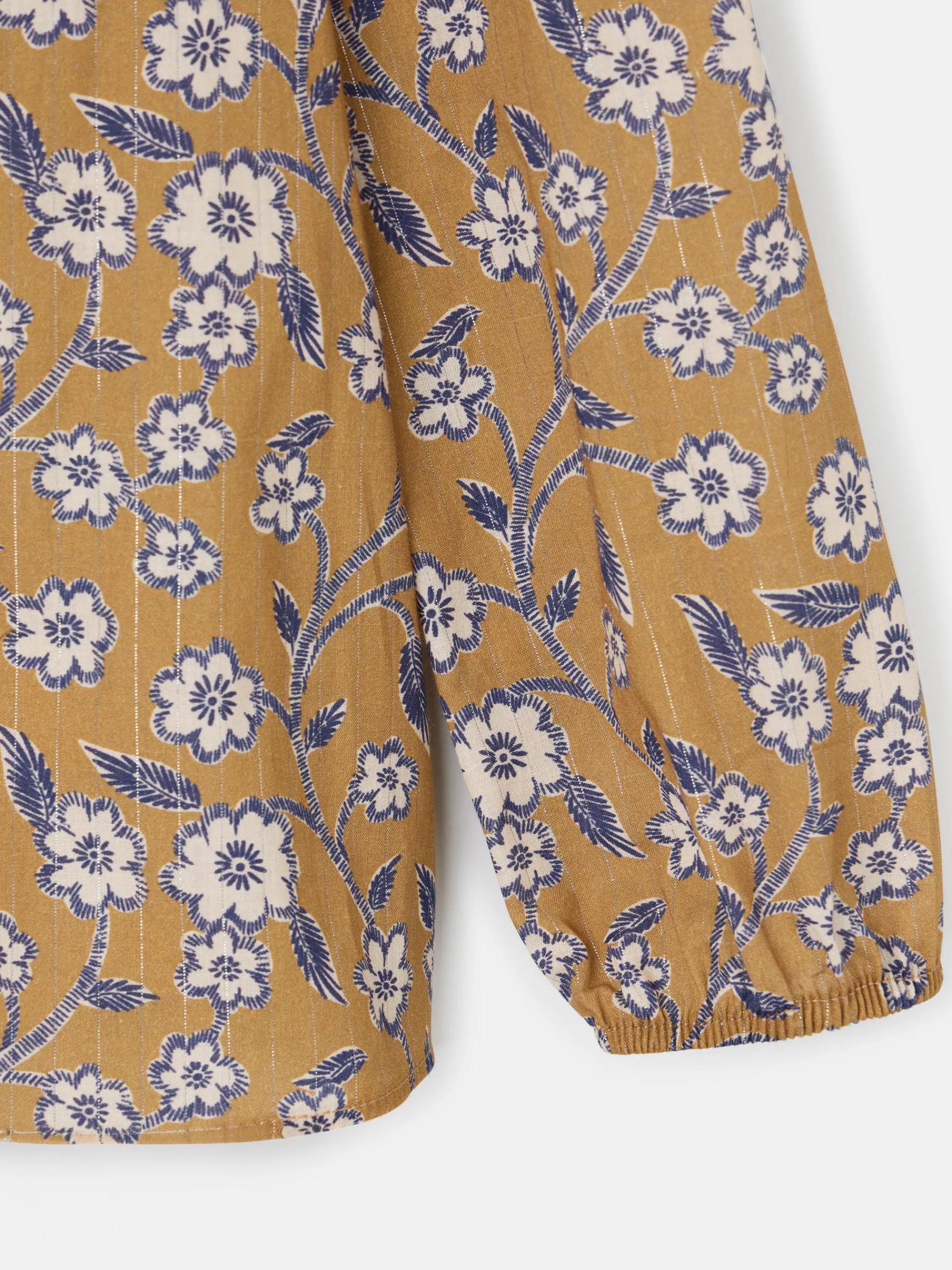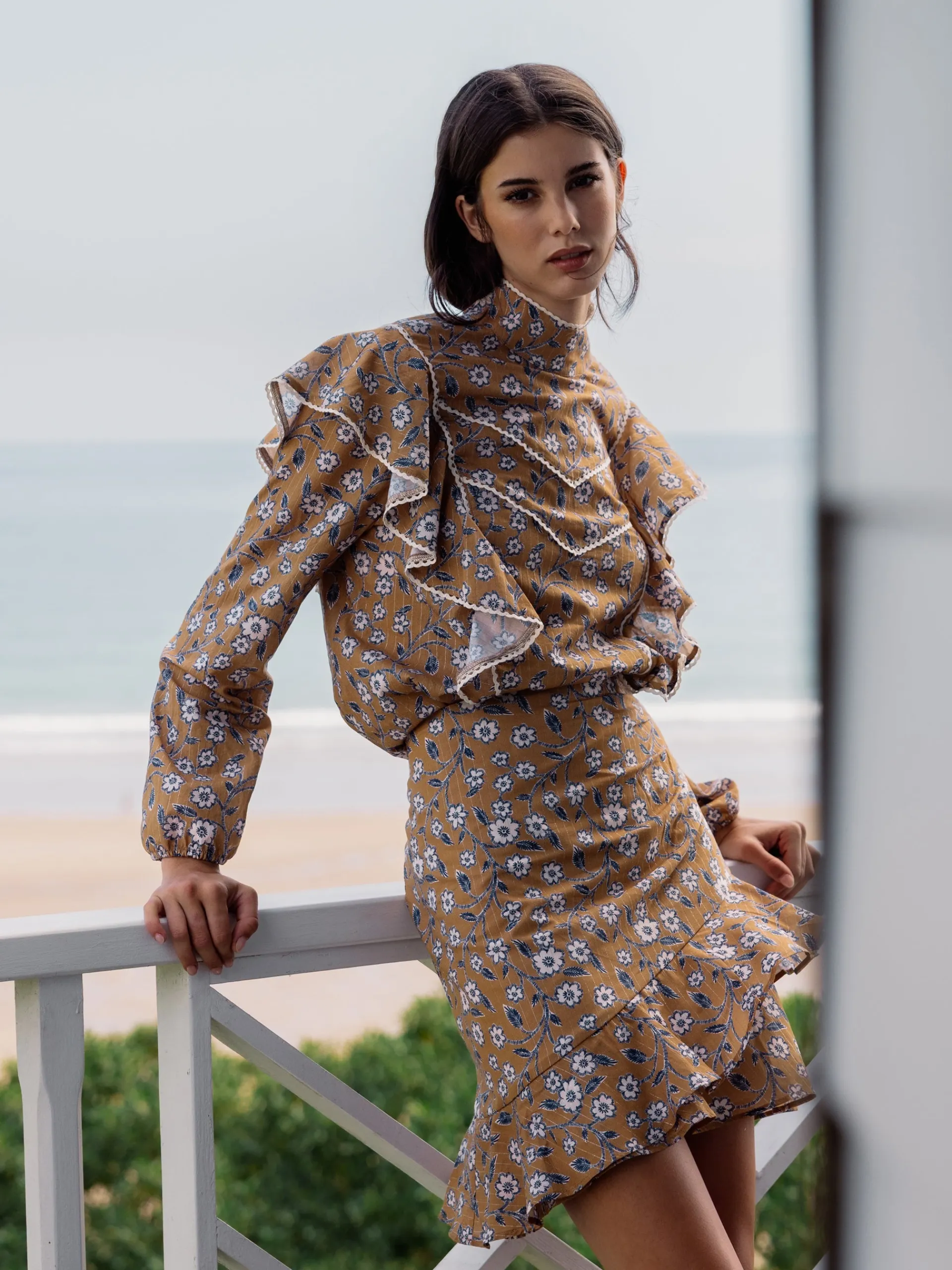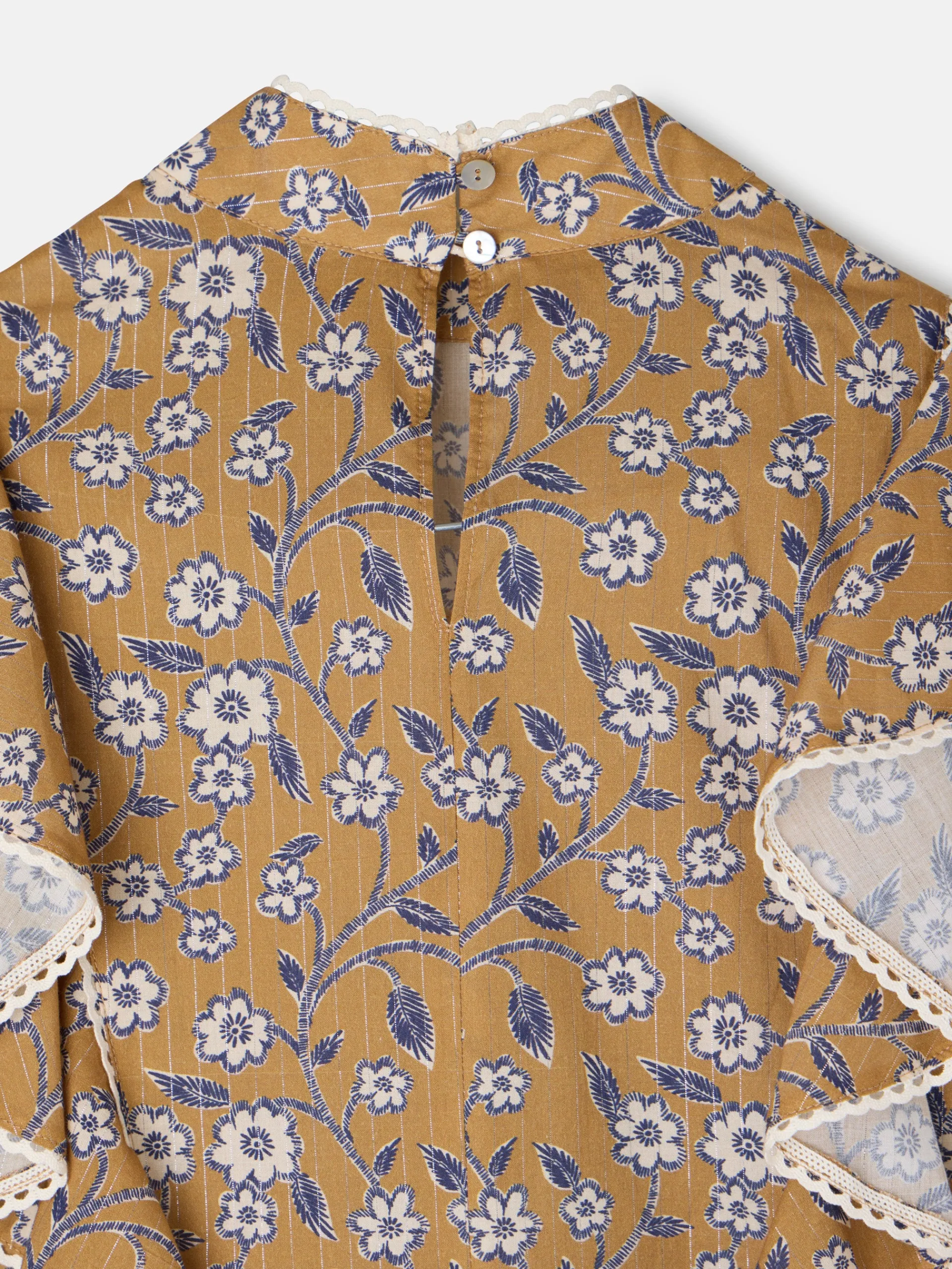 Blusa fluida con estampado floral en tonos camel y marino. Los volantes en el frontal y la espalda aportan movimiento y un toque femenino, mientras que la manga abullonada con puño elástico ofrece comodidad y estilo. El detalle de blonda festoneada en color crudo añade un acabado delicado y sofisticado. Fabricada en España.