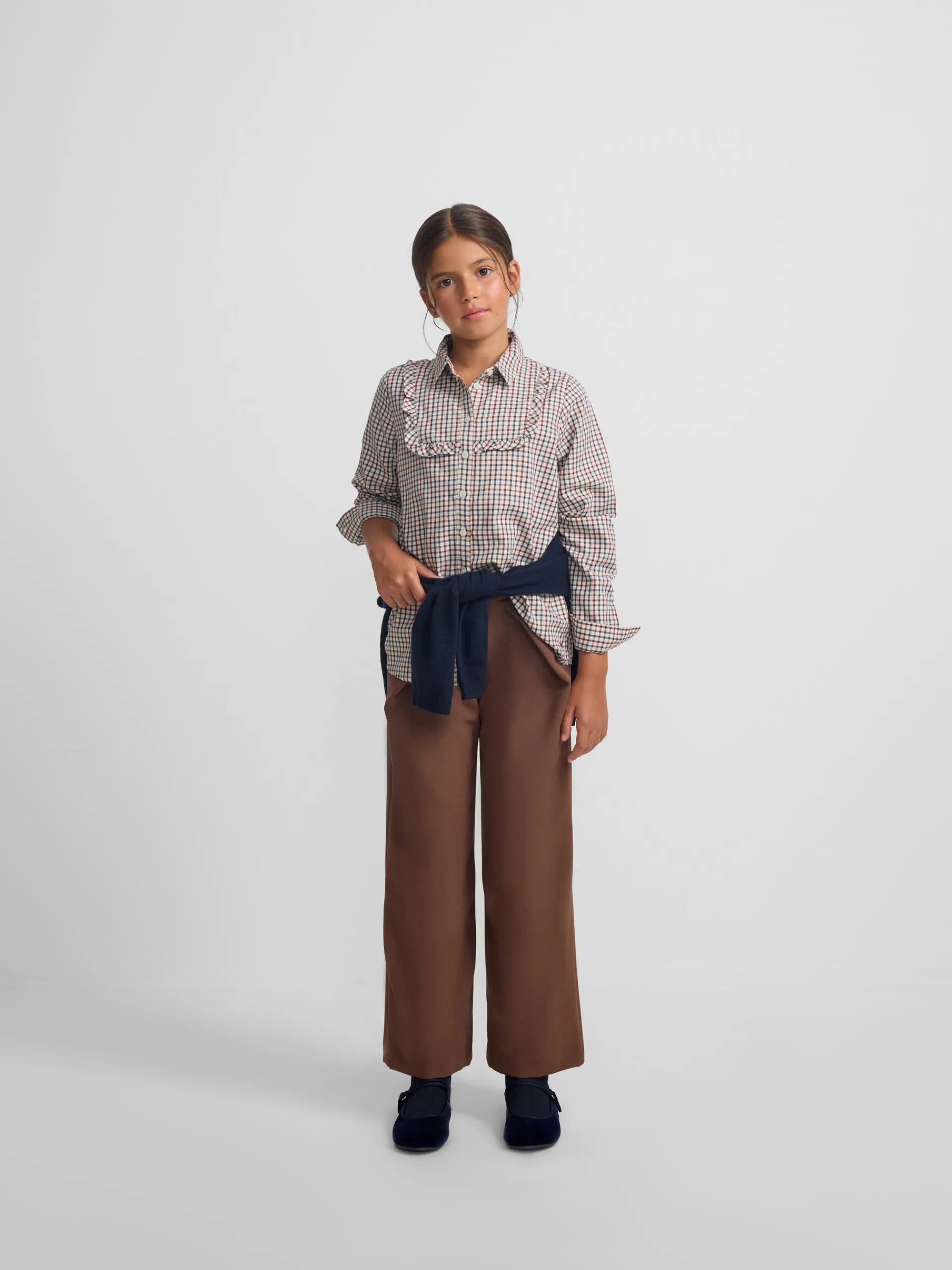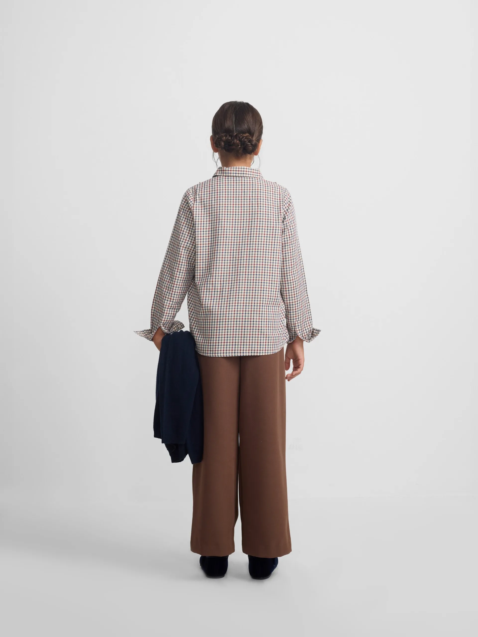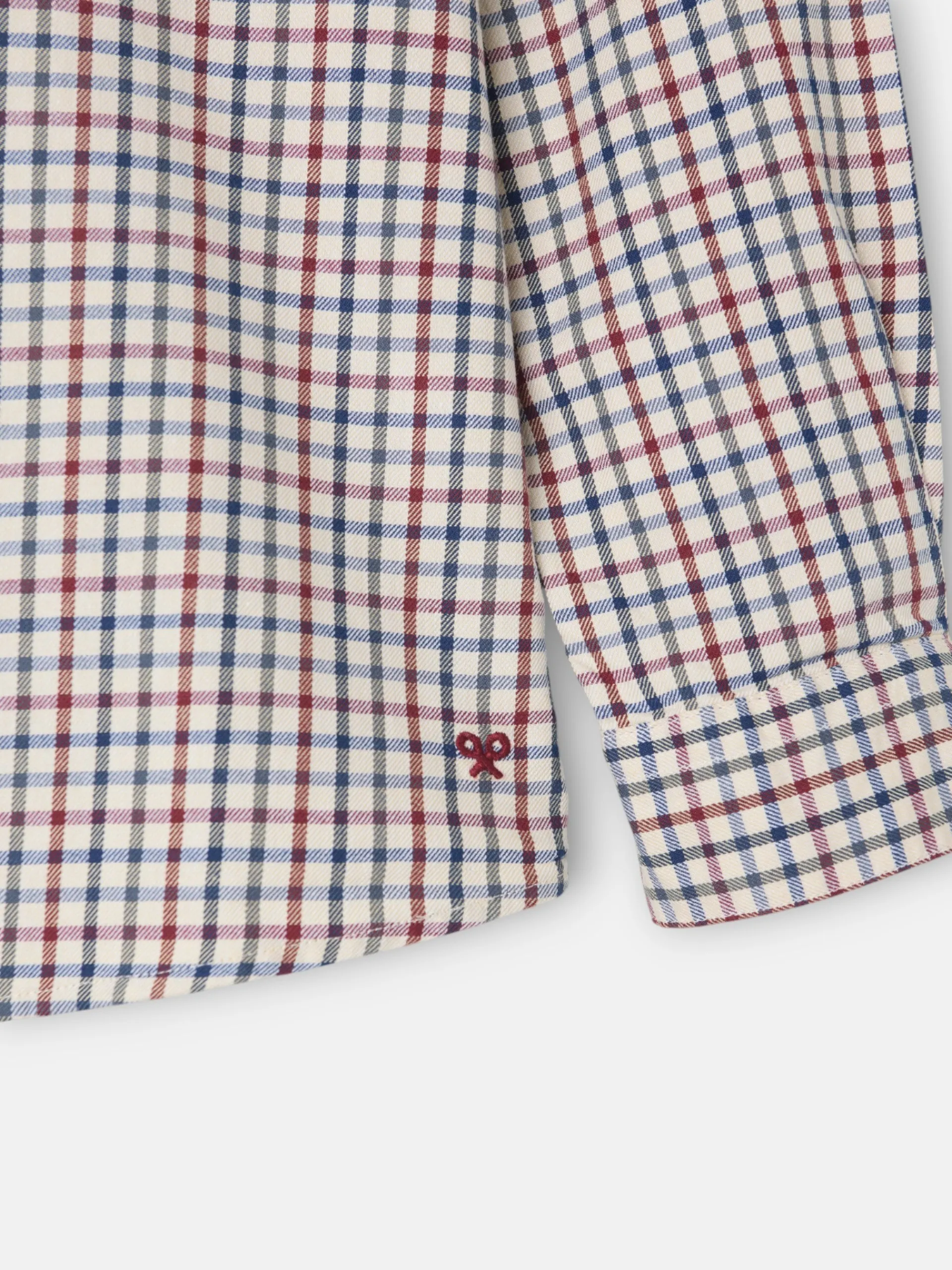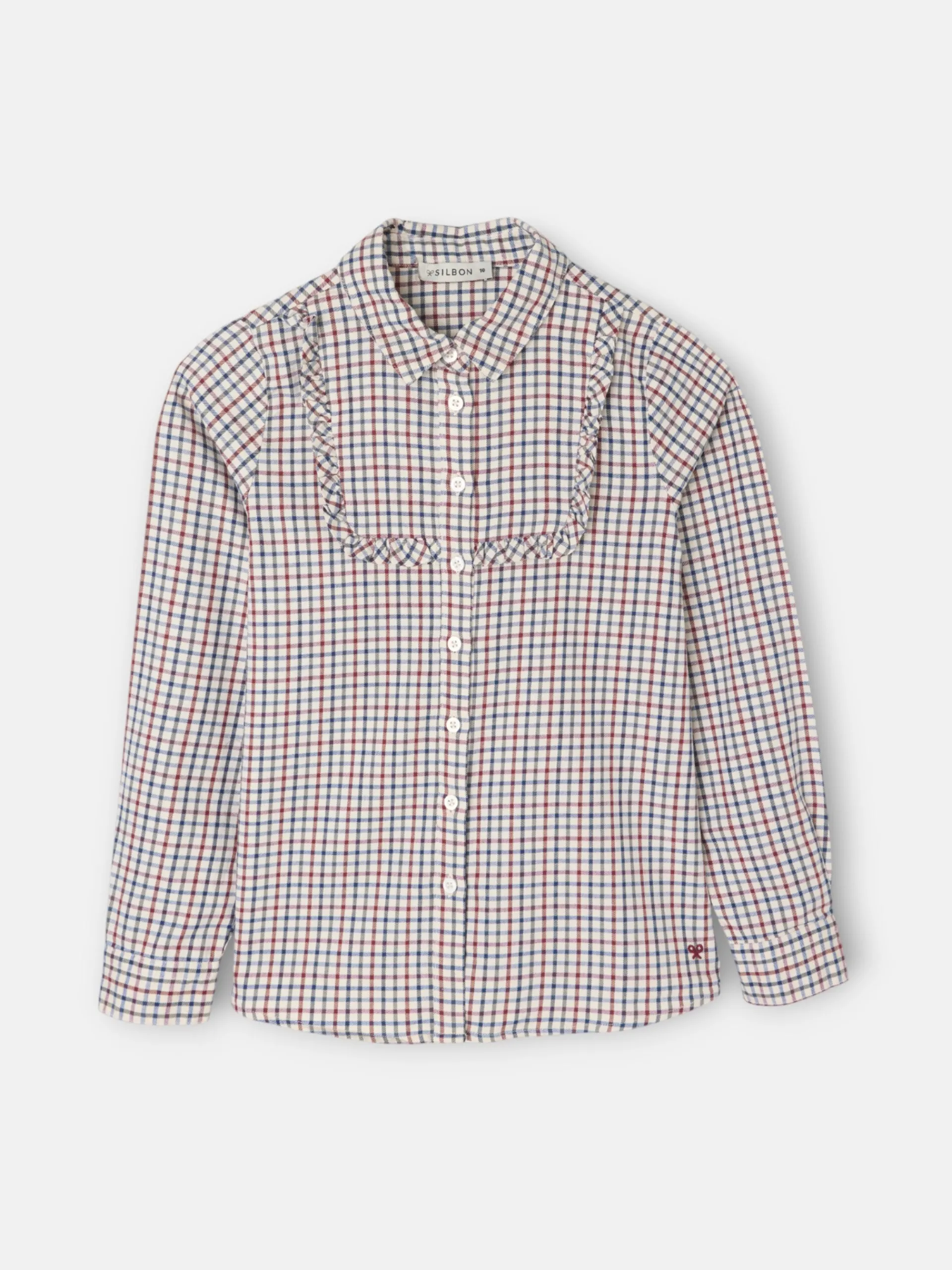 Camisa de girl de cuadros en tonos azul y burdeos confeccionada en 100% algodón con corte Regular Fit. Cuenta con cuello camisero clásico con cierre de tapeta con botones ocultos. Presenta detalle de volante en delantero y raquetas bordadas a contraste en color burdeos. Tiene la manga recta con puño camisero con botones. Fabricada en Portugal.